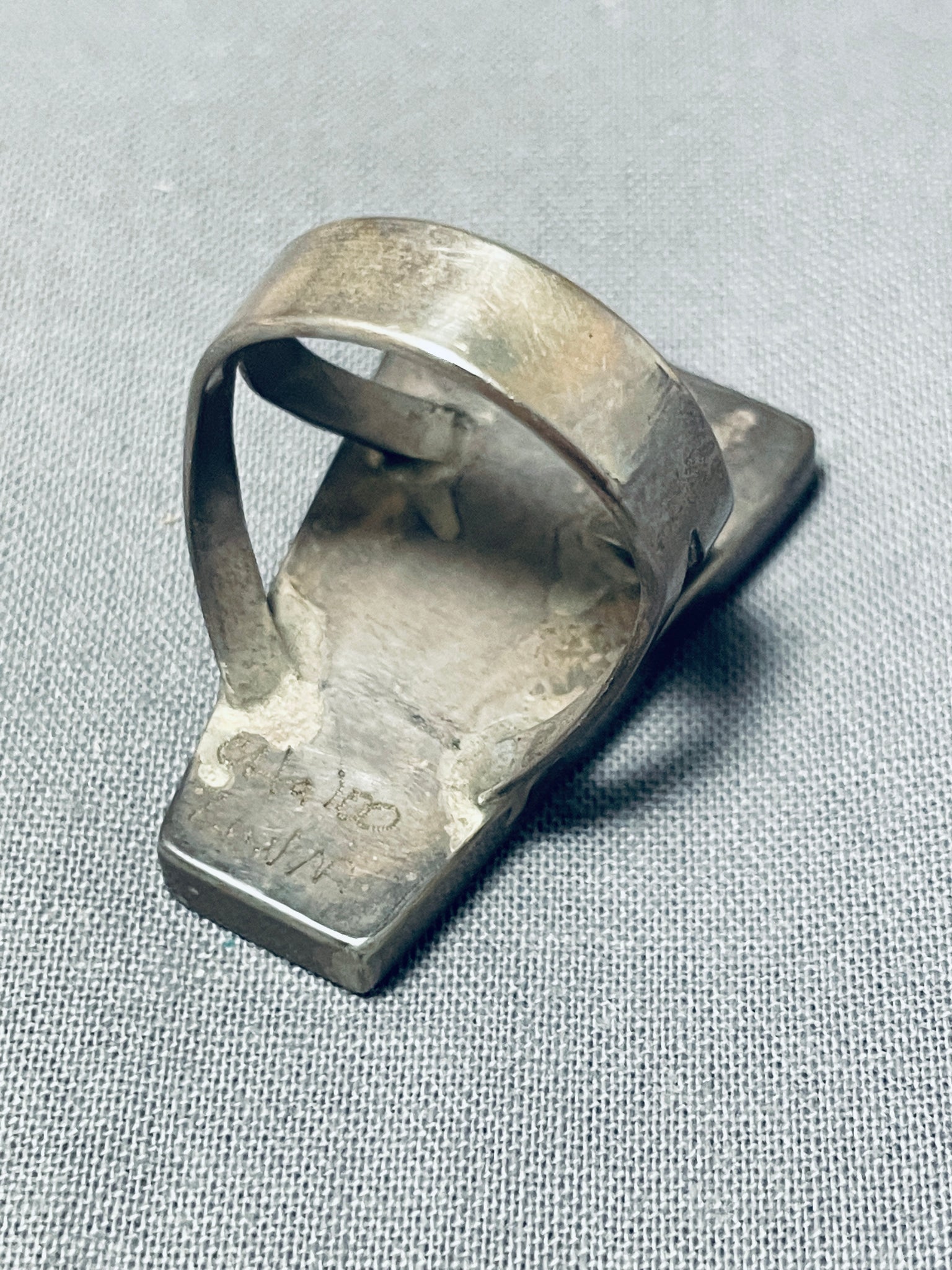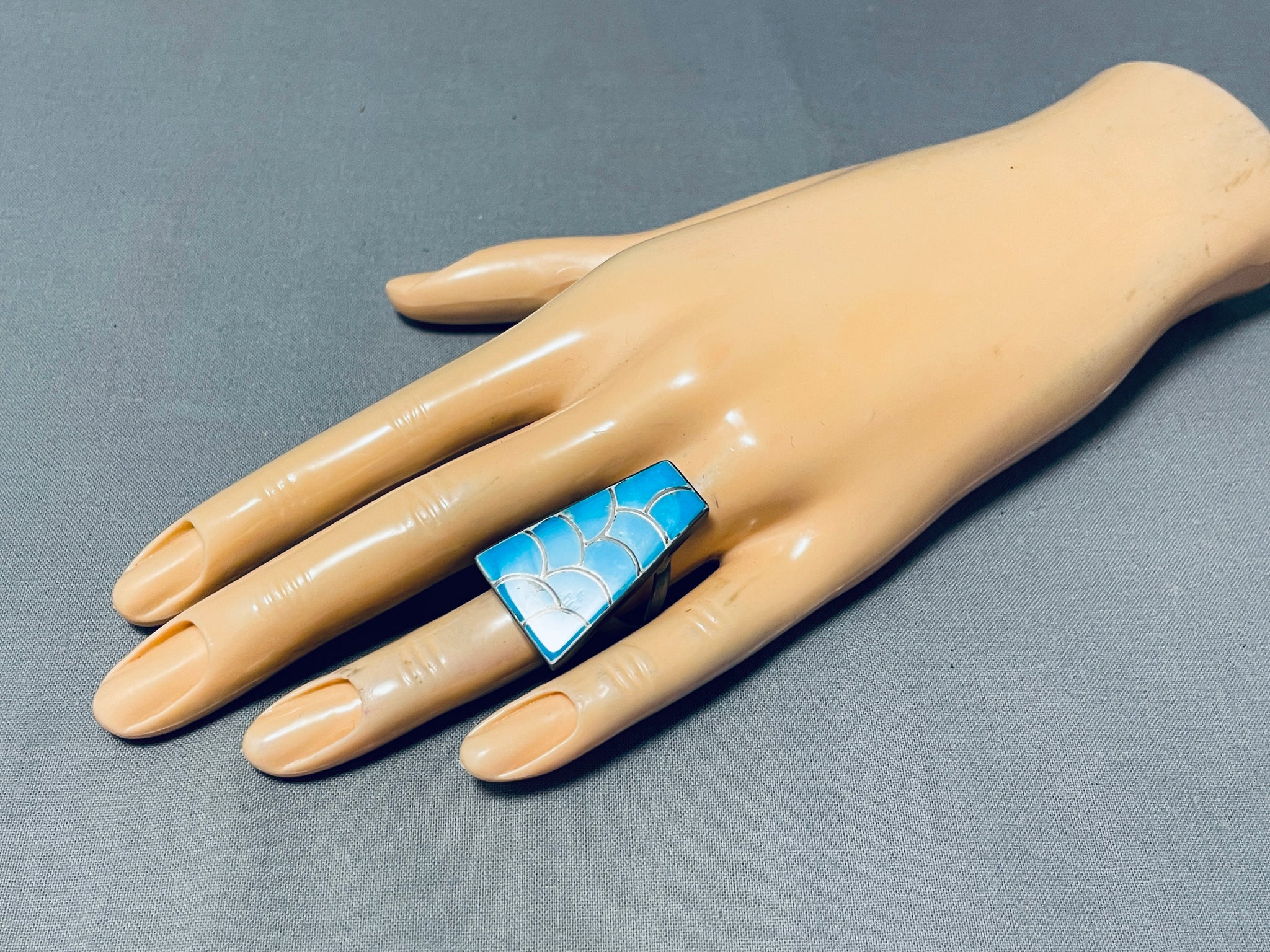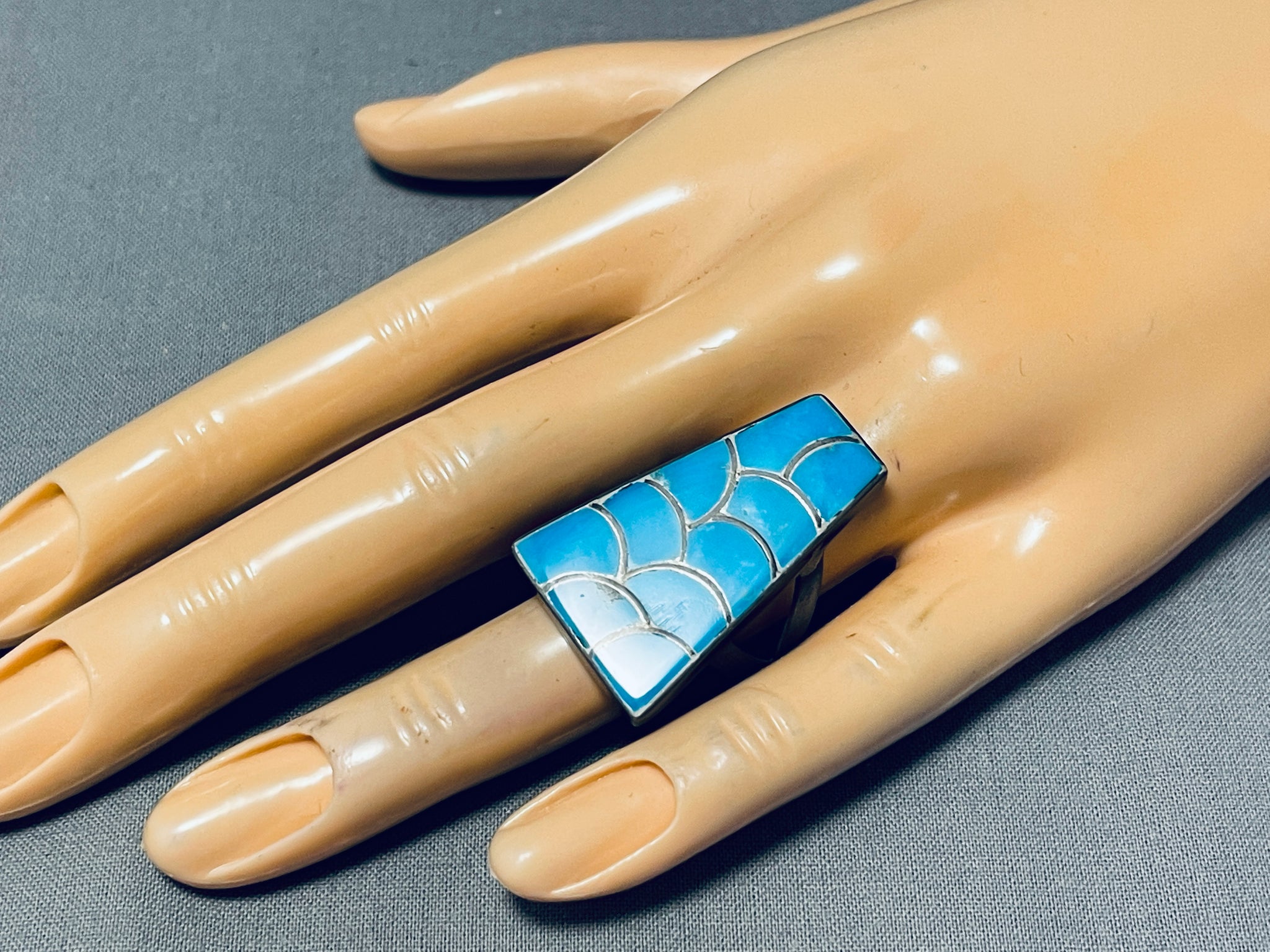 Fascinating Vintage Native American Zuni Signed Inlay Kingman Turquoise Sterling Silver Ring