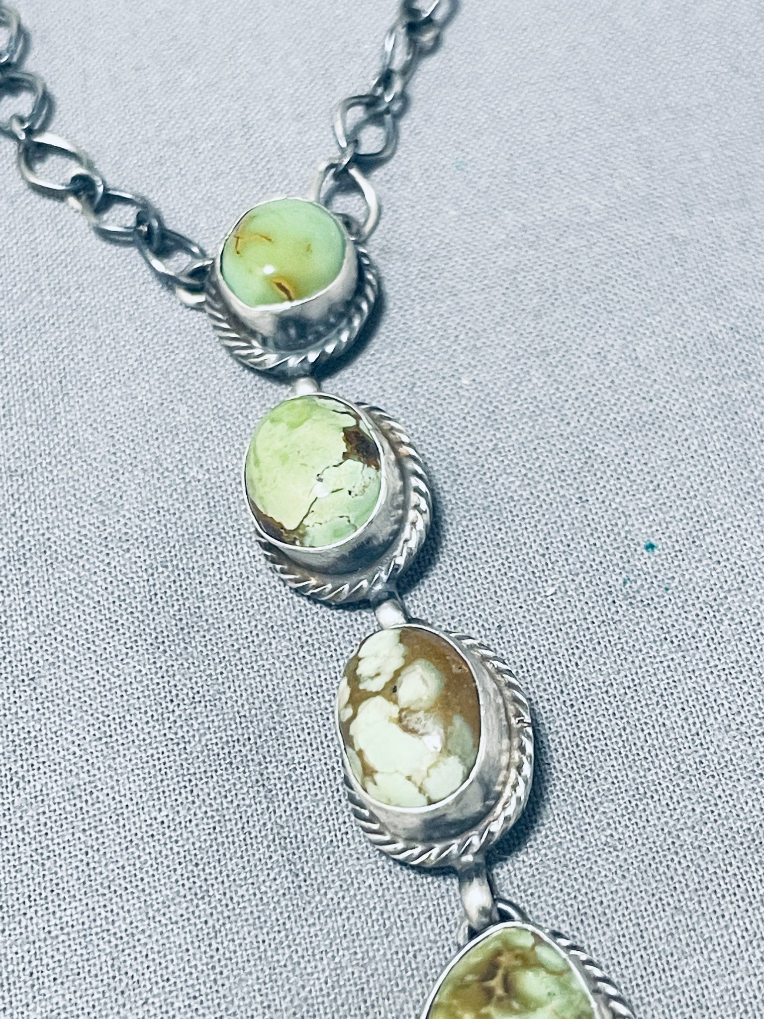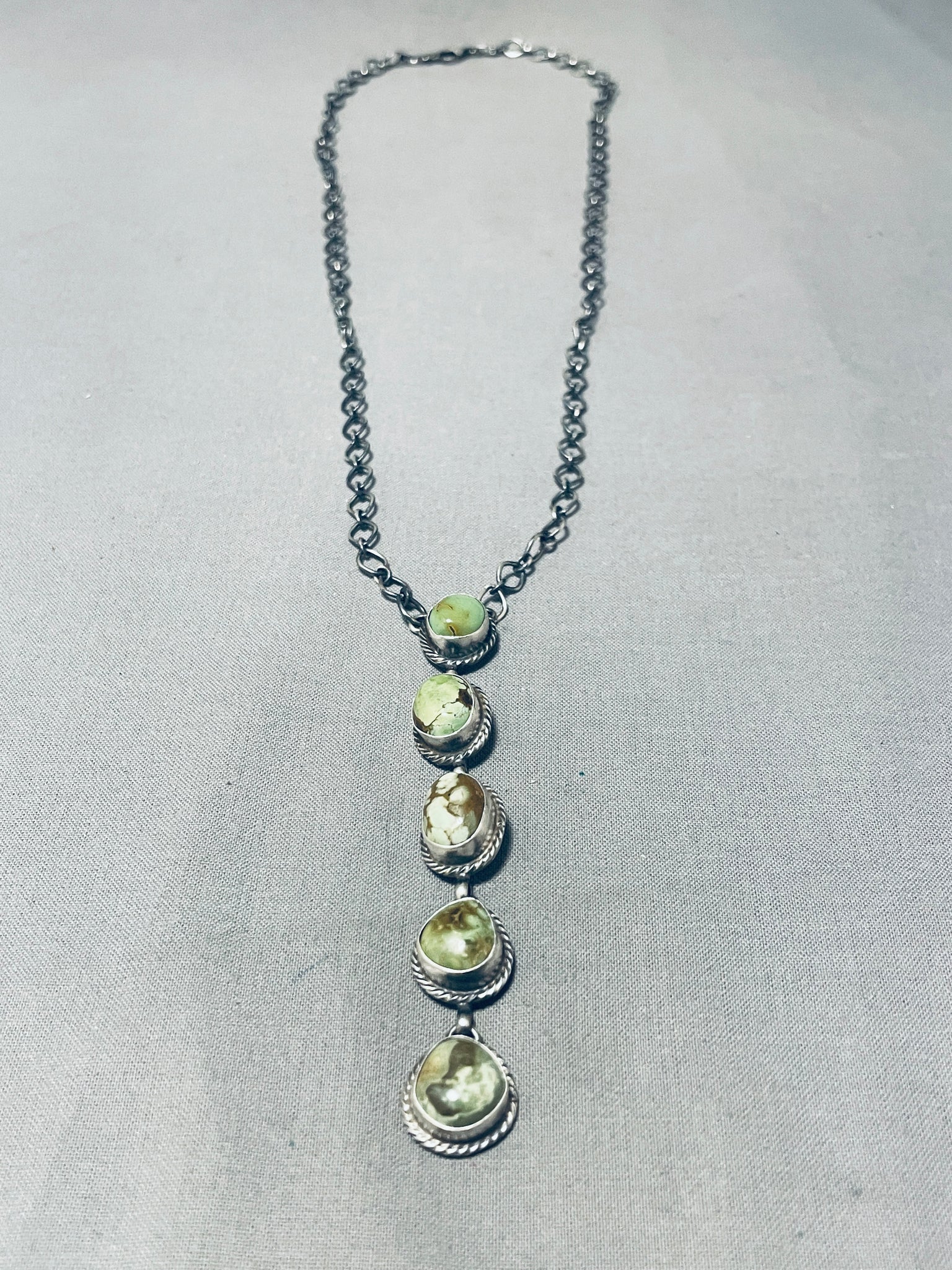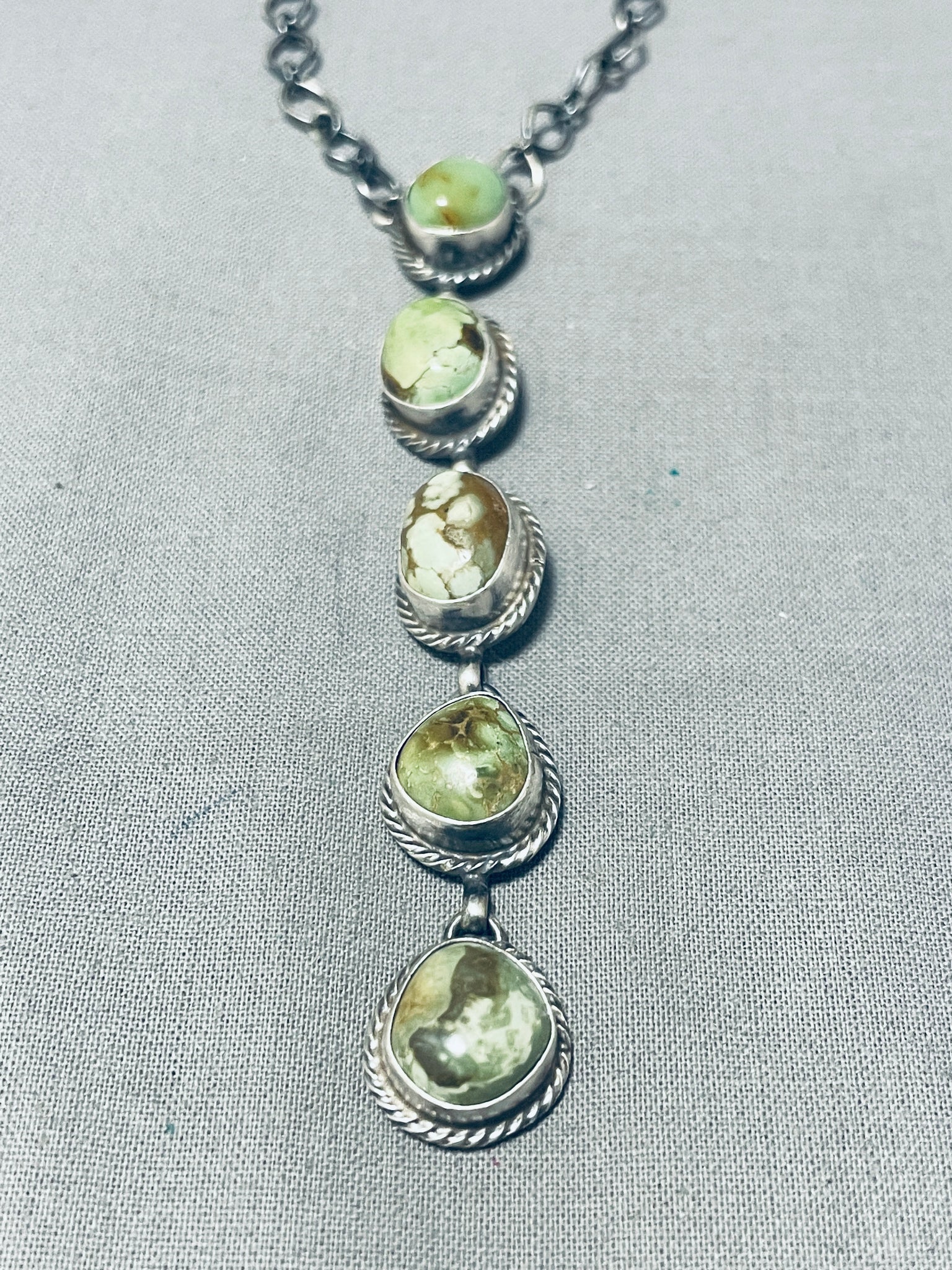 This is a superior Navajo unique style silver necklace. This wonderful necklace contains five outstanding chunky turquoise stones that appear to be from the fabulous Royston turquoise mine. Surrounding each stone are incredible silver ropes. The silver link chain on this necklace is stunning. The entire pendant of five stones measures around 3-5/8" X 1/2". Sterling silver, marked. Cir. 1960's+. The length of the necklace measures around 28". Sturdy 21 grams.