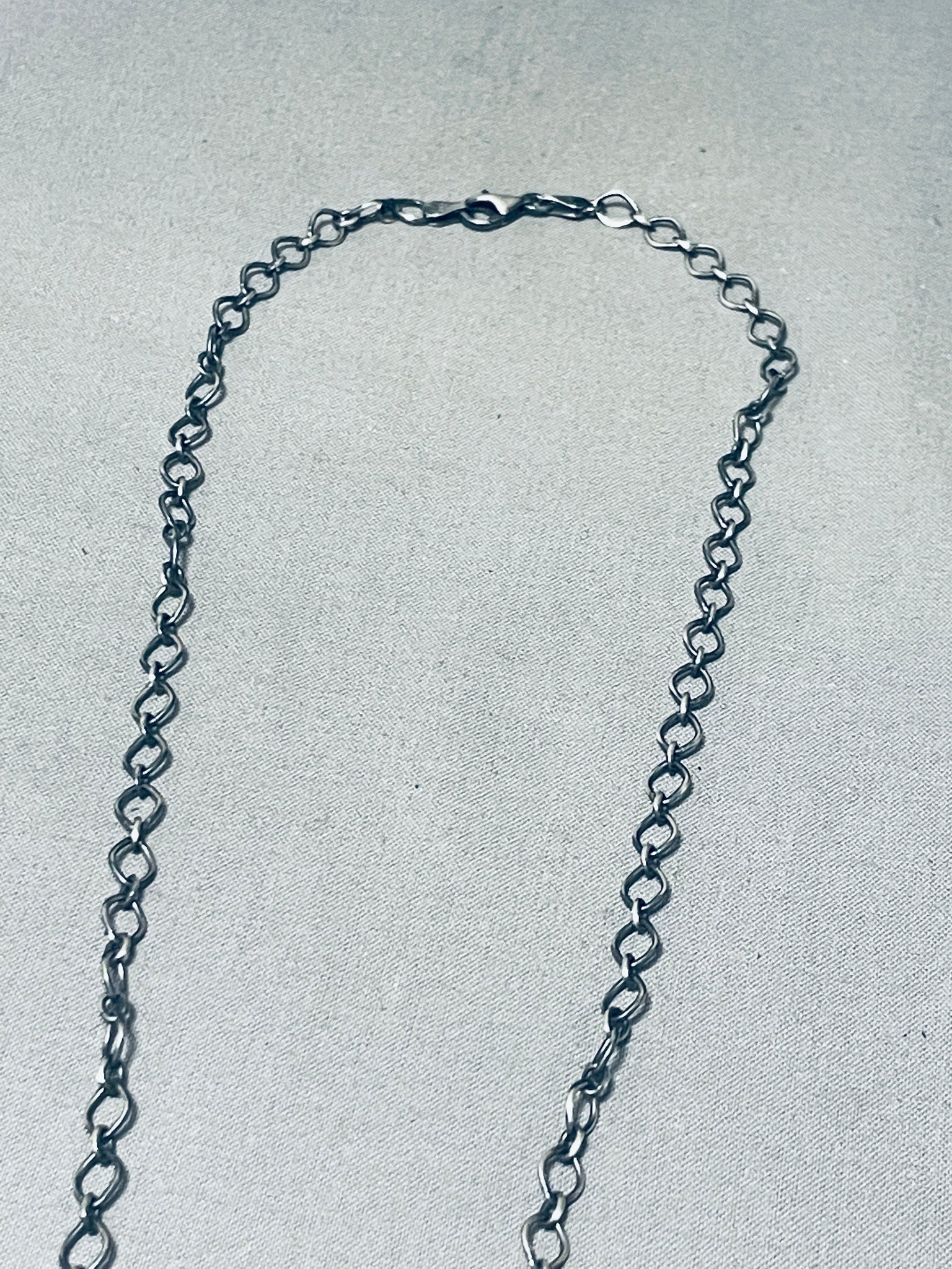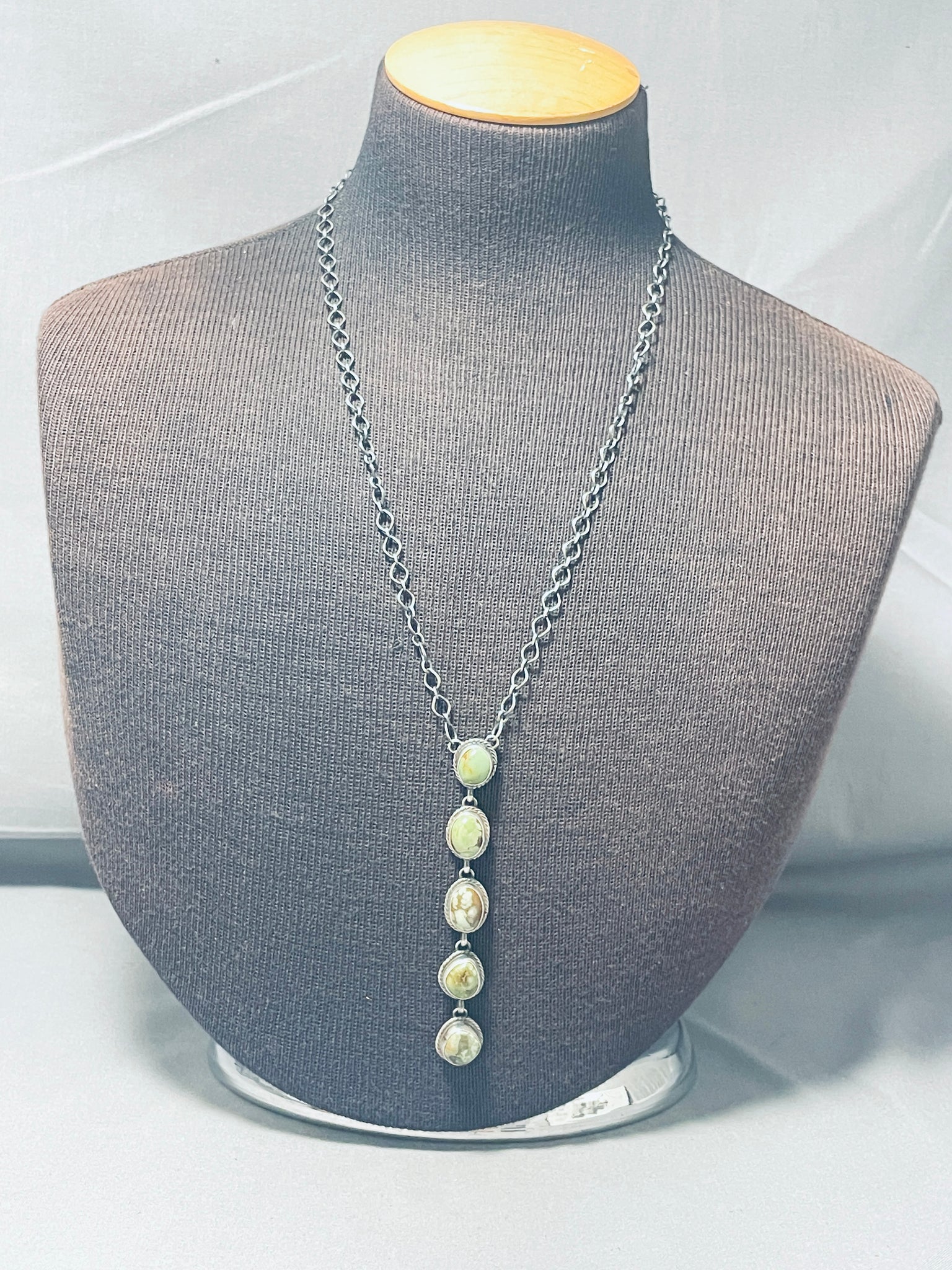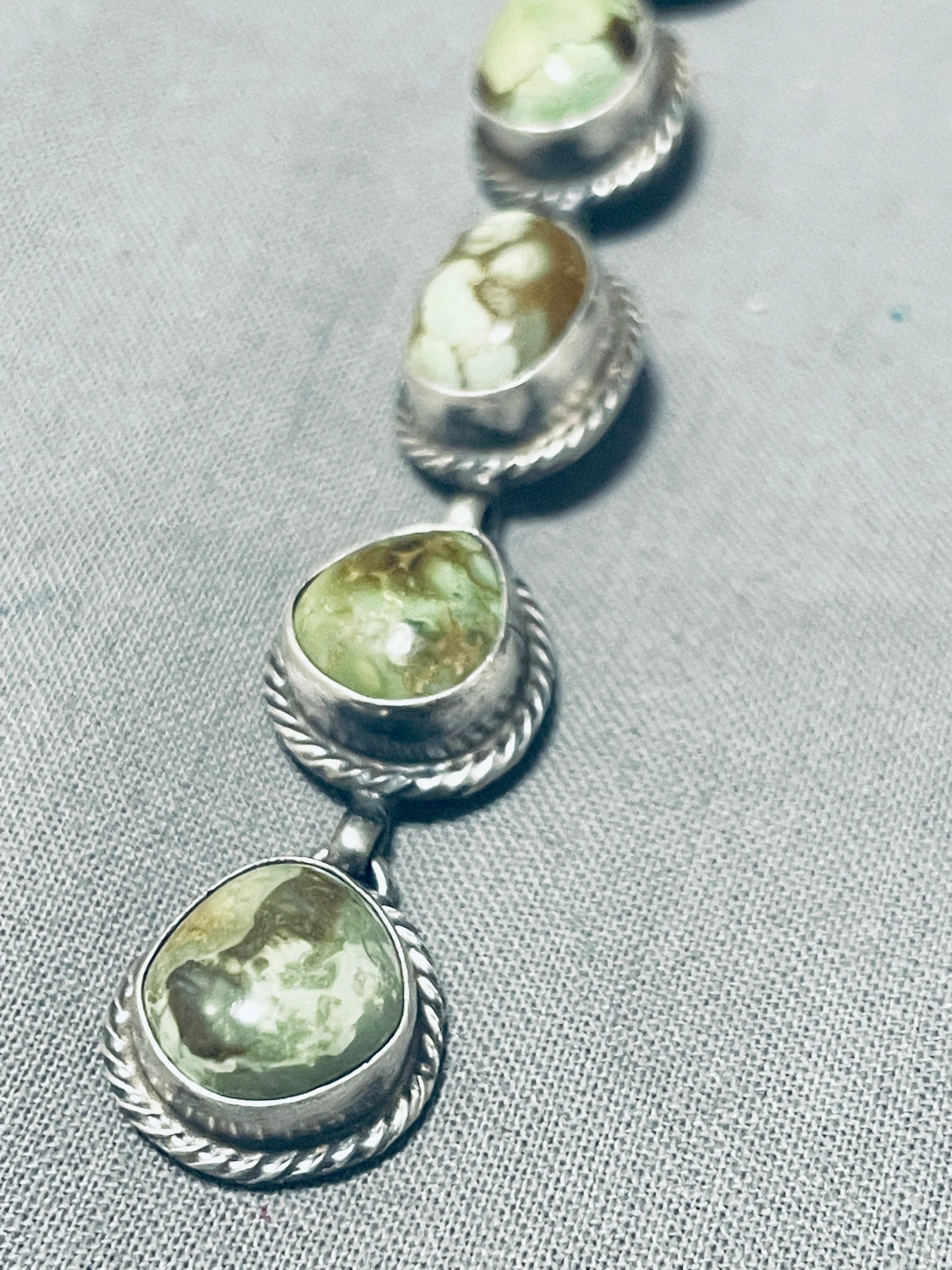 This is a superior Navajo unique style silver necklace. This wonderful necklace contains five outstanding chunky turquoise stones that appear to be from the fabulous Royston turquoise mine. Surrounding each stone are incredible silver ropes. The silver link chain on this necklace is stunning. The entire pendant of five stones measures around 3-5/8" X 1/2". Sterling silver, marked. Cir. 1960's+. The length of the necklace measures around 28". Sturdy 21 grams.