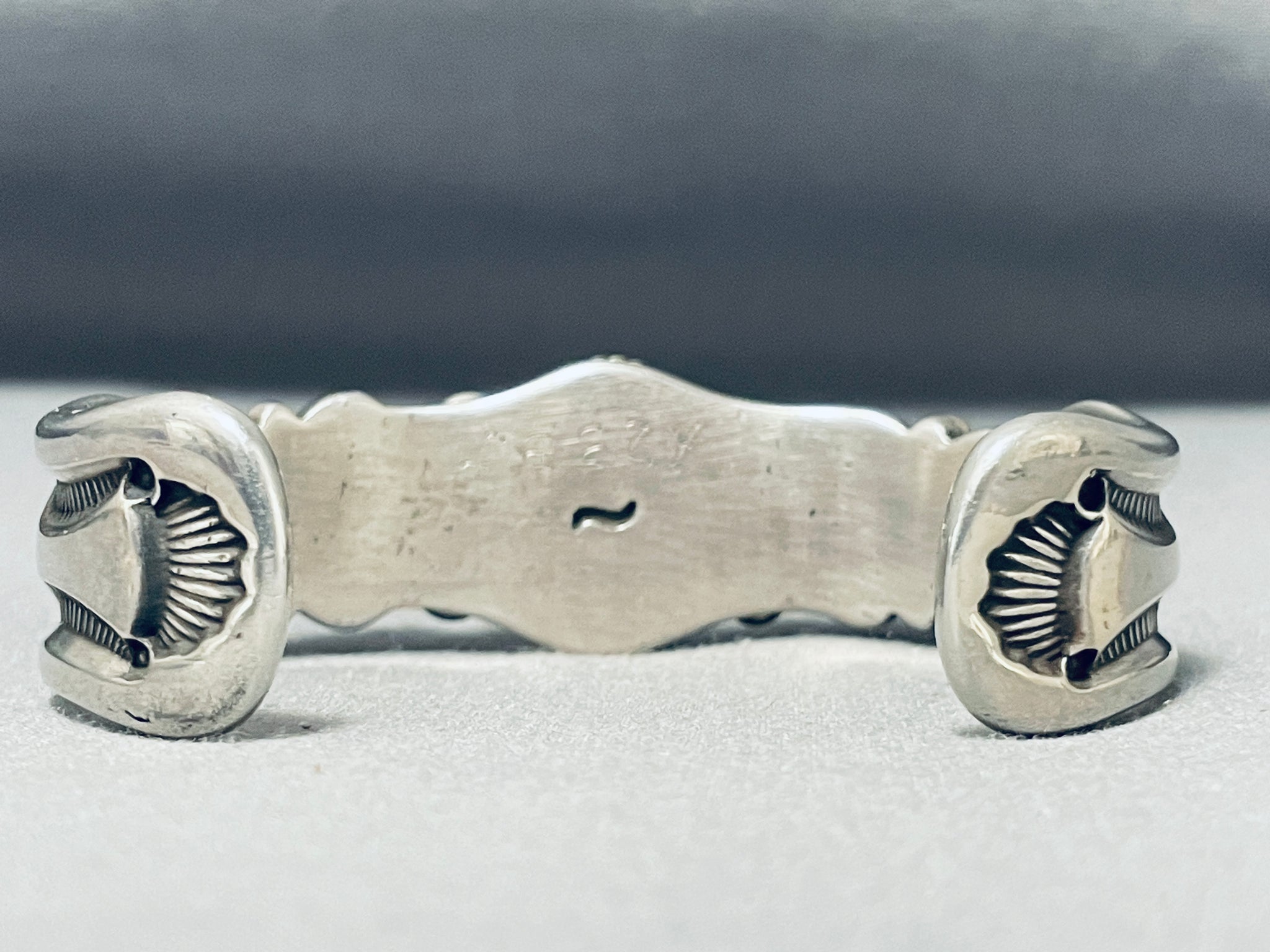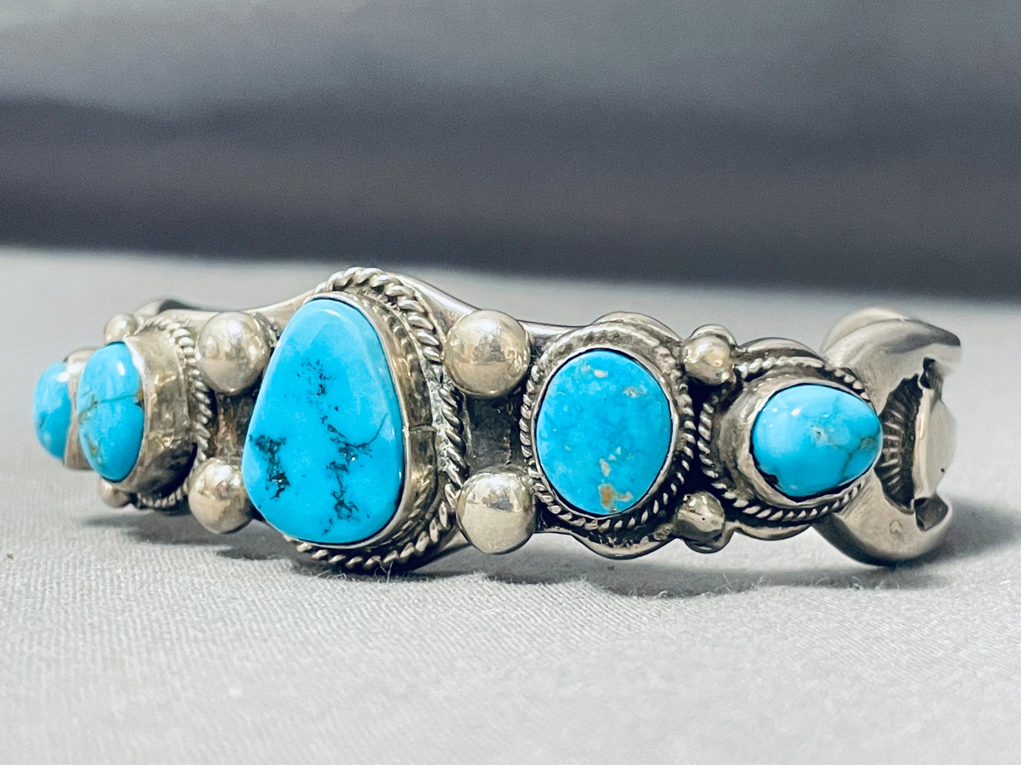 Up for sale is this superior vintage Navajo bracelet featuring a triangular Morenci turquoise stone surrounded by 4 Blue Gem turquoise stones, handcarved silver rope, and silver beads, all on an ornately handstamped solid silver cuff! Absolutely Unbelievable! The center stone measures around 3/4" x 1/2". The width of the bracelet measures around 7/8". Signed by Navajo artist, Freddy Thompson. Sterling silver. The inside end to end measures around 5-3/4" with an additional 1-3/8" gap. Sturdy 94 grams.