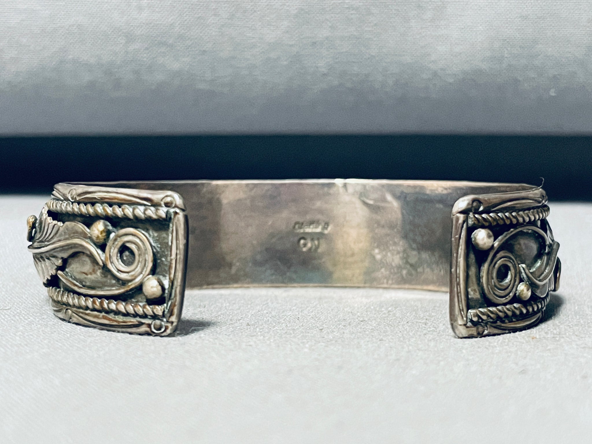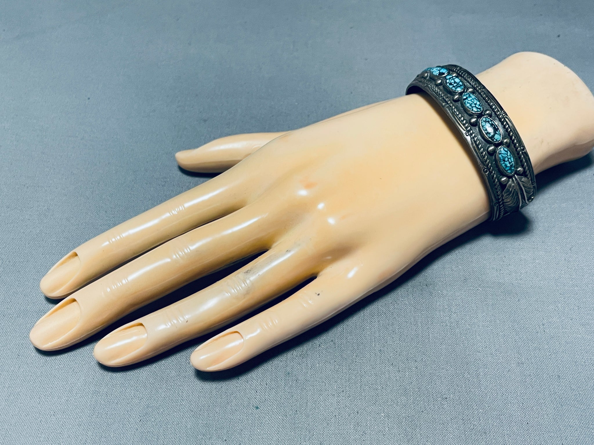 This is an exceptional vintage Navajo turquoise silver cuff bracelet. This outstanding bracelet contains 6 beautiful oval shaped spiderweb green colored turquoise stones. Situated throughout the stones are impeccable silver raindrops with end accenting silver leaves. Accenting the leaves are striking swirling stems with more wonderful raindrops. Bordering the edges of the cuff are superior silver ropes with accenting sun and dotted stamp works. The stones measure around 3/8" x 3/16". The width of the bracelet measures around 5/8". Signed by Navajo artist, Gary Nez. Sterling silver, marked. Cir. 1970's+. The inside end to end measures around 5-1/2" with an additional 1-1/4" gap. Sturdy 27 grams.