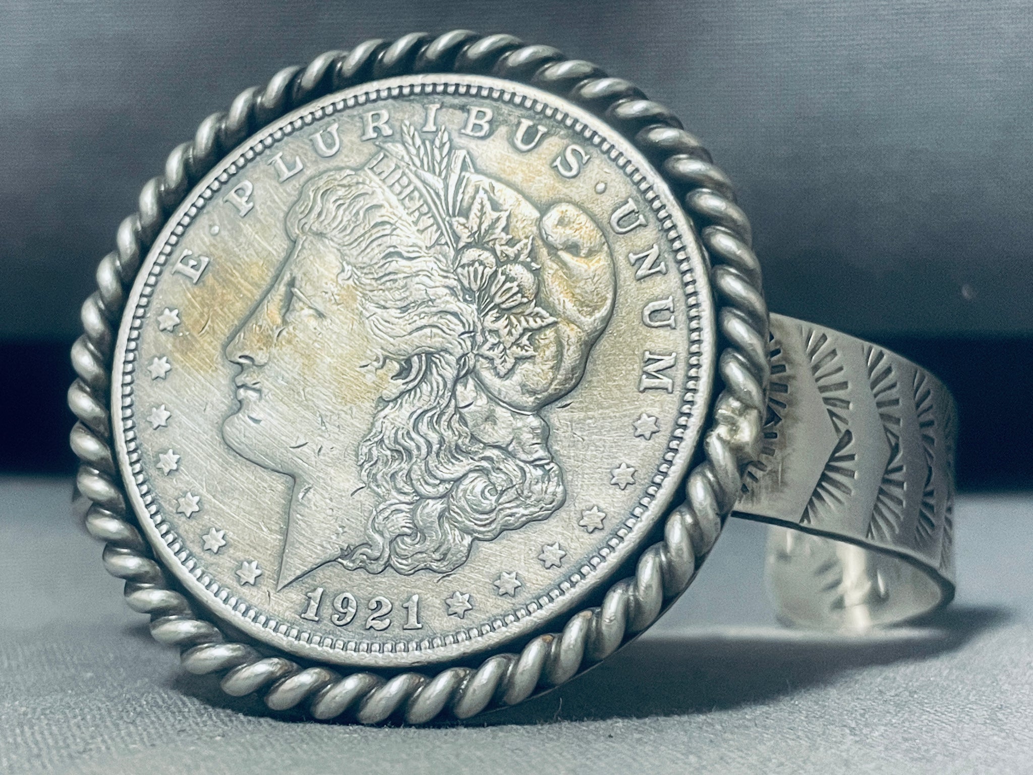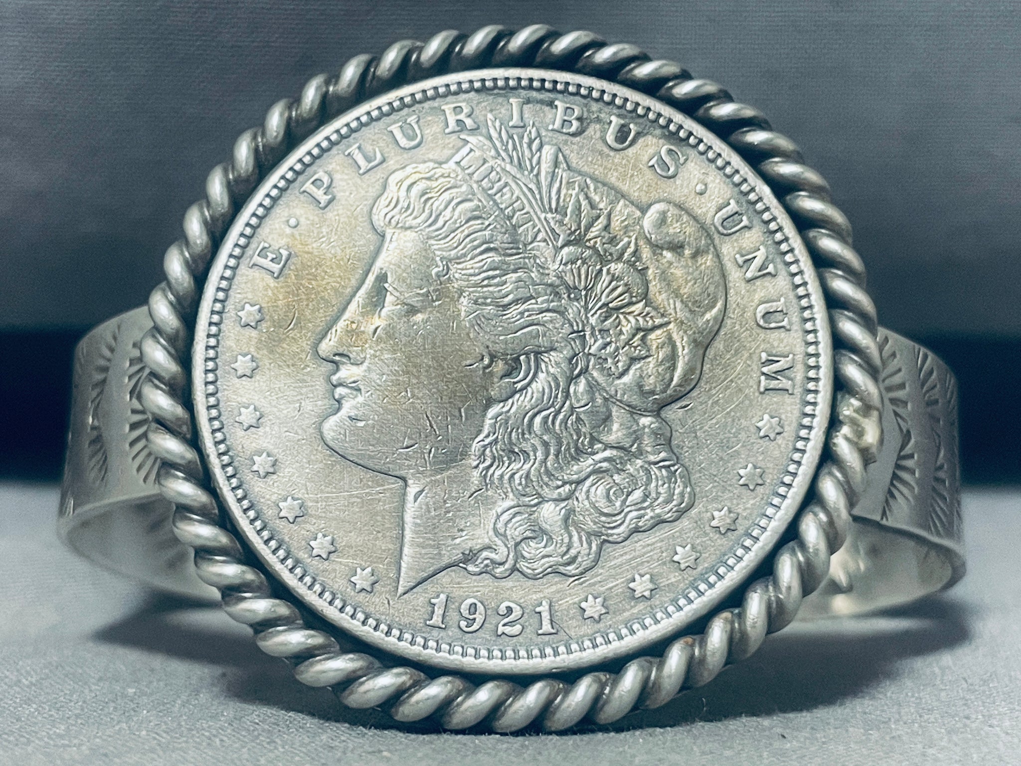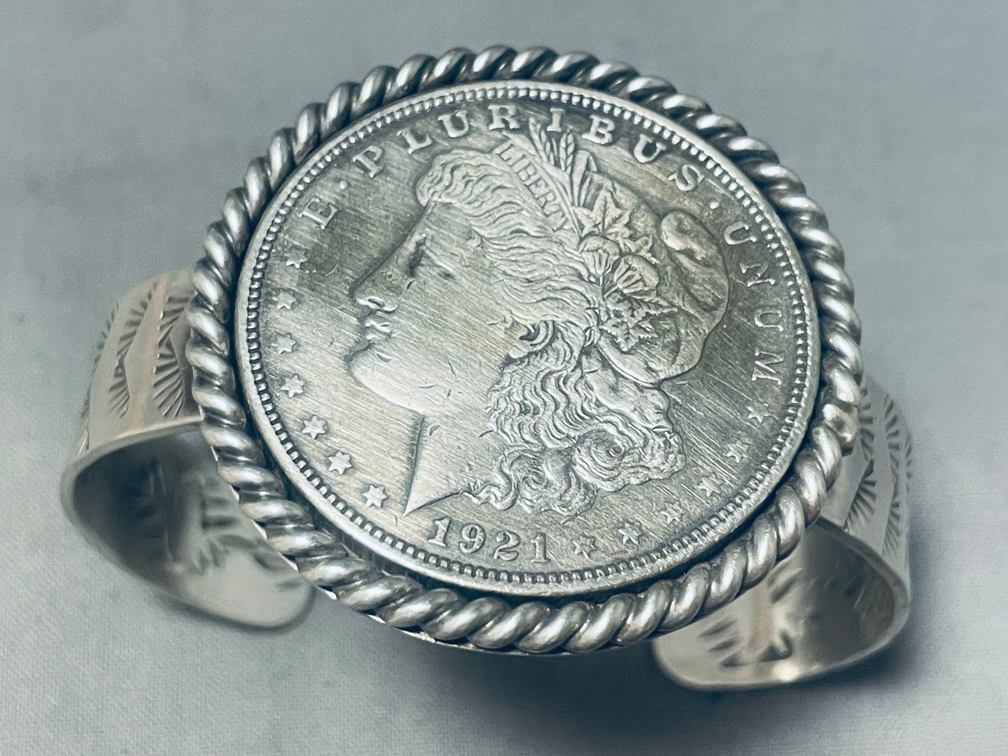 This is a museum quality Navajo silver bracelet featuring a 1921 Morgan silver dollar surrounded by a thick silver rope border on a handcarved solid silver cuff with silver handstampings inside and out! Truly Extraordinary!