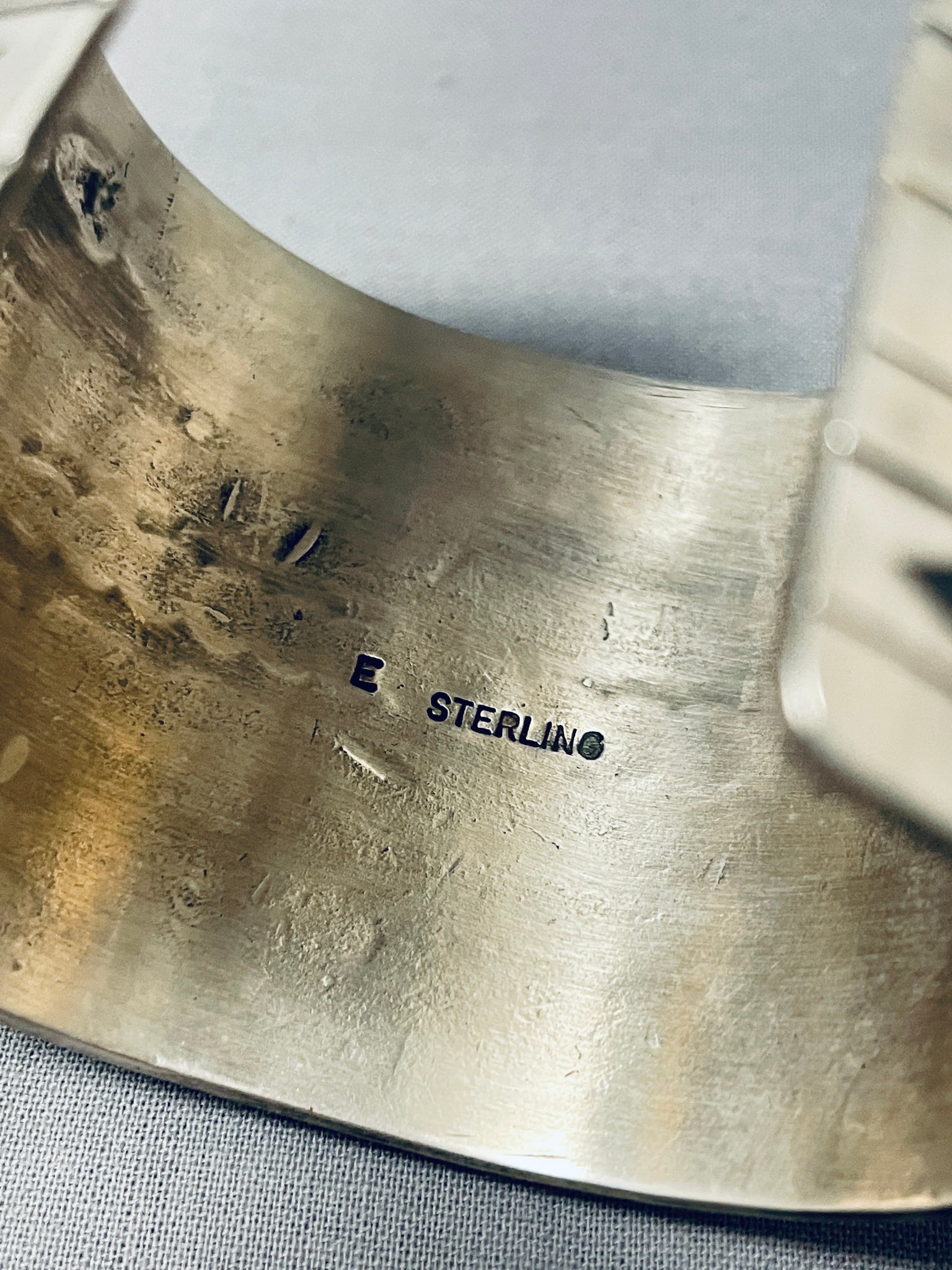 Up for sale is this magnificent Navajo silver bracelet. Flown in from heaven, this incredible huge Sky Blue turquoise stone has an equally incredible silver applique dragonfly on each side! Eye-catching from every angle! The center stone measures around 1-3/4" x 1-1/2". The width of the bracelet measures around 2". Signed by Navajo artist, E. Sterling silver, marked. The inside end to end measures around 5-3/4" with an additional 1" gap. Sturdy 154 grams.