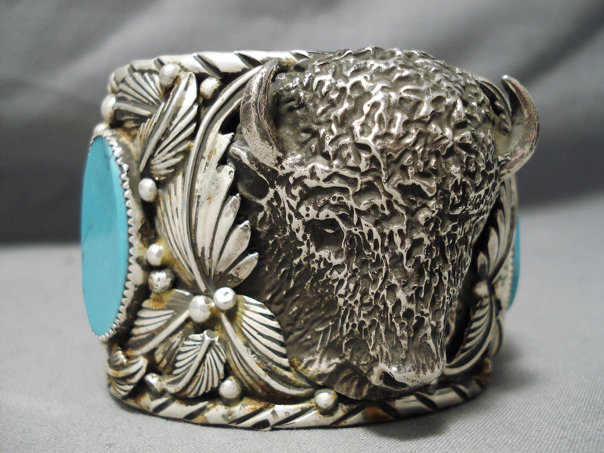 Giant Heavy Buffalo Native American Navajo Turquoise Sterling Silver Bracelet- 202 Grams!