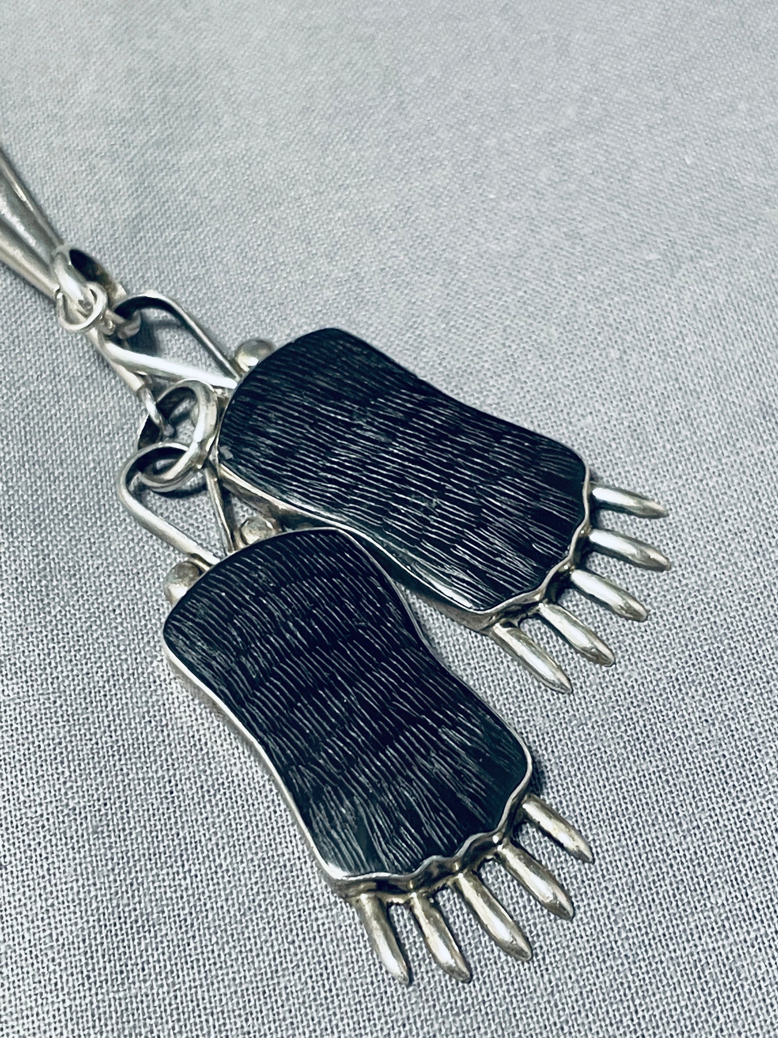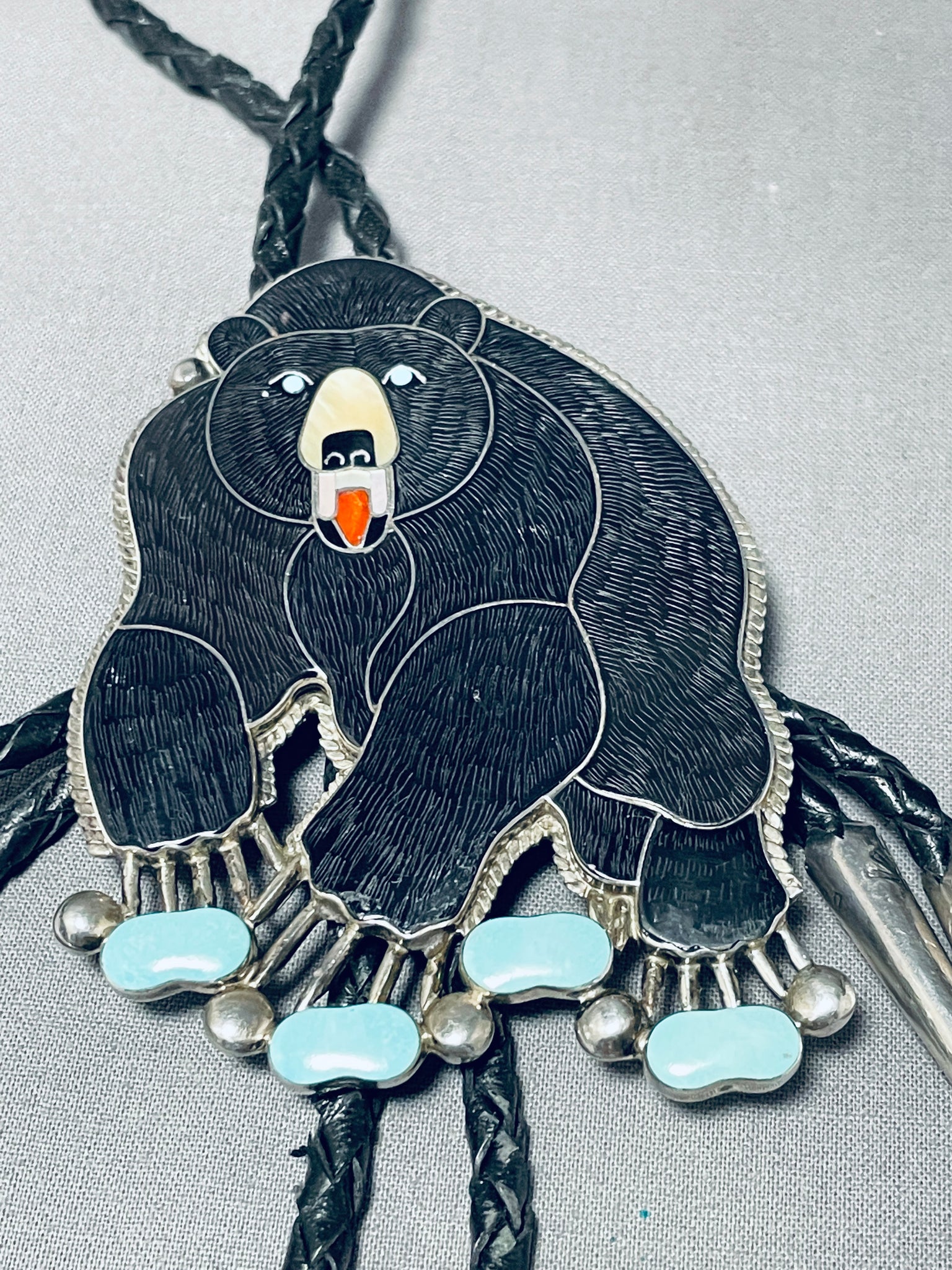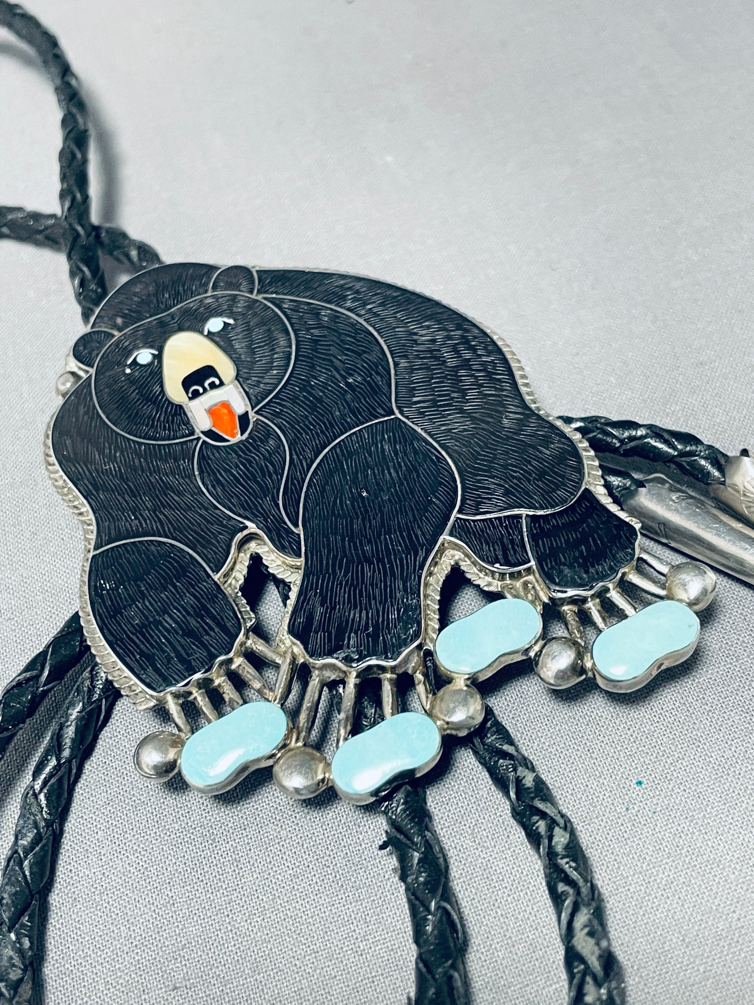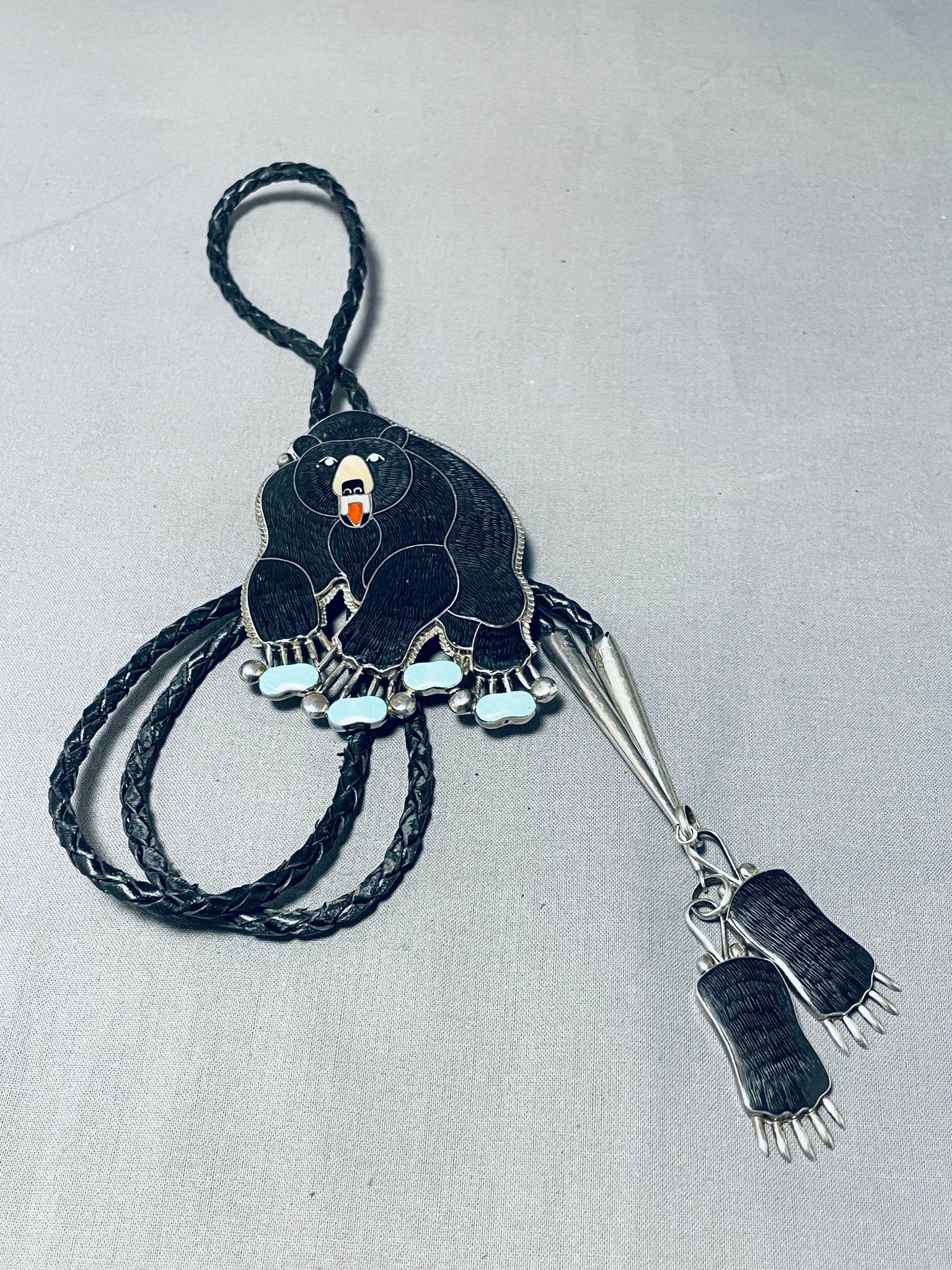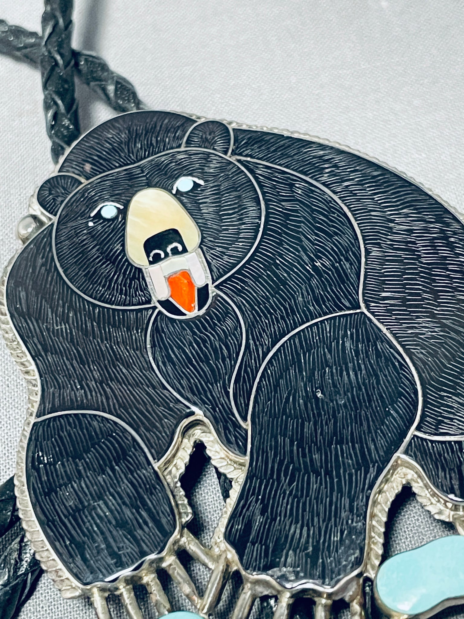 Gigantic Vintage Native American Zuni Blackbear Turquoise Sterling Silver Bolo Tie