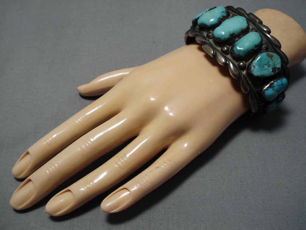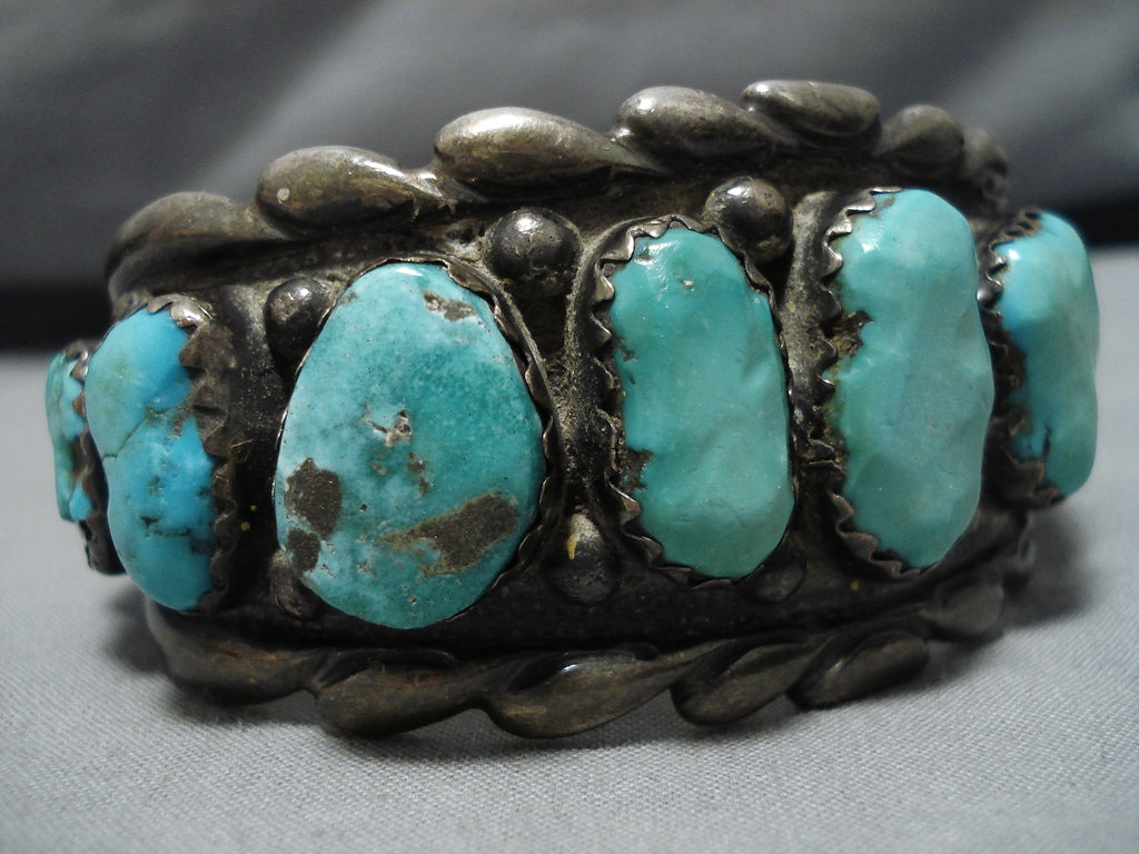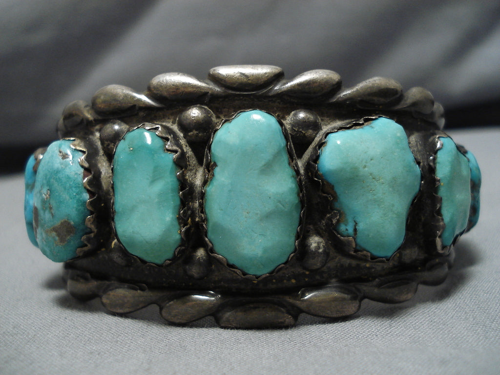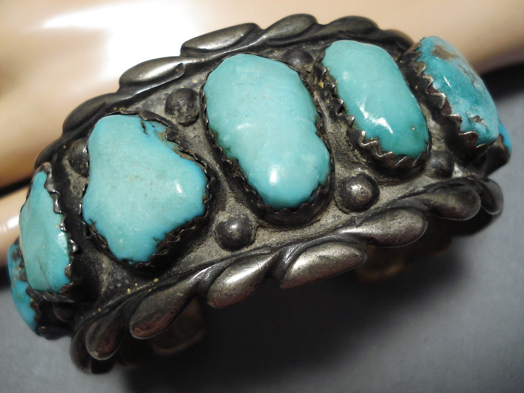 This is a superior vintage Navajo turquoise row silver bracelet. This extremely heavy old turquoise bracelet consists of 12 outstanding and remarkable graduating chunky turquoise stones. The patina and character this piece has is impeccable. The weight of the bracelet is just phenomenal. Located throughout the stones are amazing silver raindrops. Bordering the thick and sturdy silver cuff are incredible thick and deep silver waving patterns. The center stone measures around 7/8" x 1/2". The width of the bracelet measures around 1-1/2". Signed by Navajo artist, GC. Sterling silver. Cir. 1950's+. The inside end to end measures around 6-1/4" with an additional 1-1/4" gap. Sturdy 121 grams.
