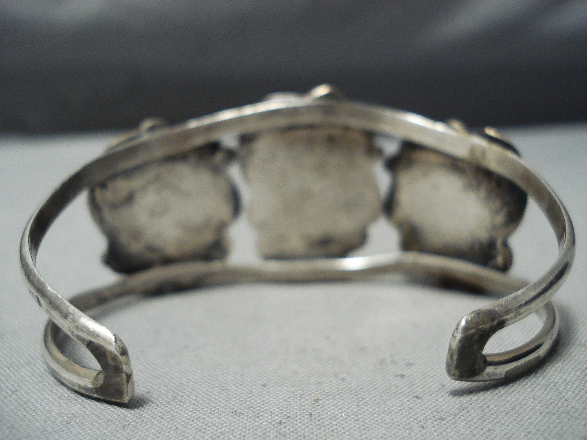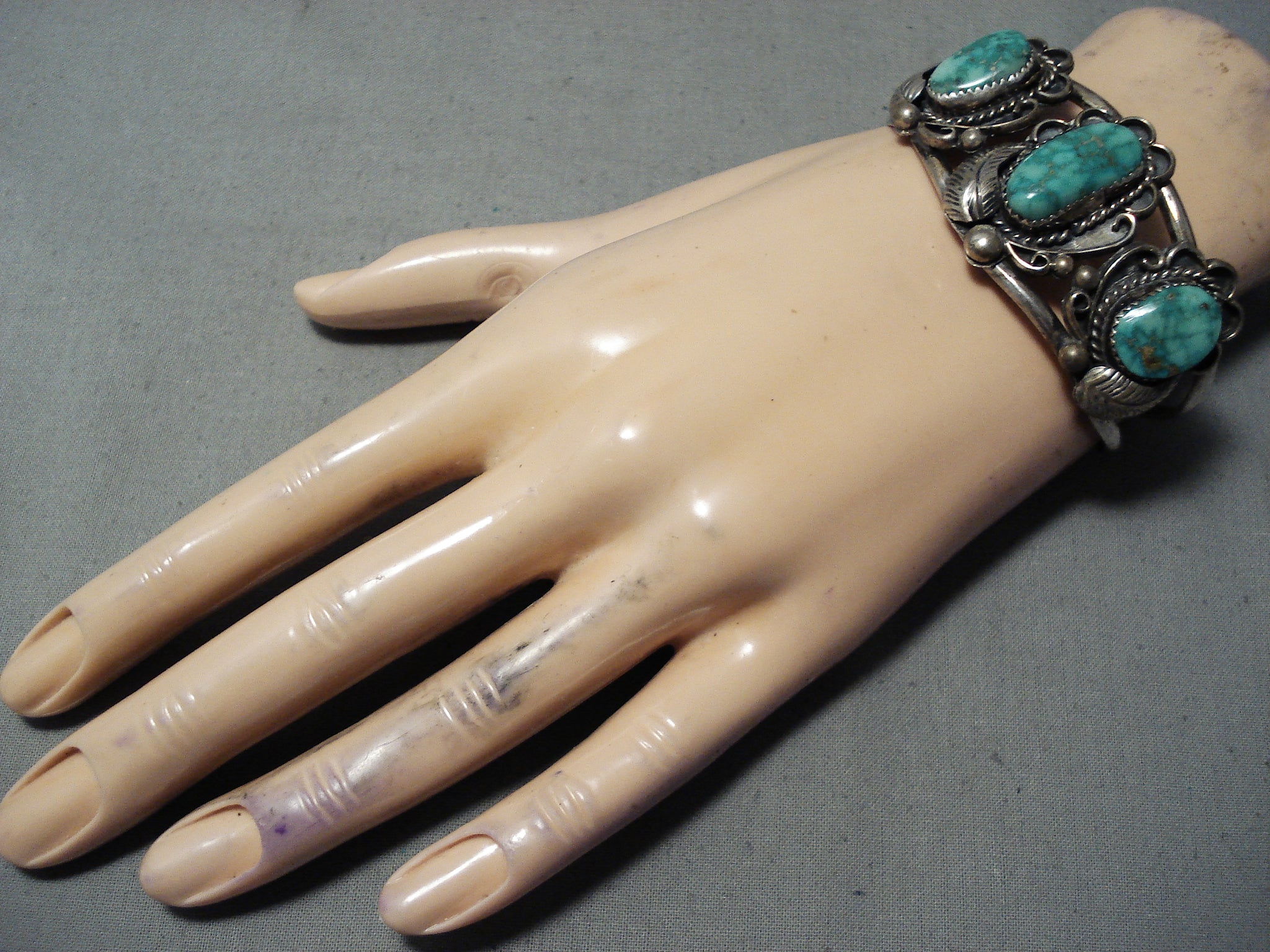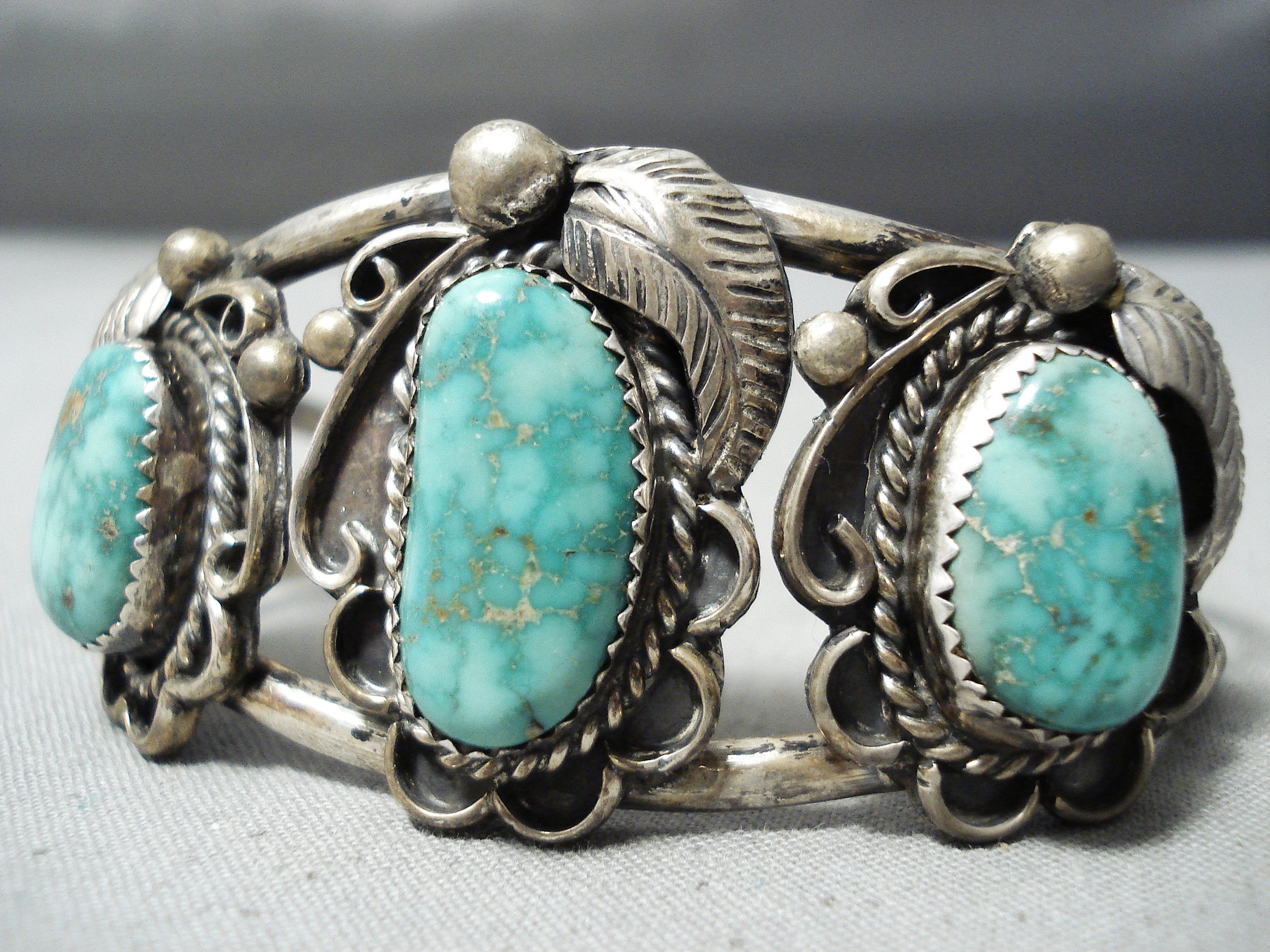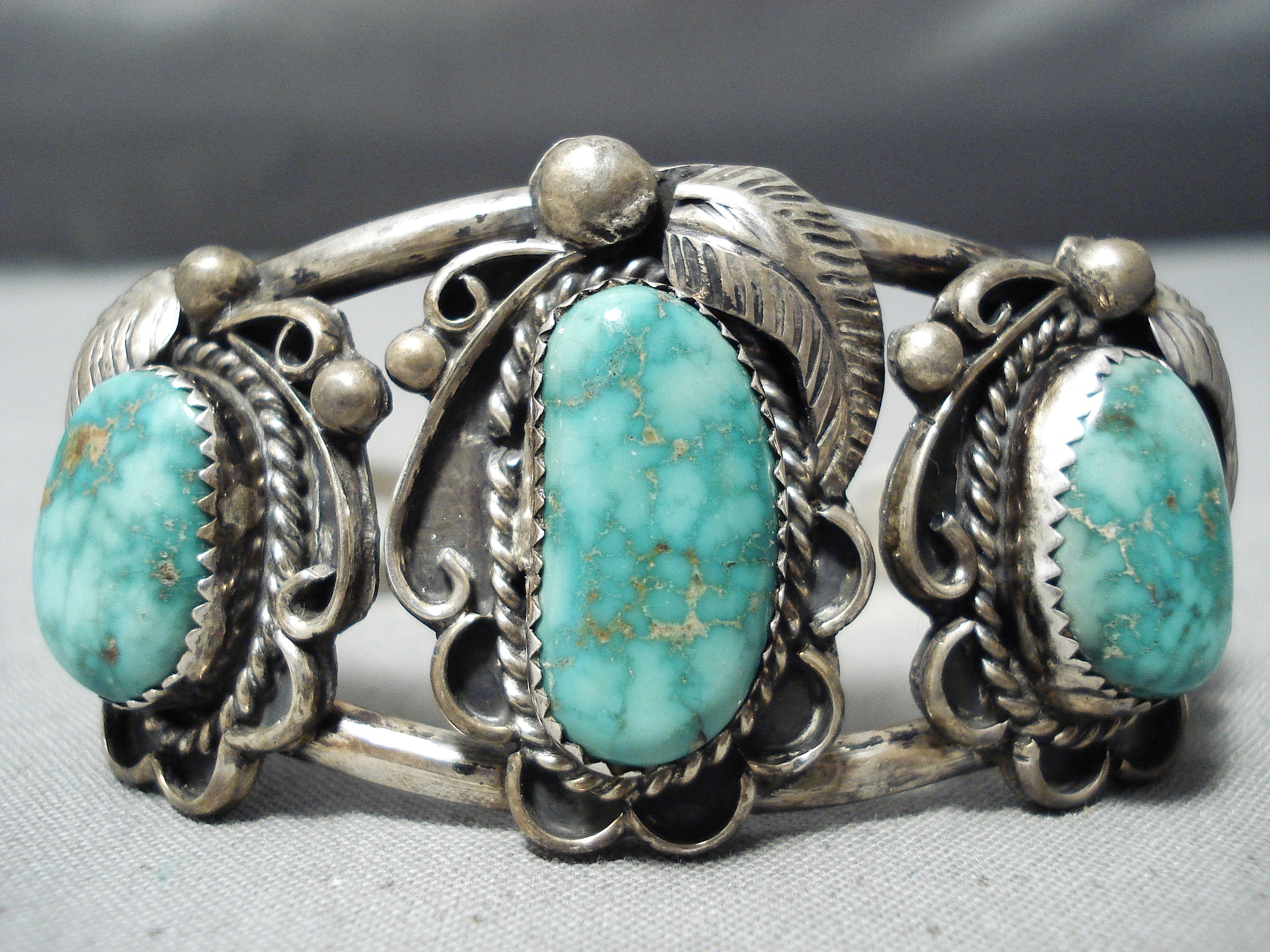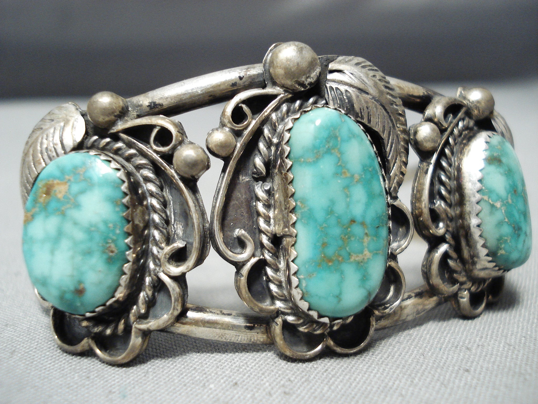 This is an exquisite vintage Navajo three stone silver bracelet. This outstanding piece contains three old high grade Carico Lake turquoise stones. Surrounding each stone are marvelous silver works that consist of hand carved leaves, stems, ropes and raindrops. This bracelet consists of a wonderful double silver shank cuff with old natural patina. The center stone measures around 3/4" x 3/8". The width of the bracelet measures around 1-1/8". Sterling silver. Cir. Mid century . The inside end to end measures around 5-1/4" with an additional 1" gap. Sturdy 32 grams.