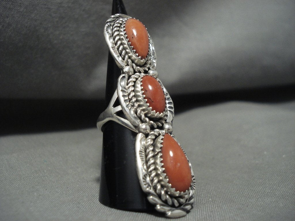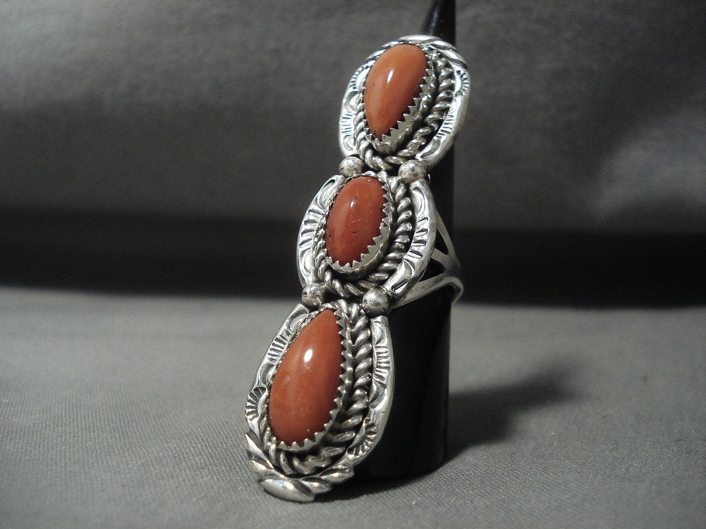This is a gigantic Navajo Native American jewelry Native American jewelry silver ring. This piece contains three, dome shaped and teardrop shaped coral stones. Surrounding the corals are wonderful silver works that include ropes, sun patterns and raindrops. This ring measures to be a size 7 but can be resized if needed. The largest stone measures around 5/8" x 1/4". The ring face measures around 2-3/8" x 5/8". Signed by Navajo Native American jewelry Native American jewelry artist, Tso family . Cir. 1970's+. Sterling silver, marked. Sturdy 14 grams.