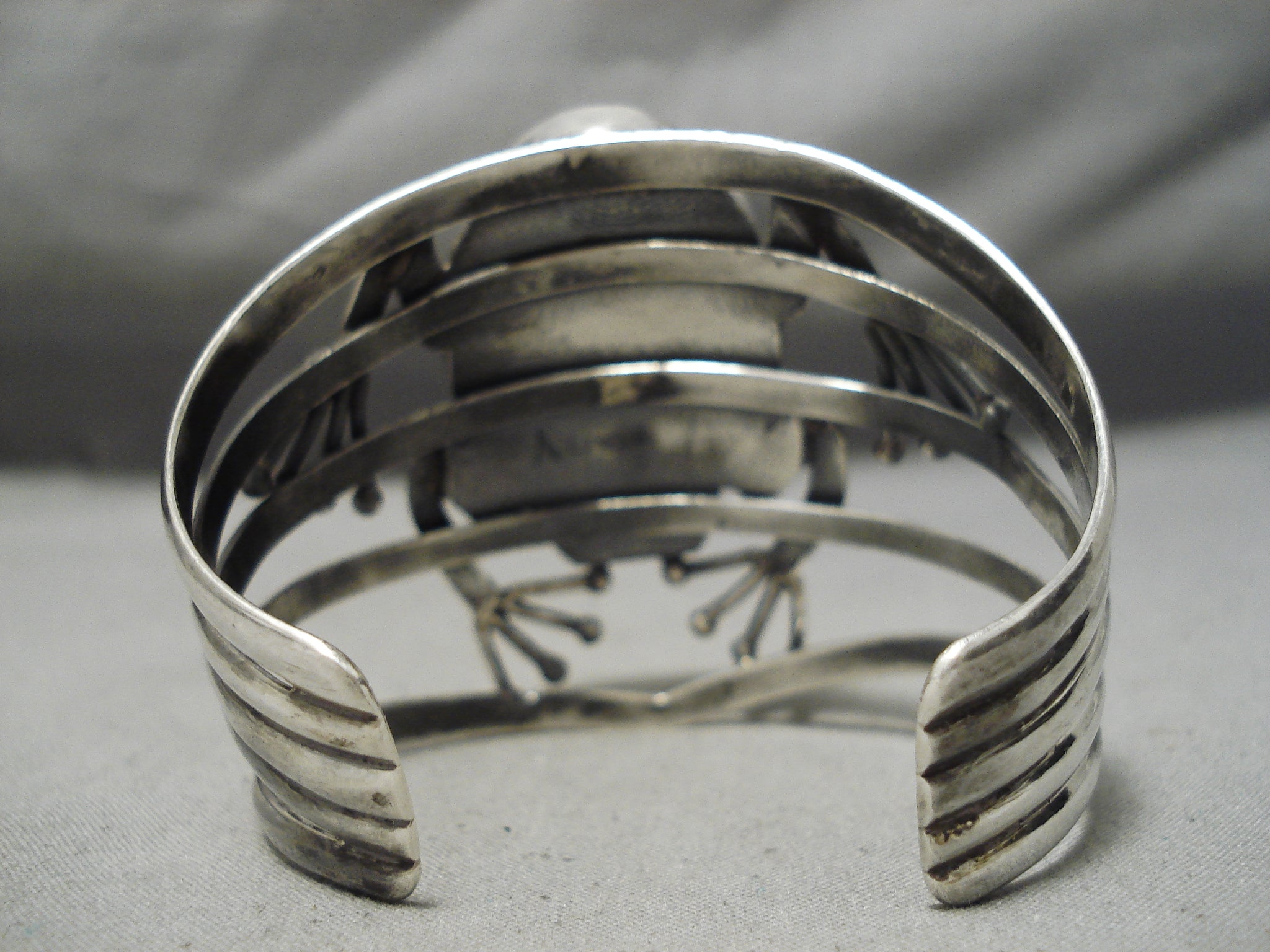This is a magnificent vintage Navajo single stone silver frog bracelet. This extremely unique bracelet contains a remarkable silver frog that is situated on top of a wide and sturdy five silver shank cuff. Located on the frog is a wonderful large spiderweb turquoise stone. The center stone measures around 1-1/2" x 1-1/8". The width of the bracelet measures around 2-1/4". Signed by Navajo artist, Yazzie Family . Sterling silver, marked. Cir. 1970's+. The inside end to end measures around 5-3/4" with an additional 1-1/4" gap. Sturdy 74 grams.