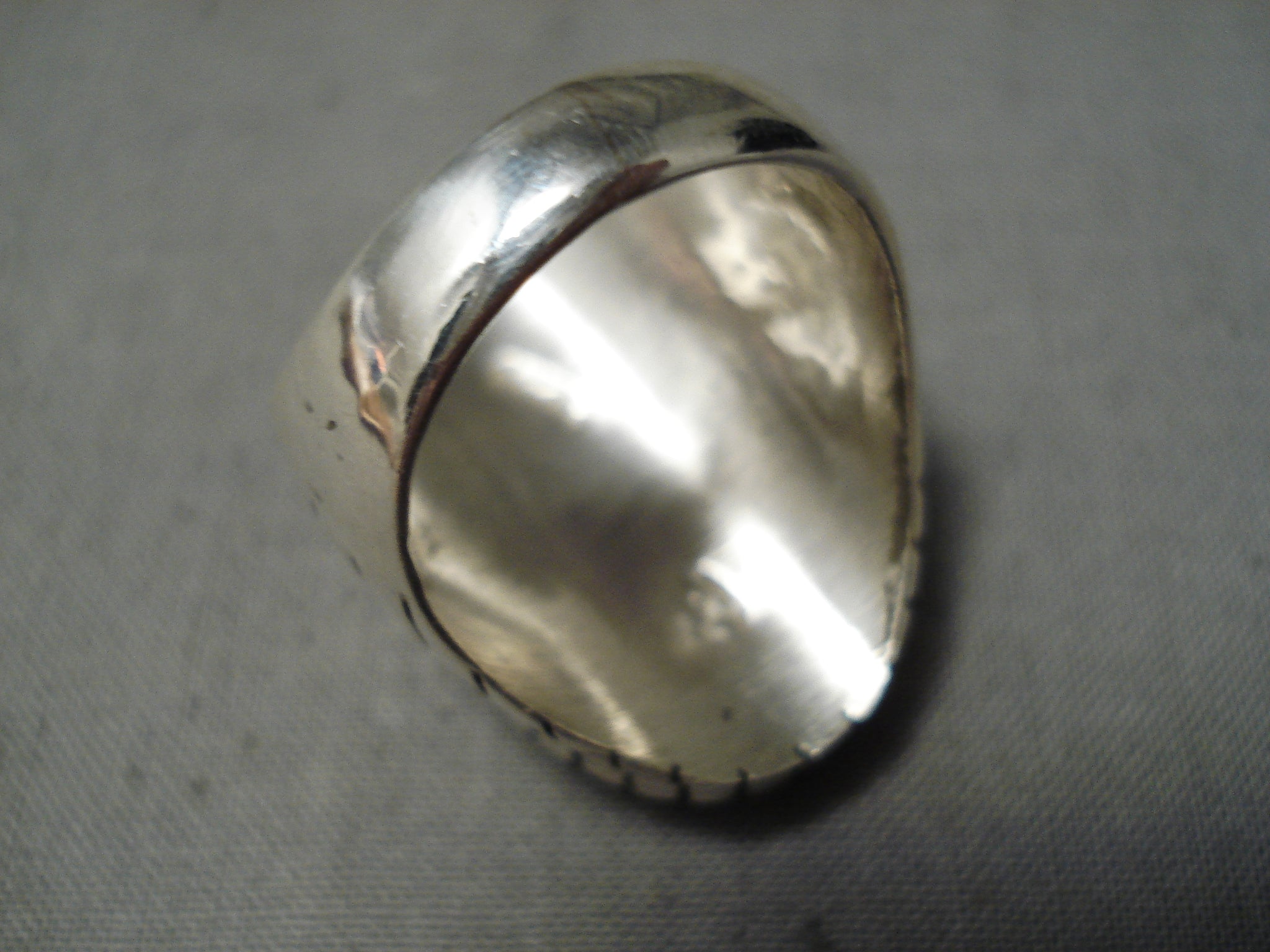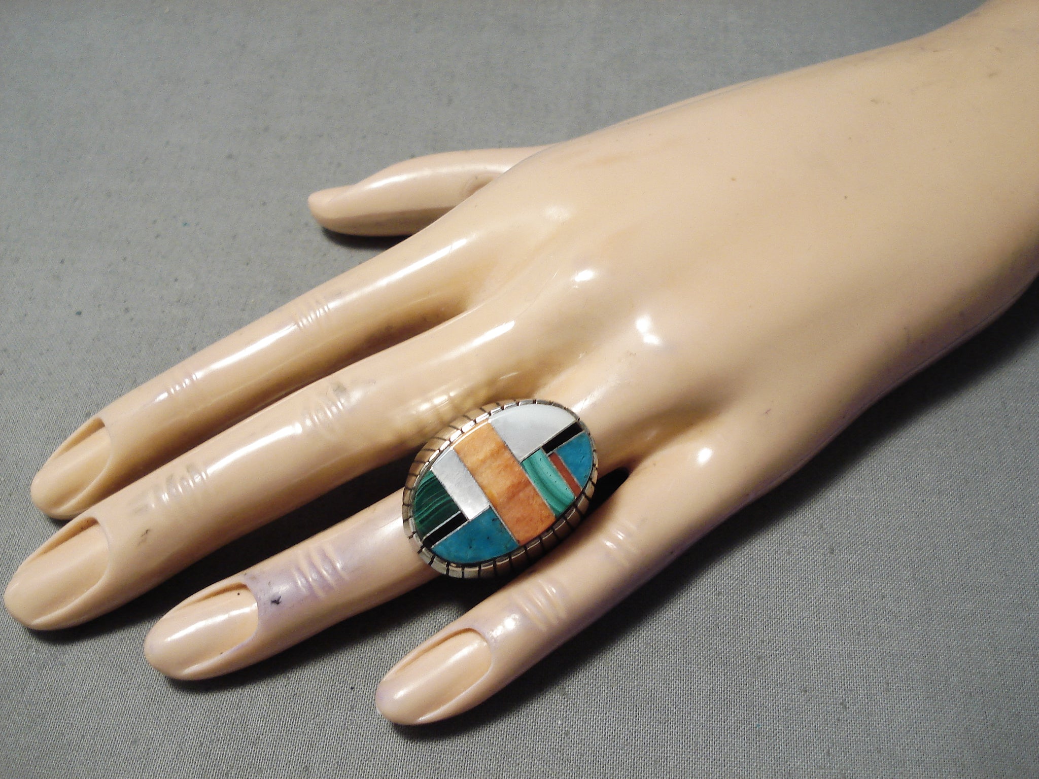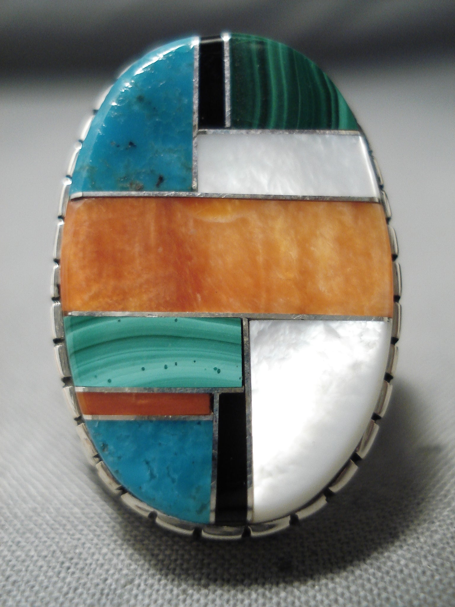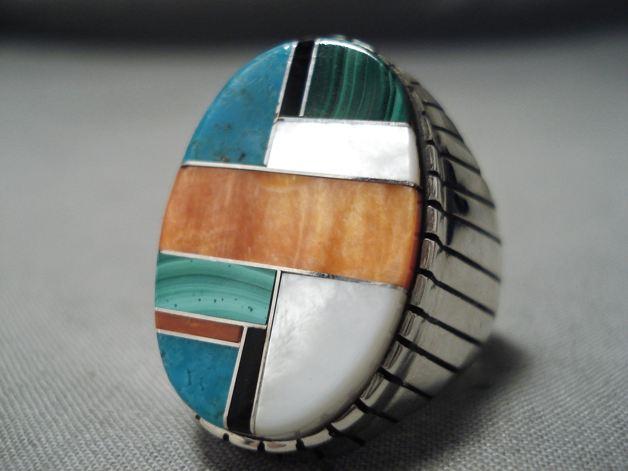 Huge Men's Native American Navajo Inlay Turquoise Coral Jet Sterling Silver Ring