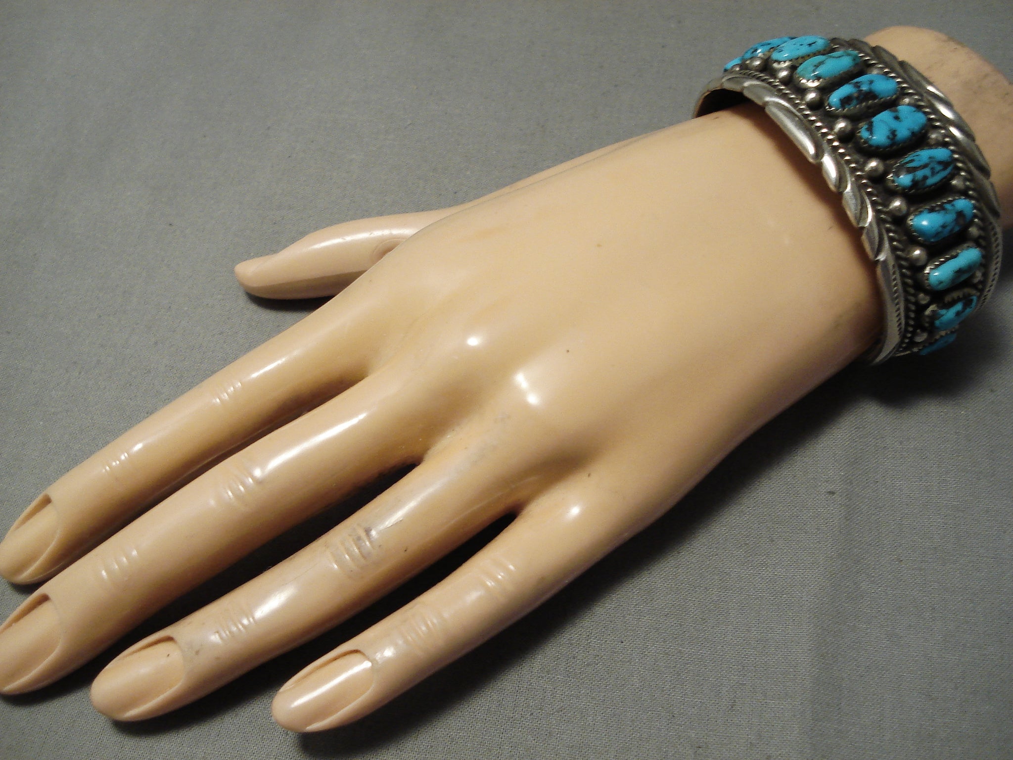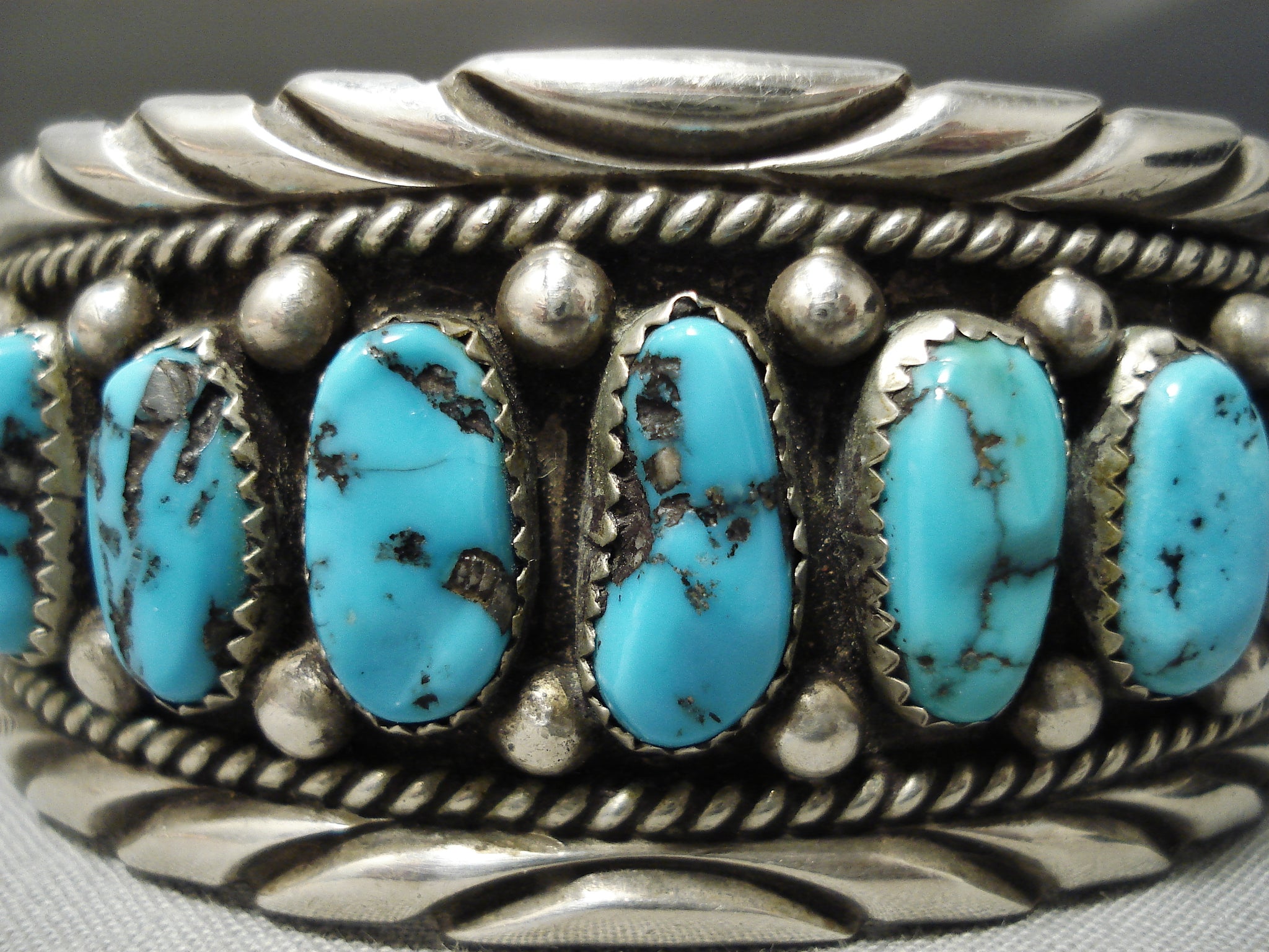 This is an exceptional vintage Navajo turquoise row silver bracelet. This piece contains a beautiful plethora of old Morenci turquoise stones, a total of 13. The stones wonderfully graduate in size with accenting silver raindrops and ropes. Resting at the ends of the heavy and thick silver cuff are beautiful swirling stems. Bordering the cuff are amazing deep long silver wave works. The center stone measures around 3/4" x 1/4". The width of the bracelet measures around 1-1/8". Sterling silver. Cir. Mid century . The inside end to end measures around 5-3/4" with an additional 3/4" gap. Sturdy 57 grams.