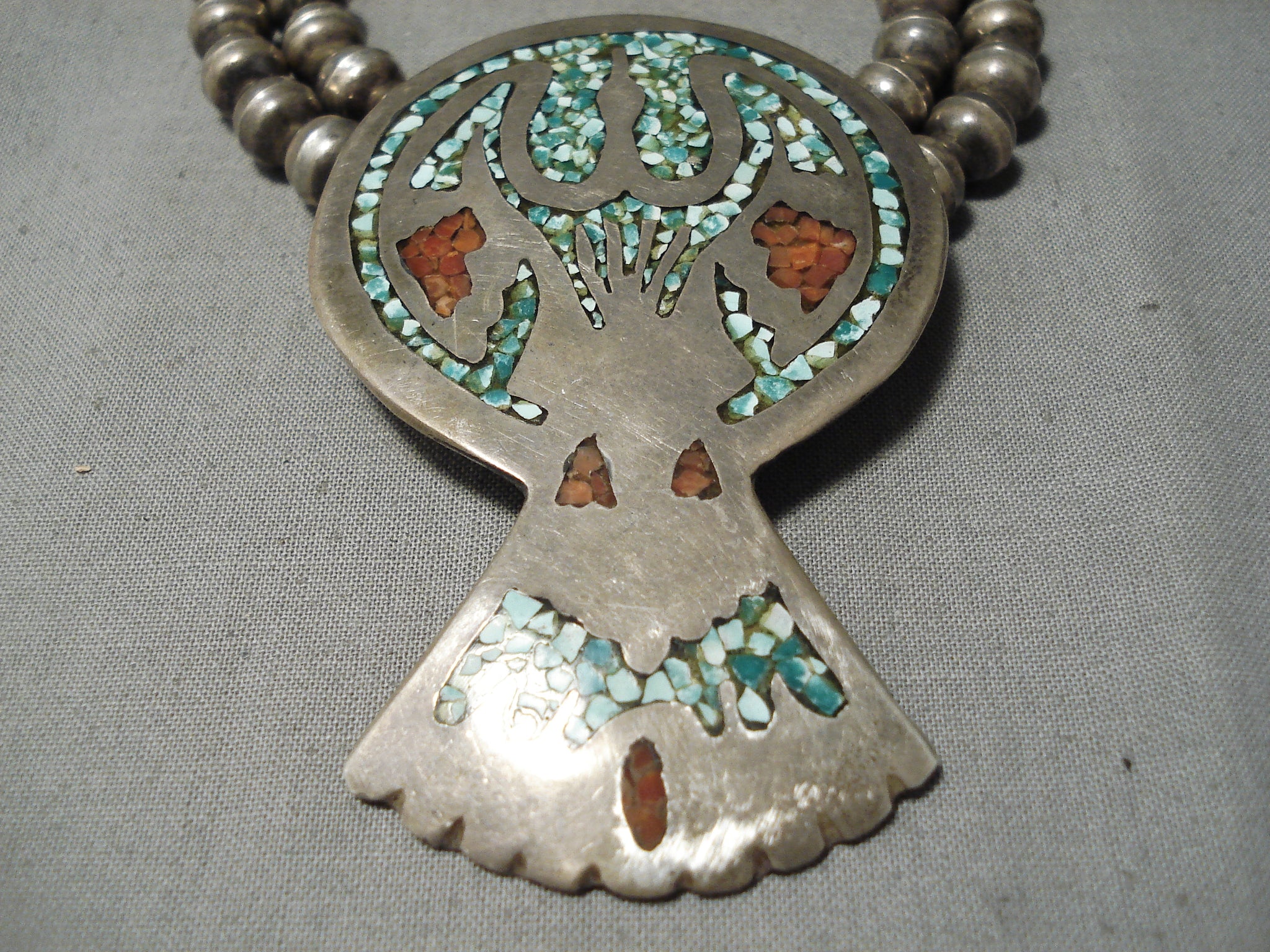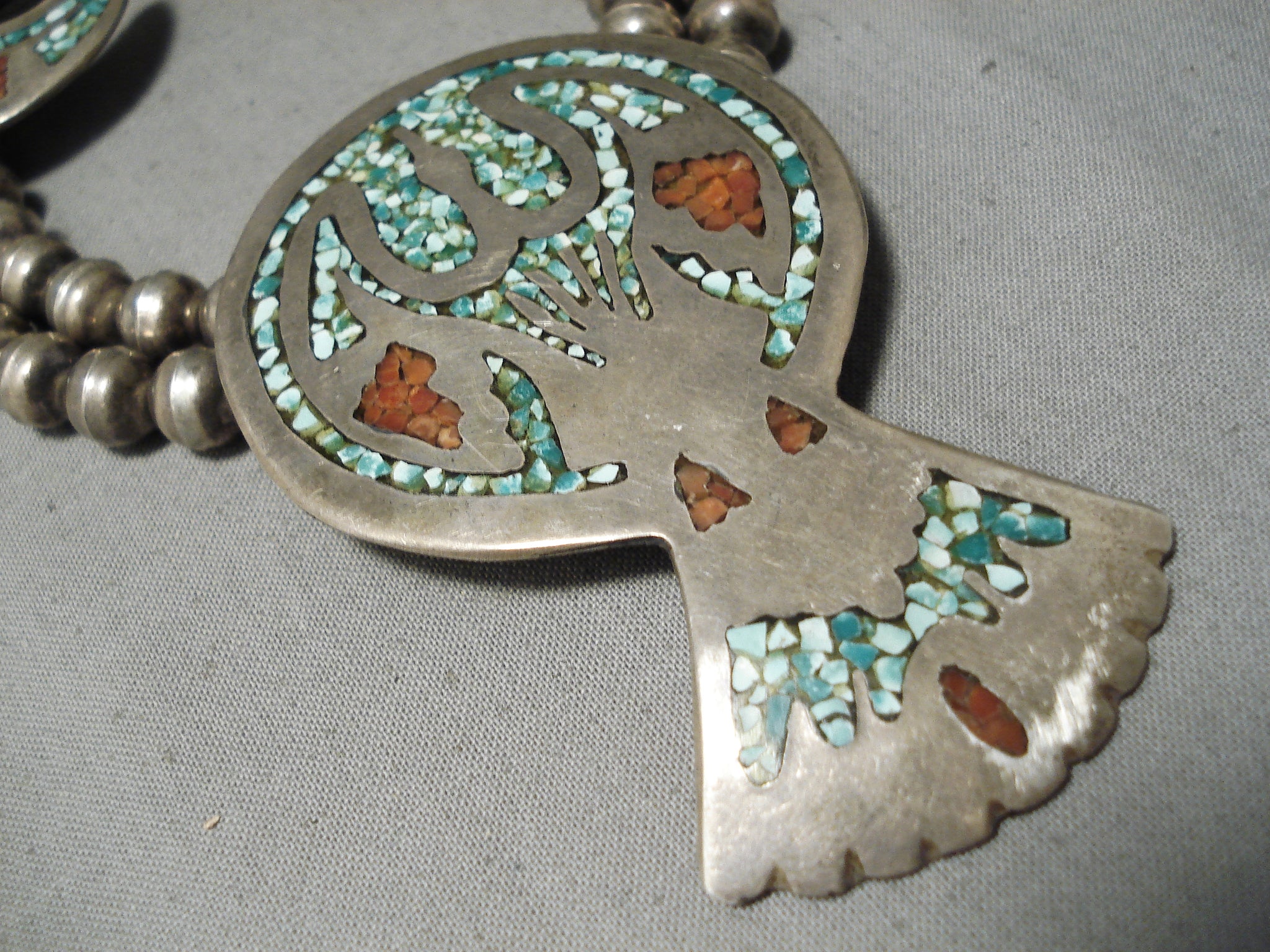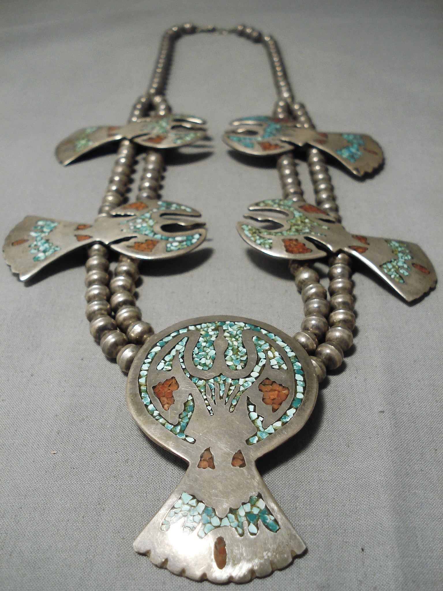 Huge Vintage Native American Navajo Green Turquoise Sterling Silver Squash Blossom Necklace