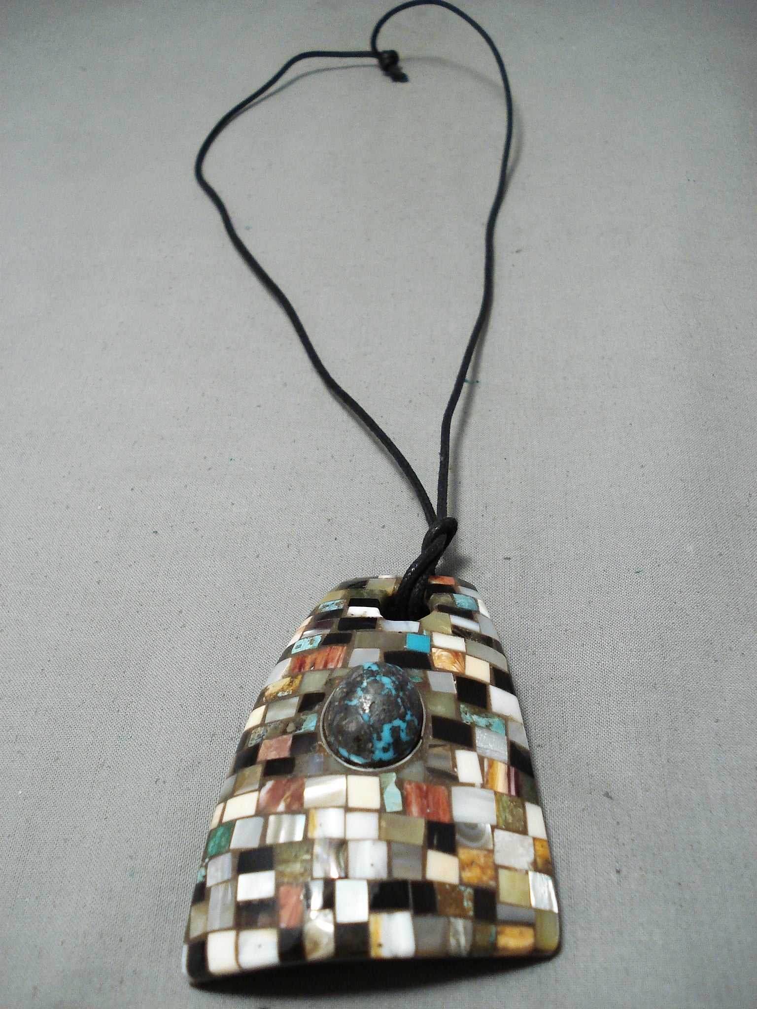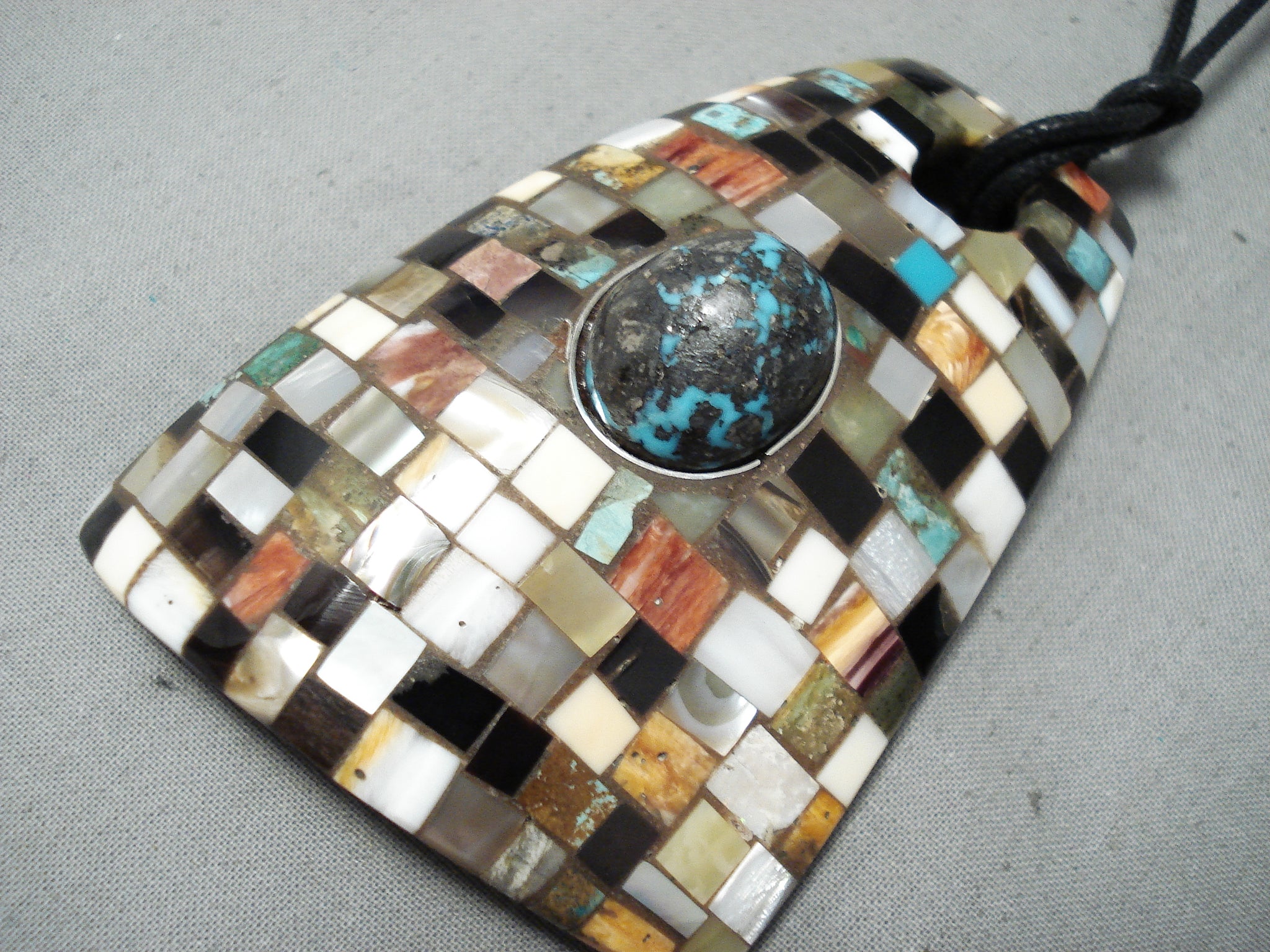 We are proud to offer this magnificent Zuni necklace having a large godber turquoise oval dome center surrounded by a handcarved silver border on a convex trapezoid pendant with inlay turquoise, coral, shell, jet and solid shell on the reverse side with a handmade black rope necklace. Absolutely Spectacular!! Pendant measures about 3-3/8" x 2-3/8". Turquoise stone measures around 3/4" x 5/8". Sterling silver. Signed by Zuni artist, Brian Tom. The length of the necklace measures around 32". Sturdy 56 grams.