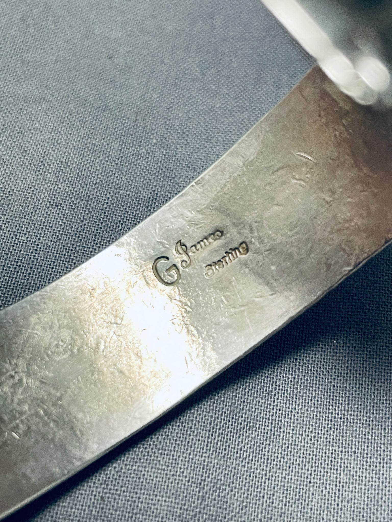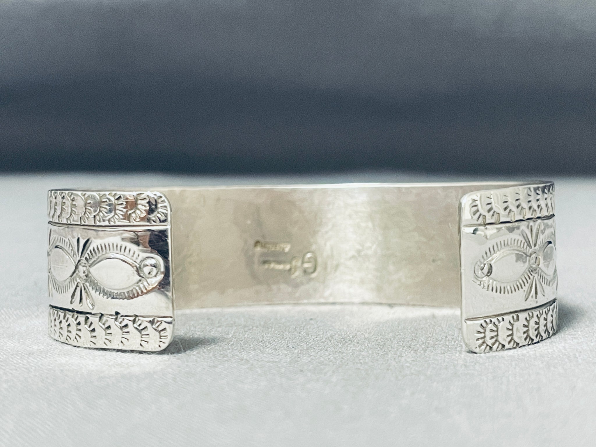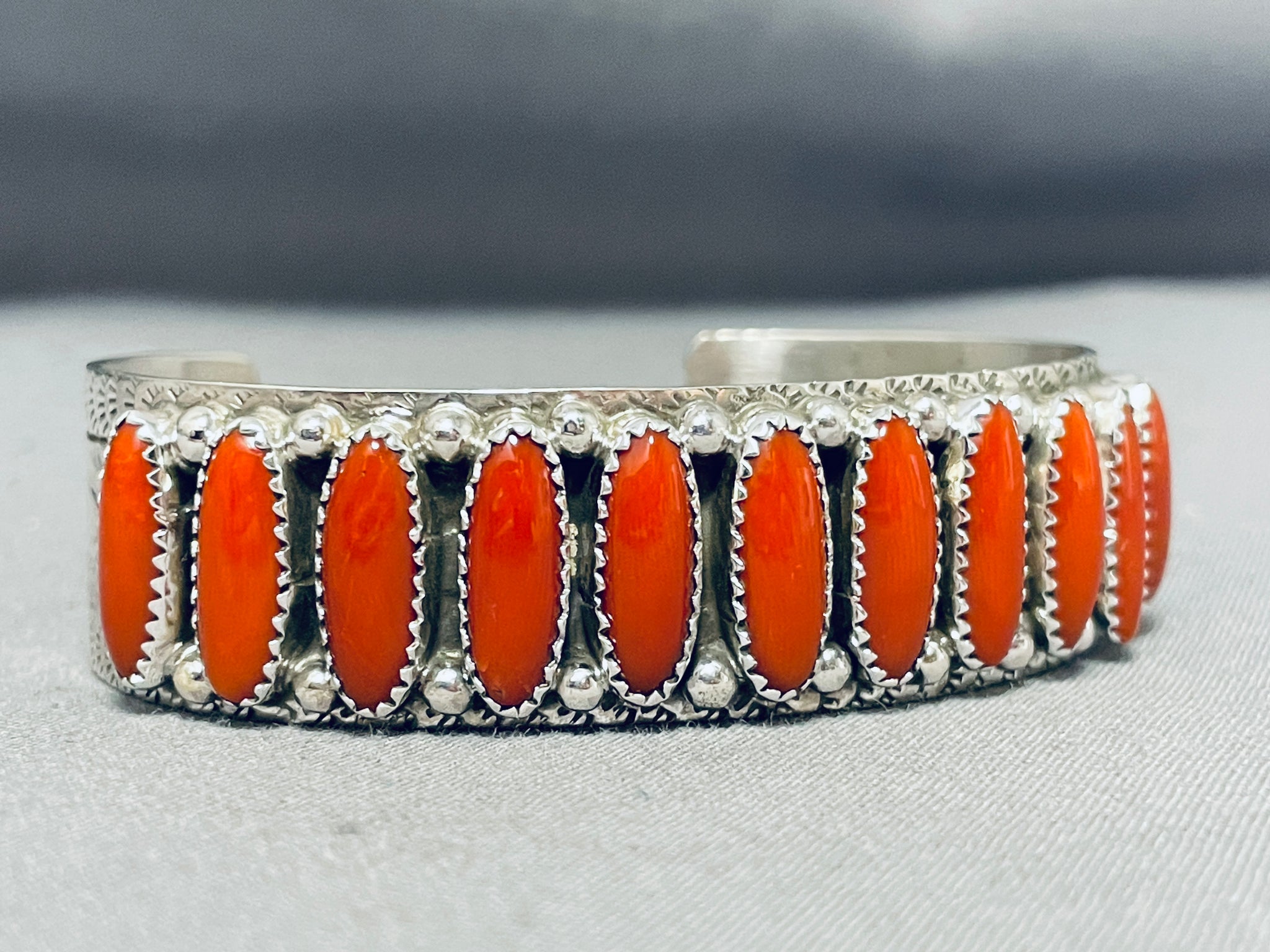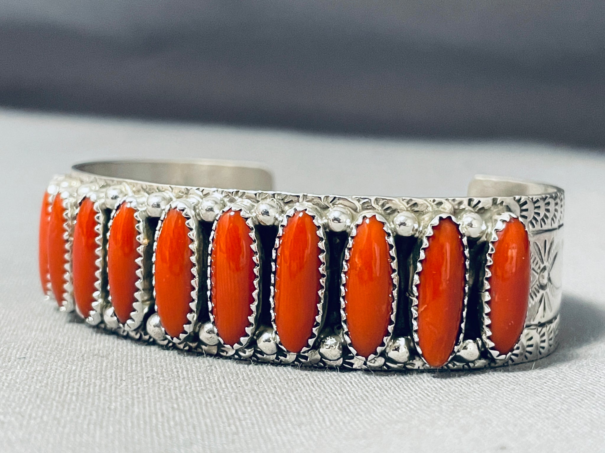 Here we have an exquisite Navajo bracelet featuring coral stones, handcarved silver beads, and an ornately handstamped solid silver cuff! Truly Eye-Catching! The stones measure around 5/8" x 1/4". The width of the bracelet measures around 3/4". Signed by Navajo artist, G. James. Sterling silver, marked. The inside end to end measures around 5-5/8" with an additional 1-3/8" gap. Sturdy 39 grams.