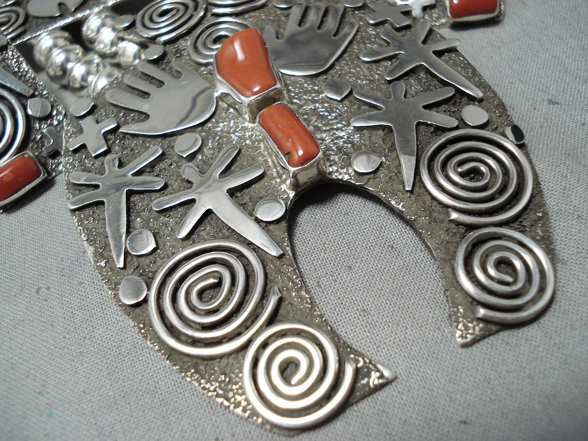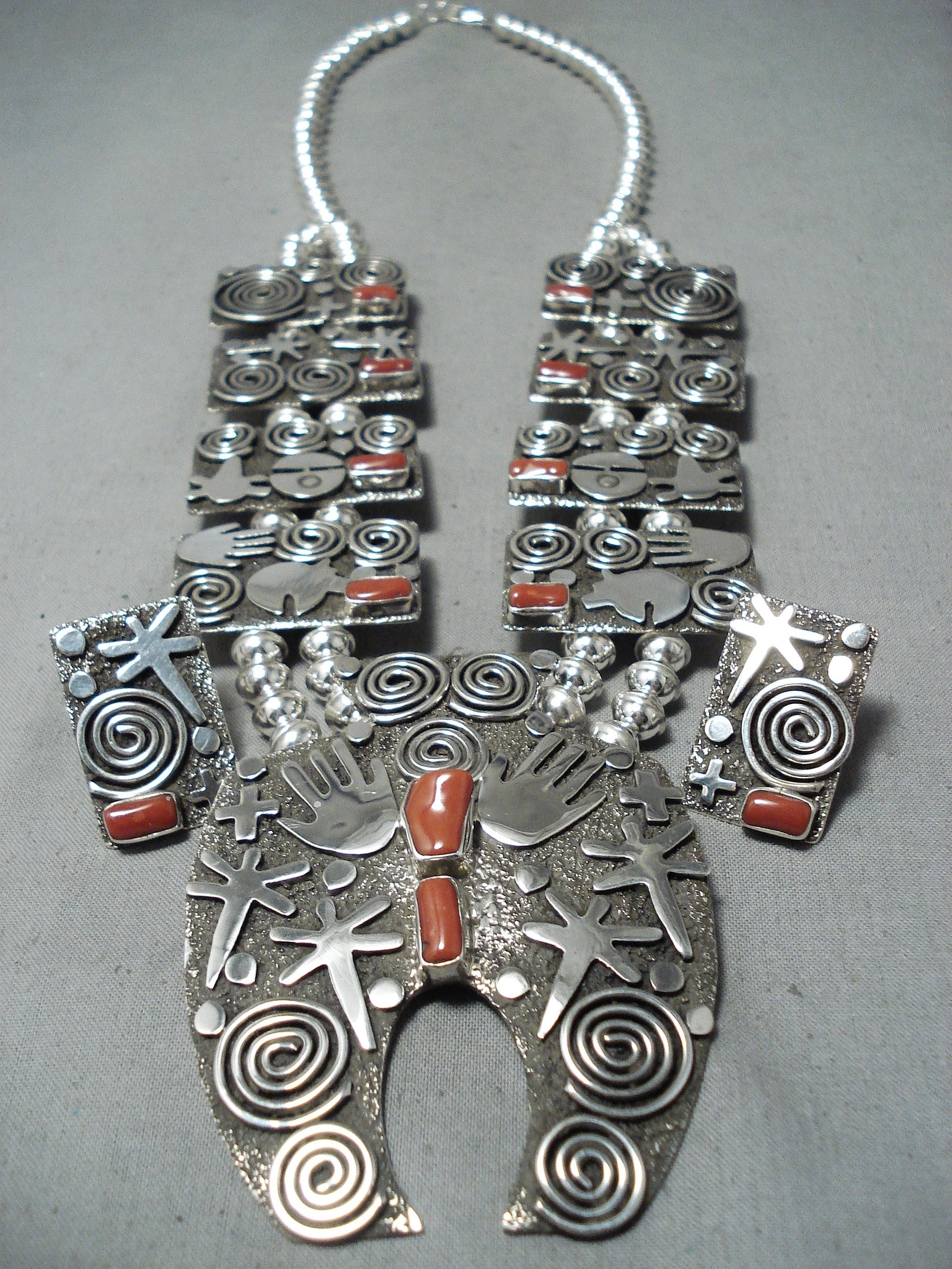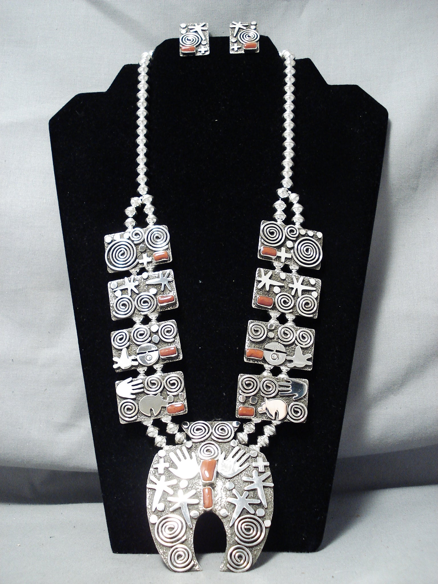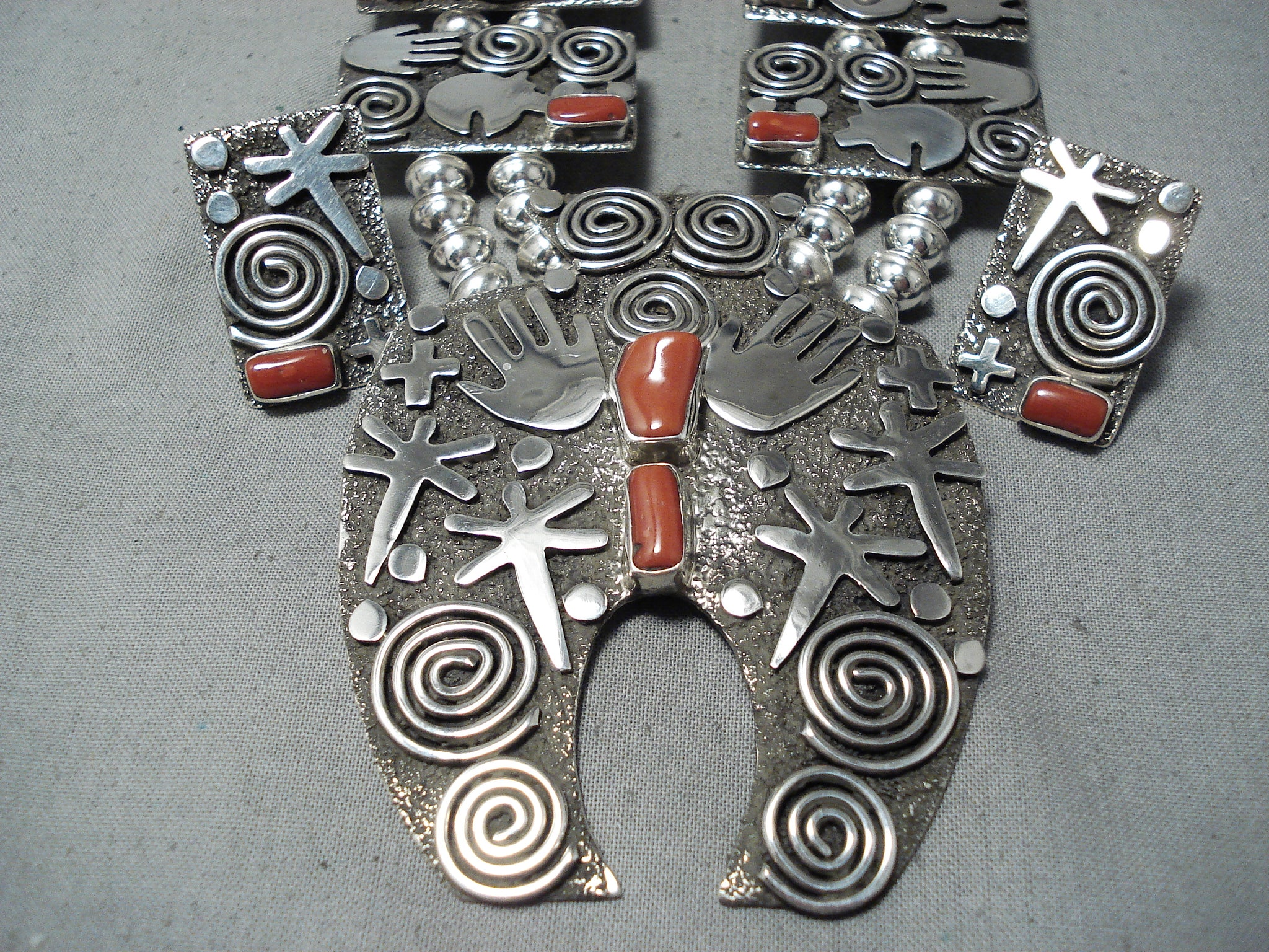 Important Native American Navajo Al Sanchez Coral Sterling Silver Squash Blossom Necklace