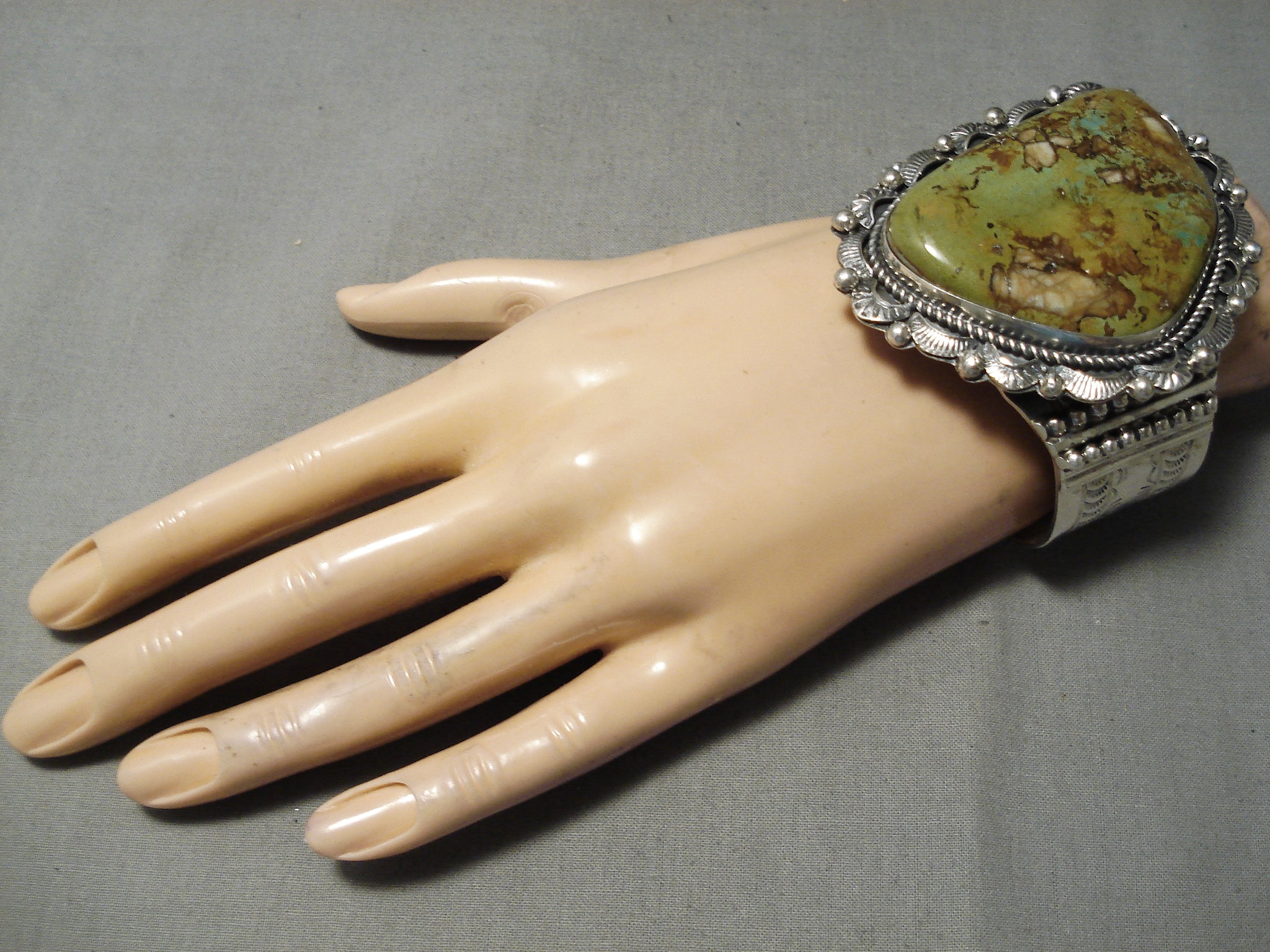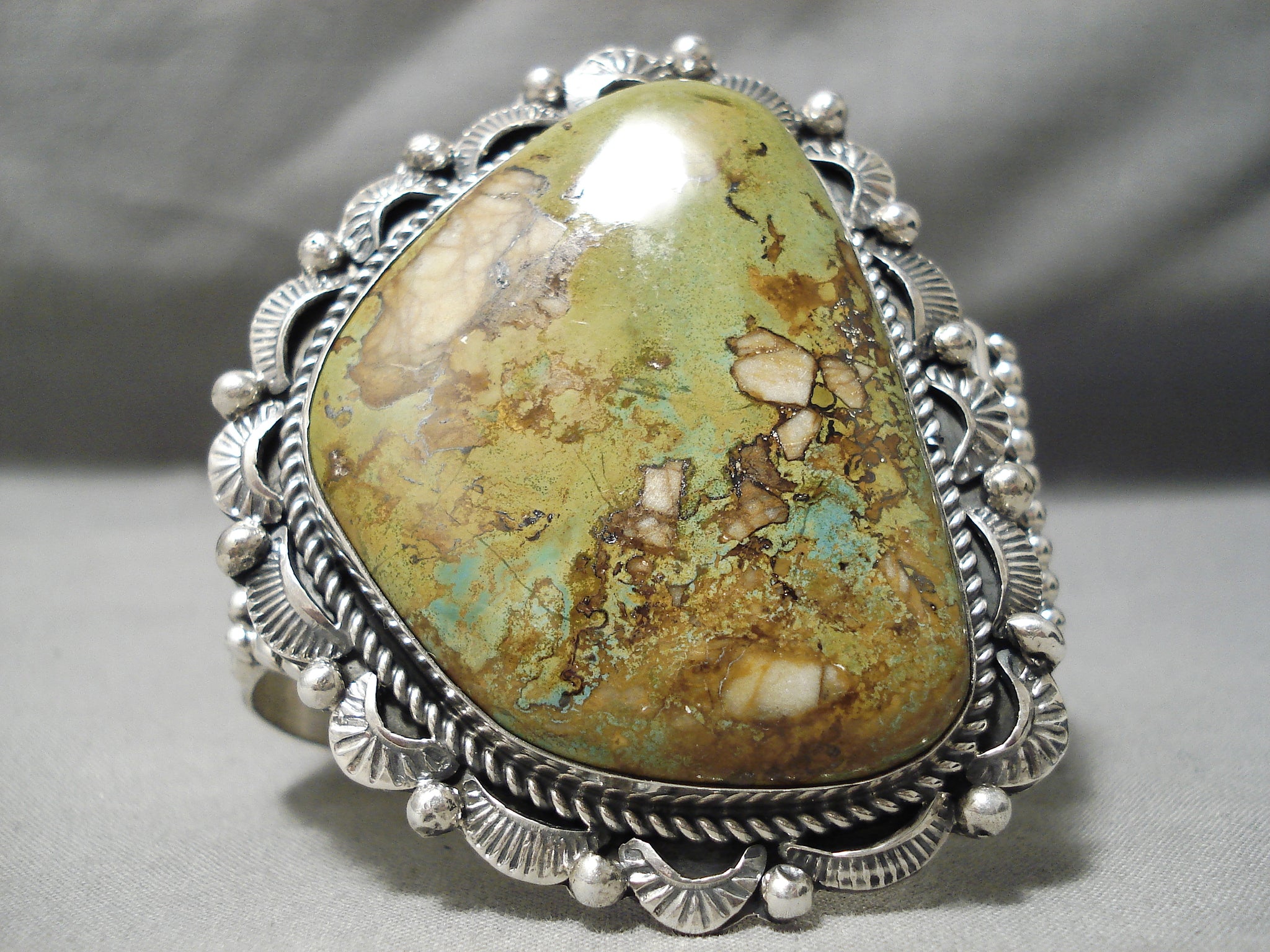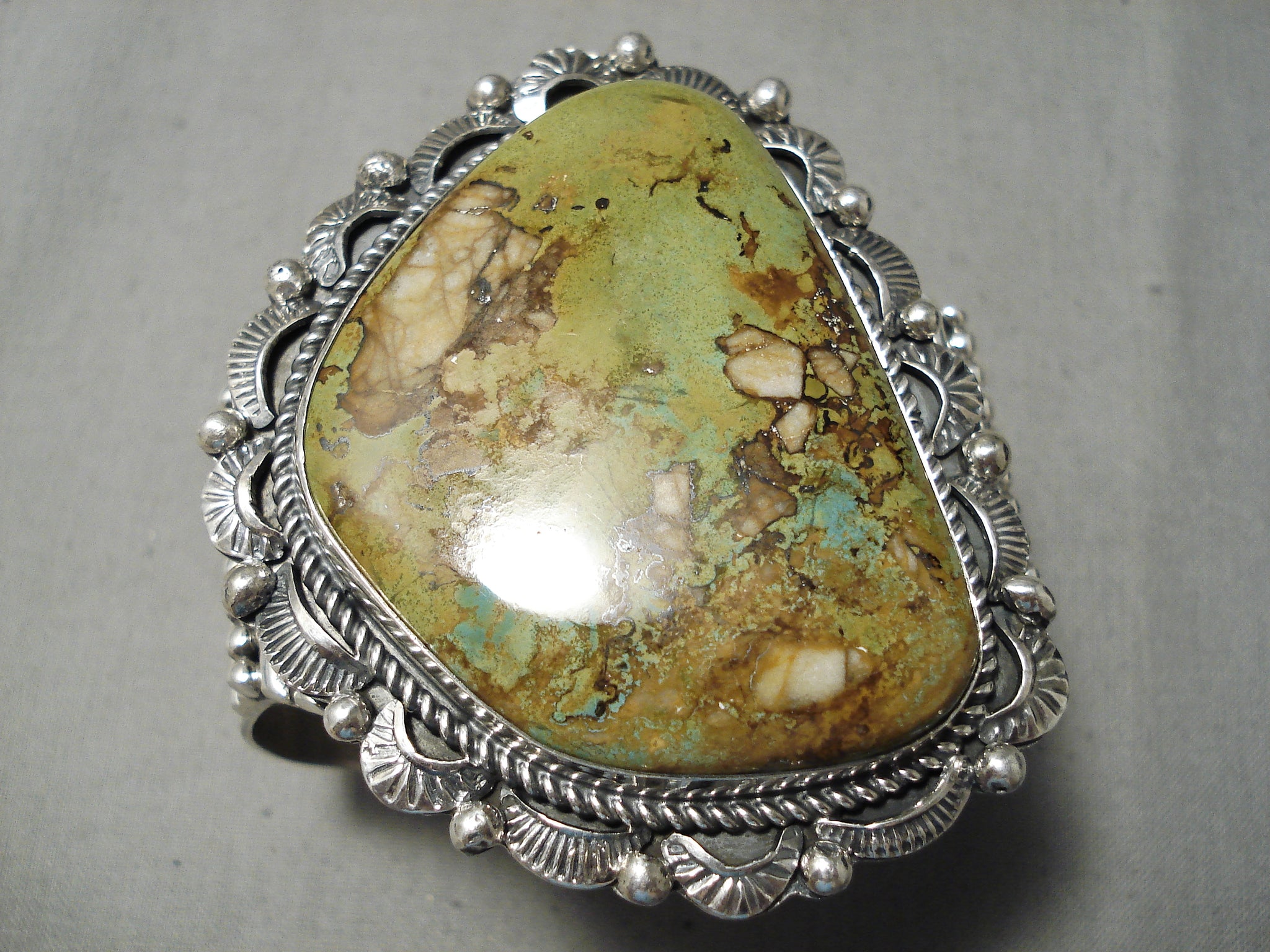 This is an astonishing Navajo silver bracelet. Initially surrounded with thick silver rope and then a created scalloped border of alternating silver beads and dimensional silver arches, this huge Royston turquoise stone is sure to create quite a conversation! The stone is then flanked on either side with vertical silver bead and bar borders. The center stone measures around 2" x 1-5/8". The width of the bracelet measures around 2-5/8". Signed by Navajo artist, Herman Smith. Sterling silver, marked. The inside end to end measures around 5-7/8" with an additional 1" gap. Sturdy 118 grams.