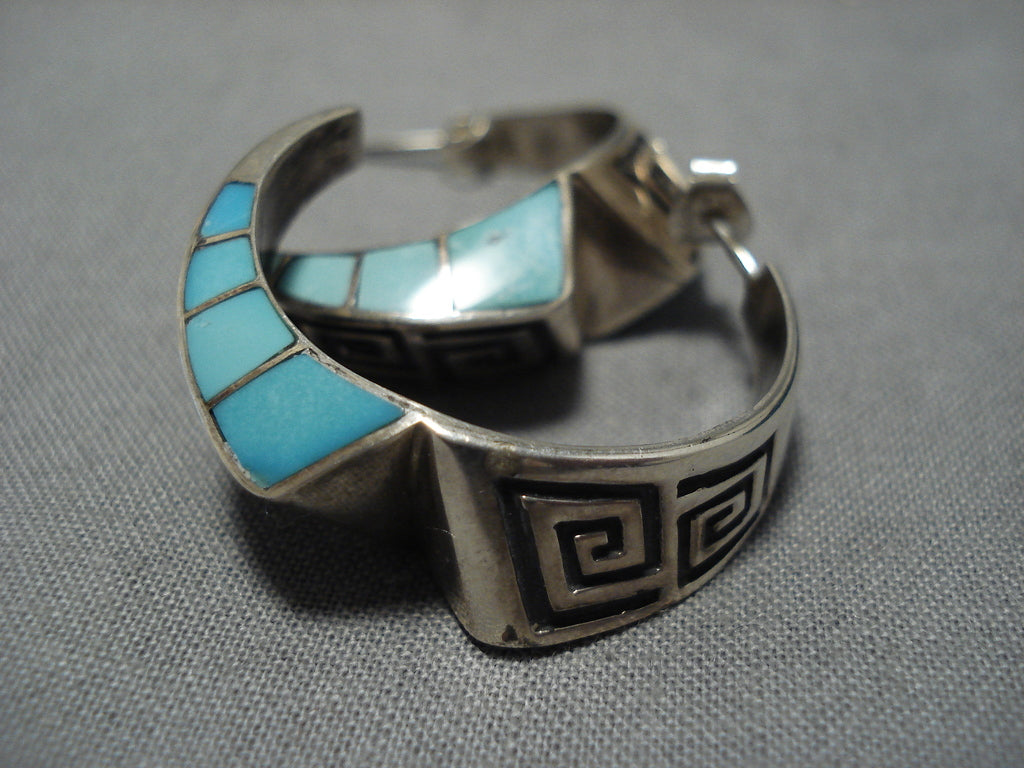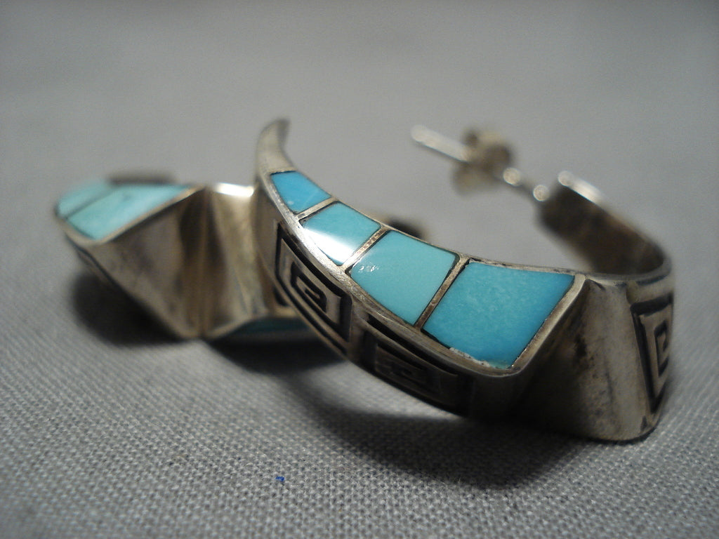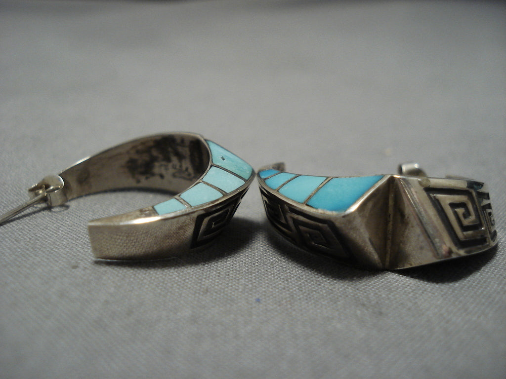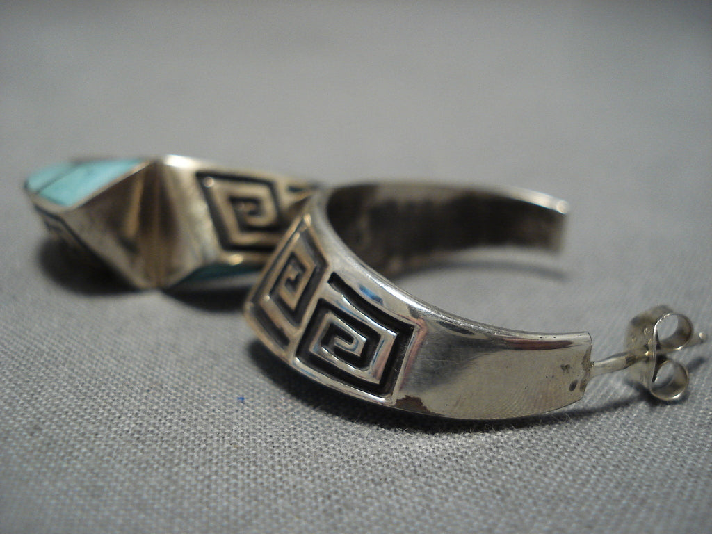 Important!! Native American Navajo Lonn Parker Green Turquoise Inlay Sterling Silver Earrings