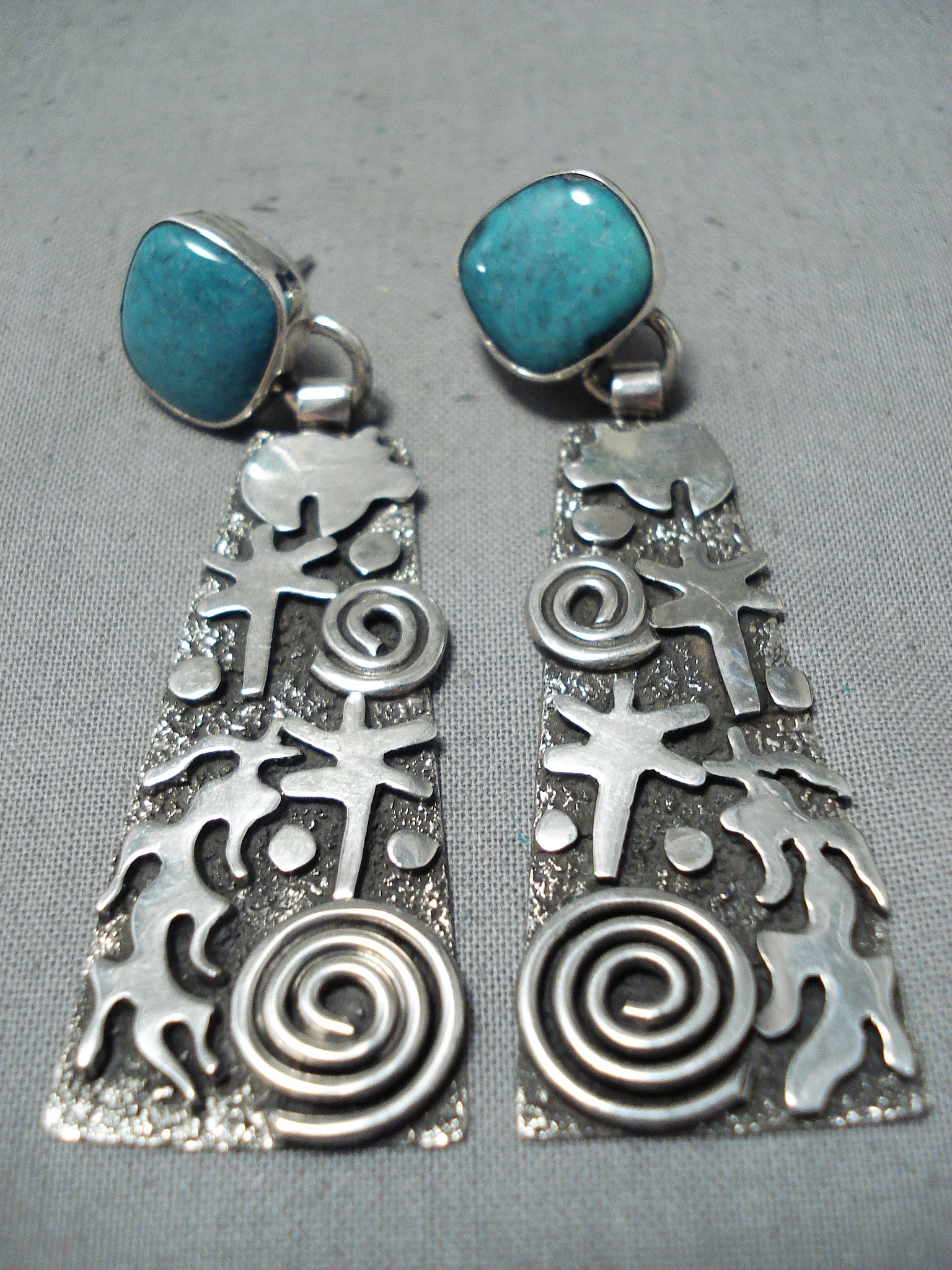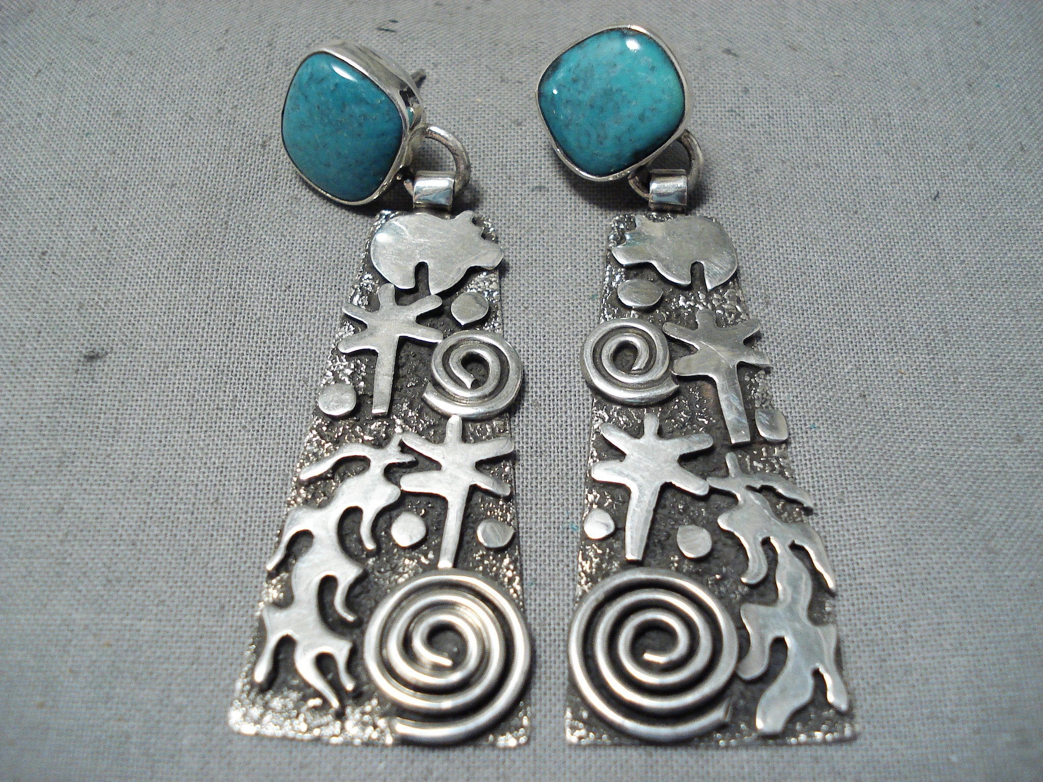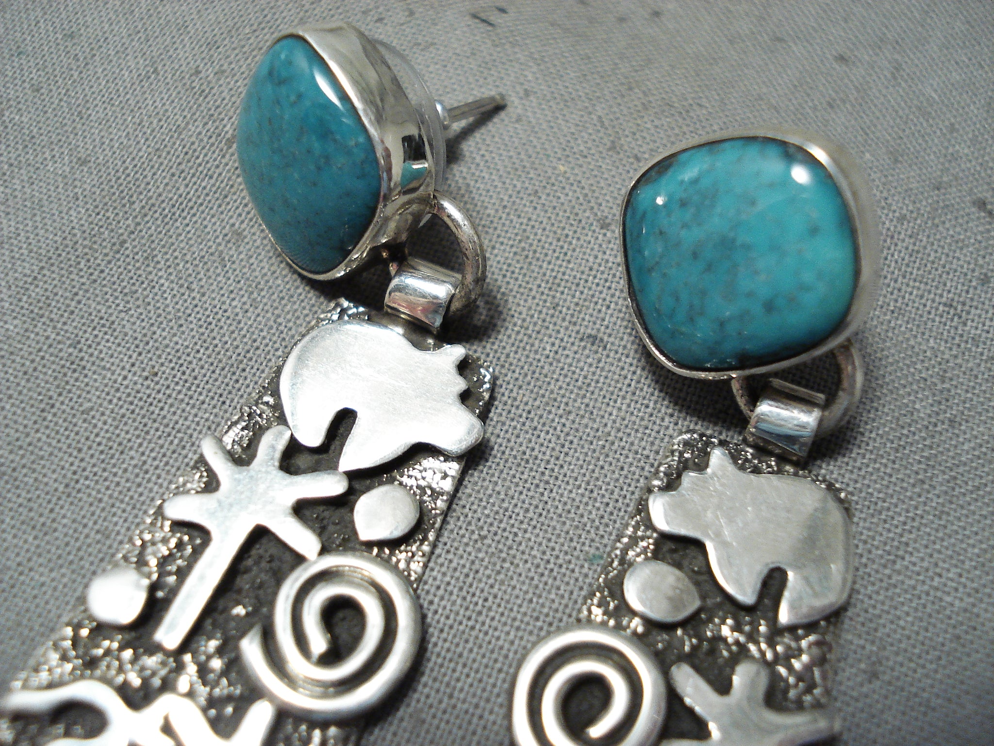 Important Native American Navajo Old Kingman Turquoise Sterling Silver Earrings
