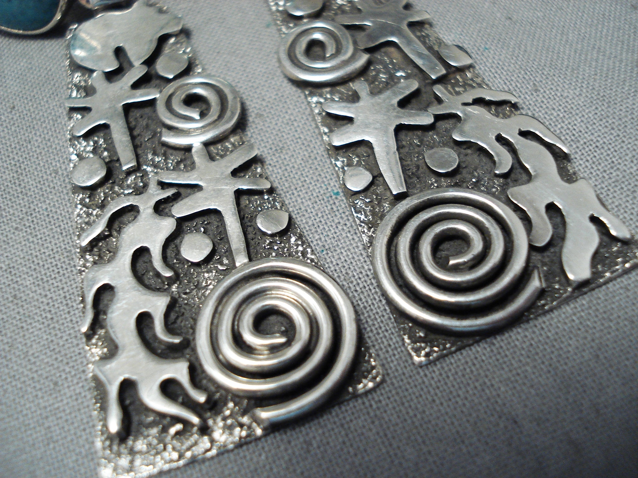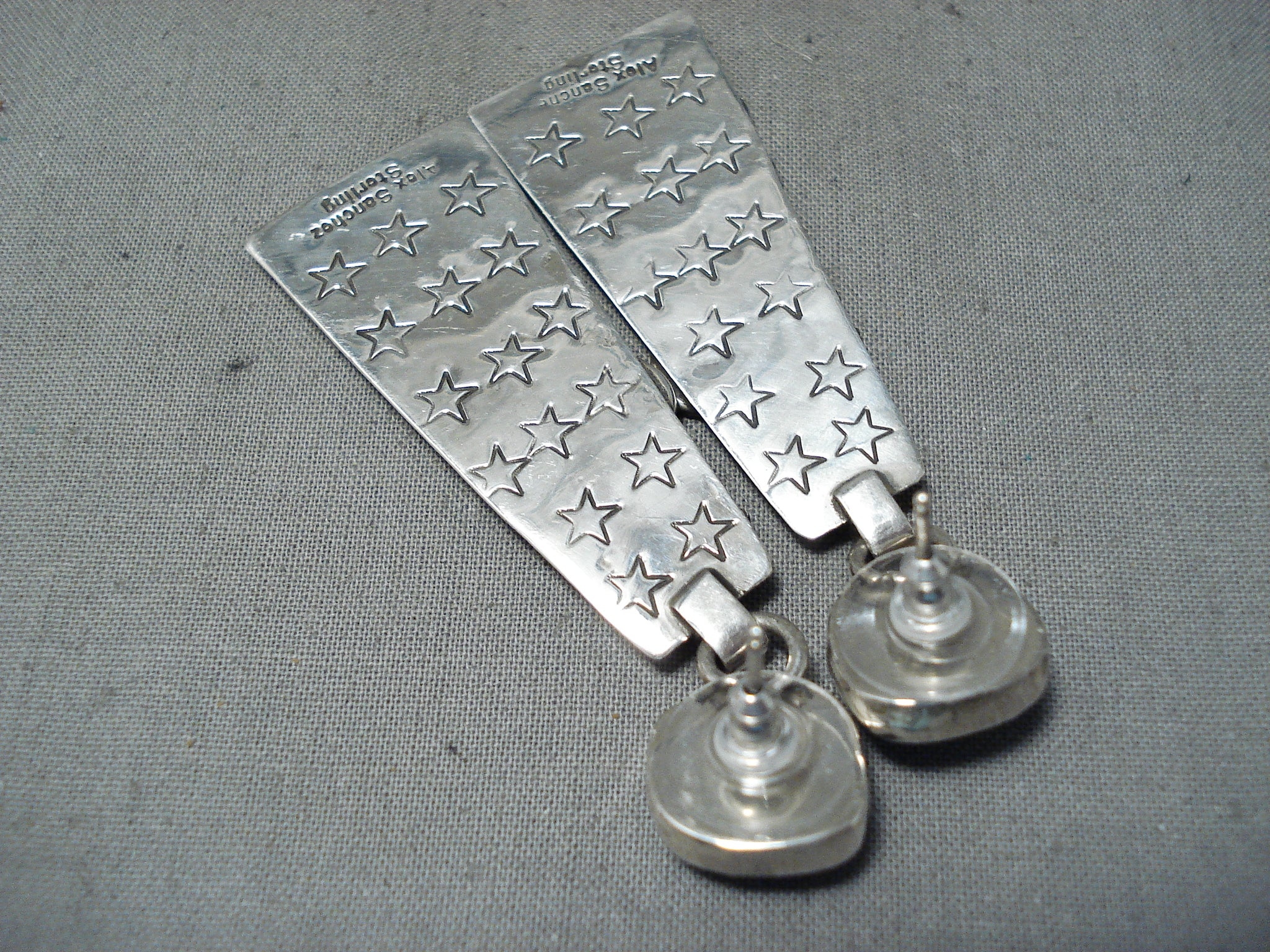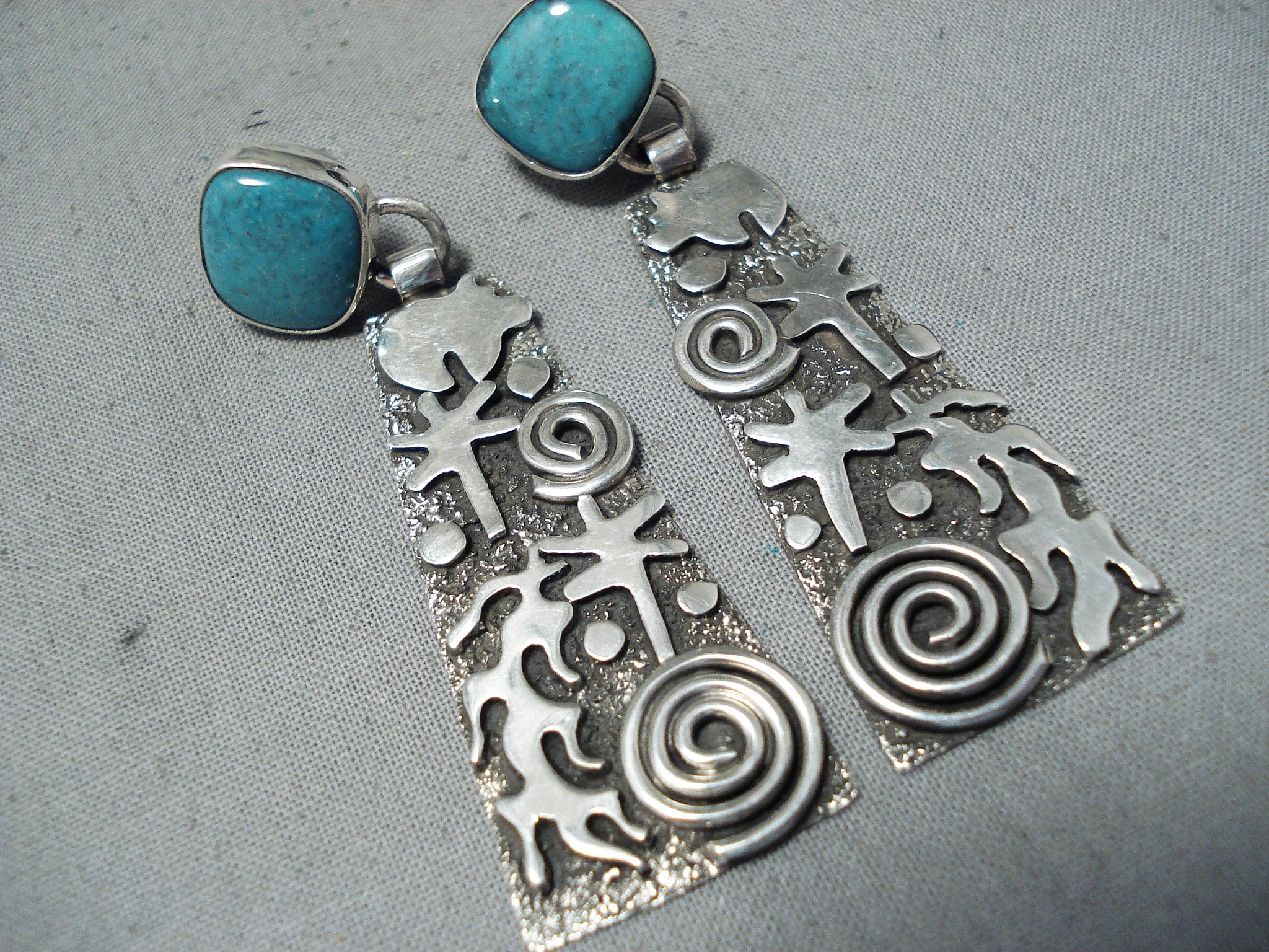 Important Native American Navajo Old Kingman Turquoise Sterling Silver Earrings