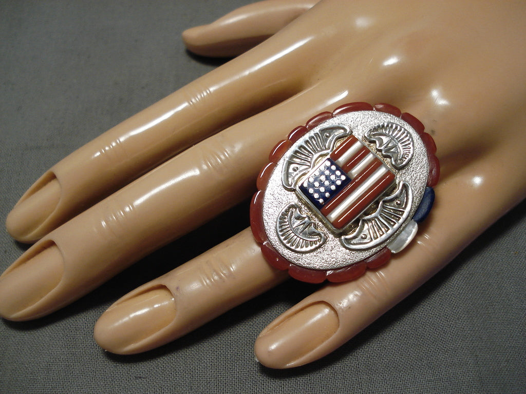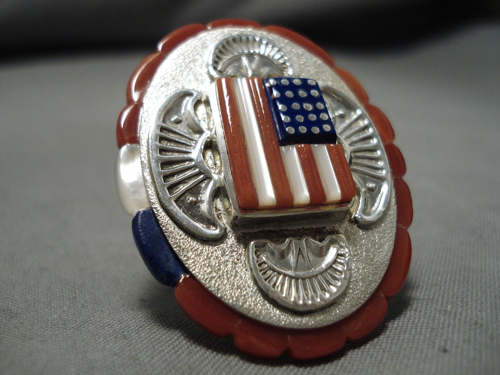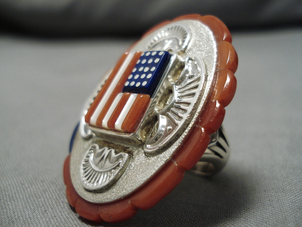 Important Native American Navajo Red White Blue Lapis Coral Sterling Silver Ring