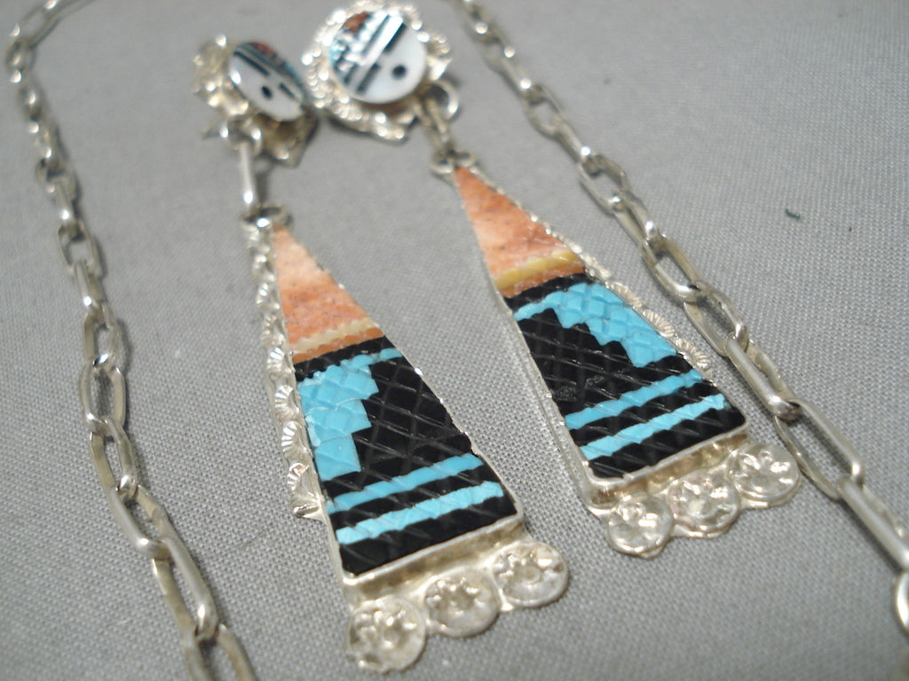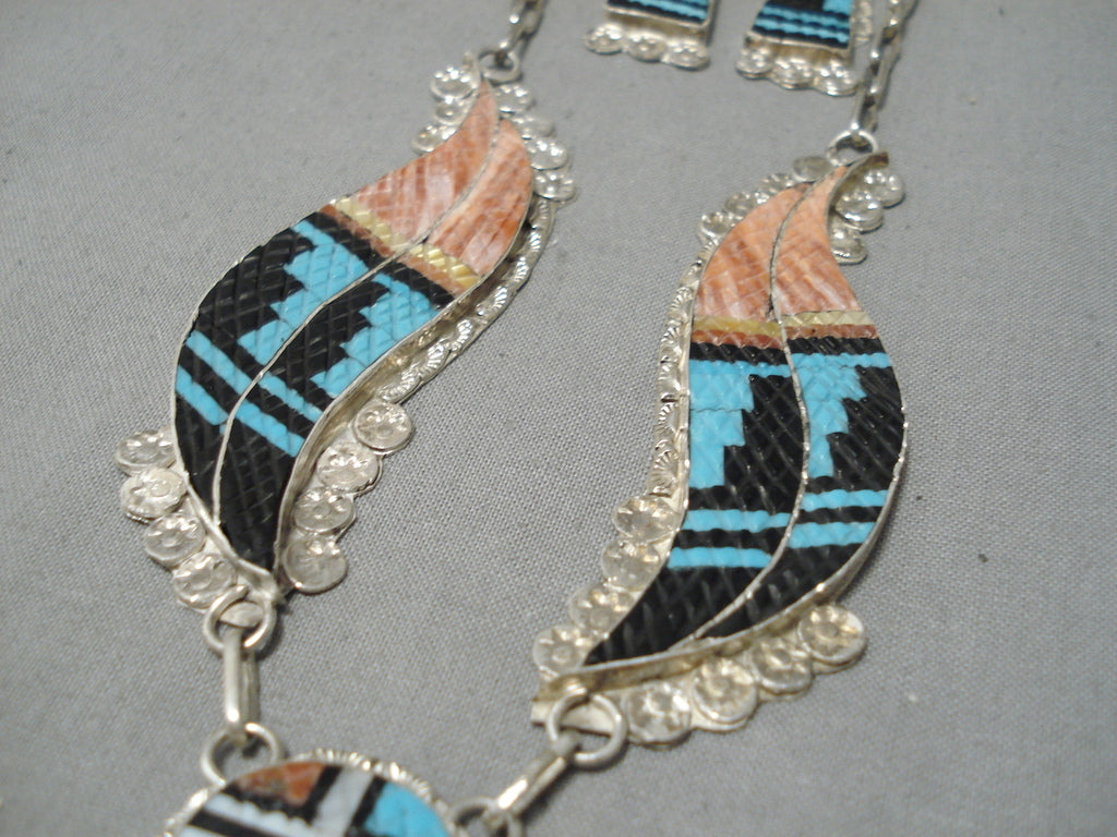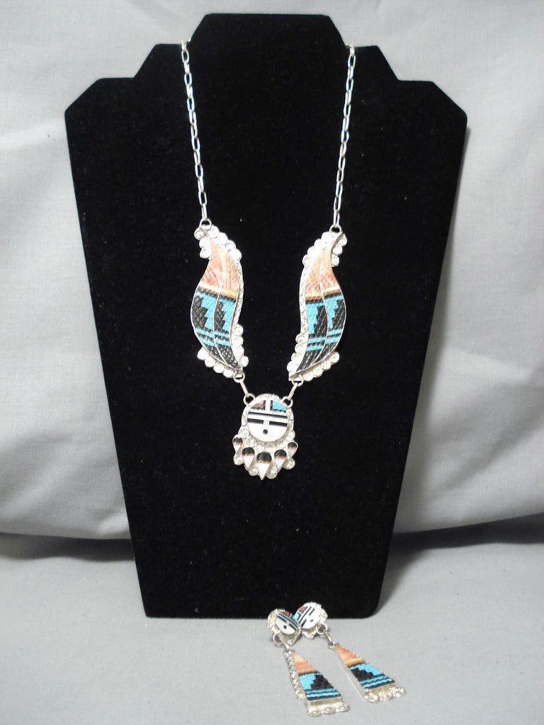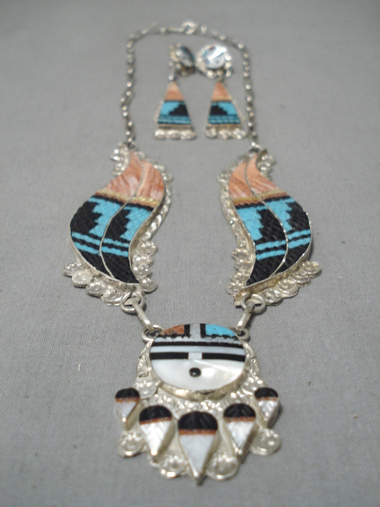 Important Native American Zuni Eldred Martinez Turquoise Coral Sterling Silver Necklace Earrings
