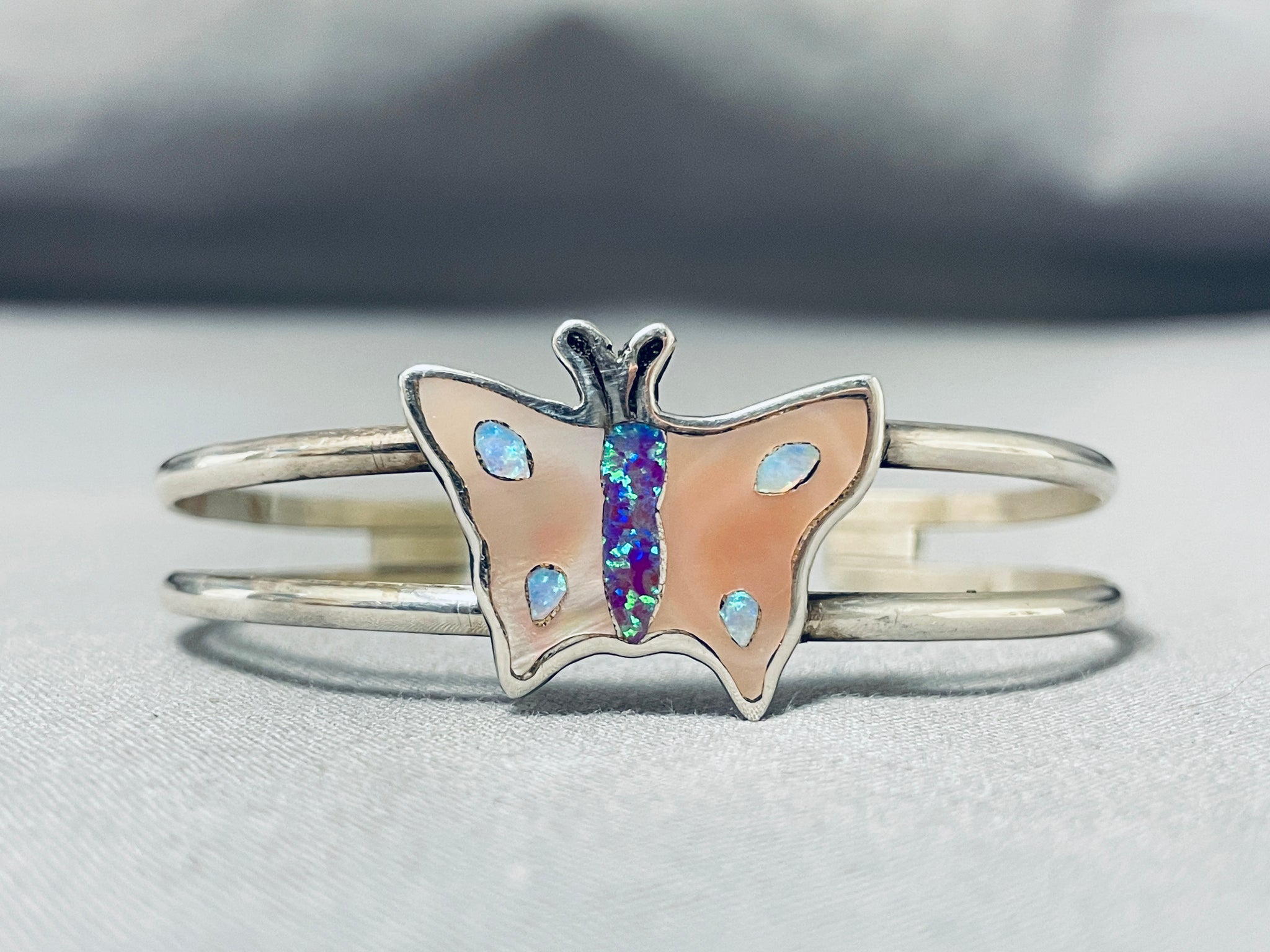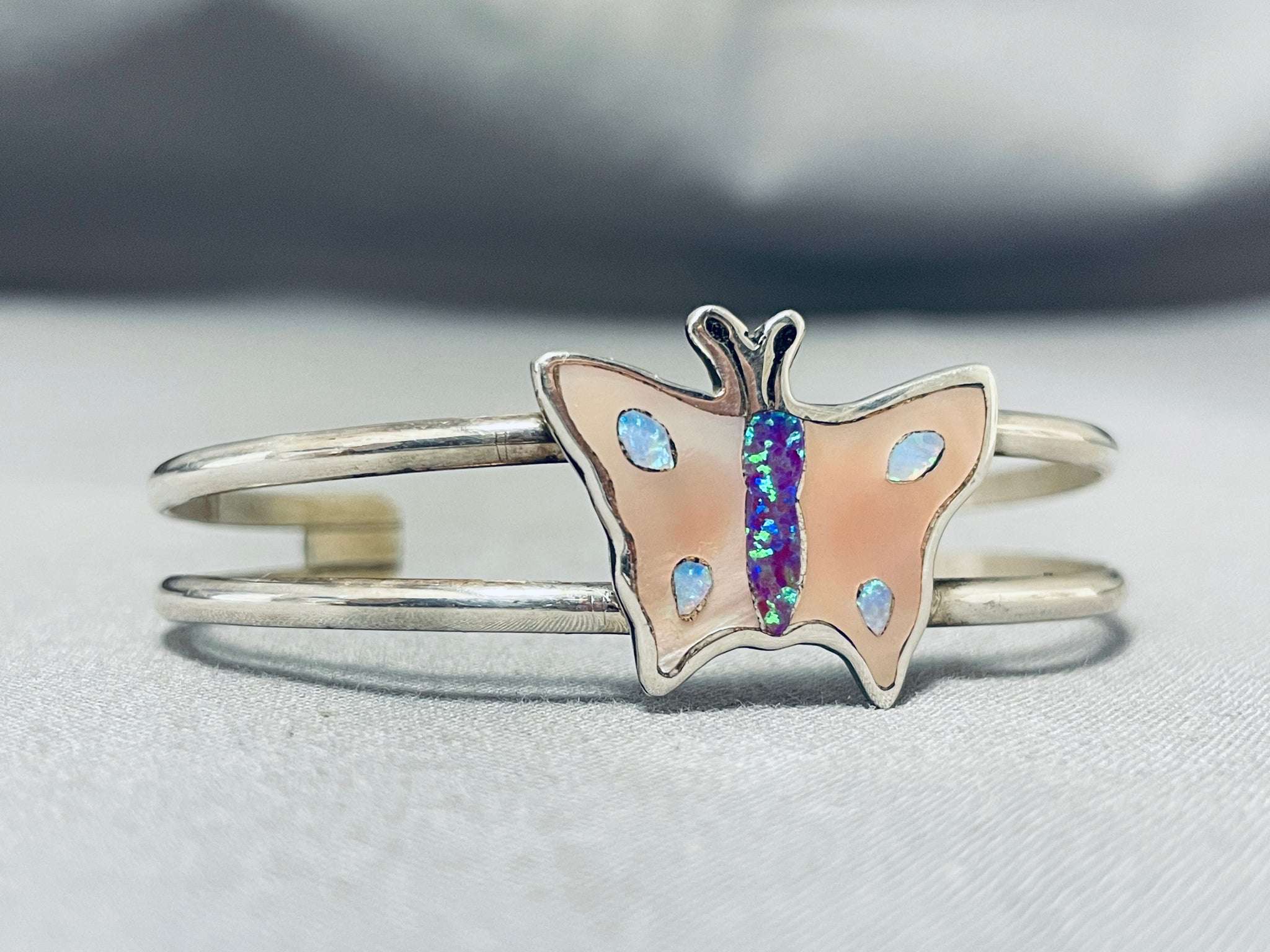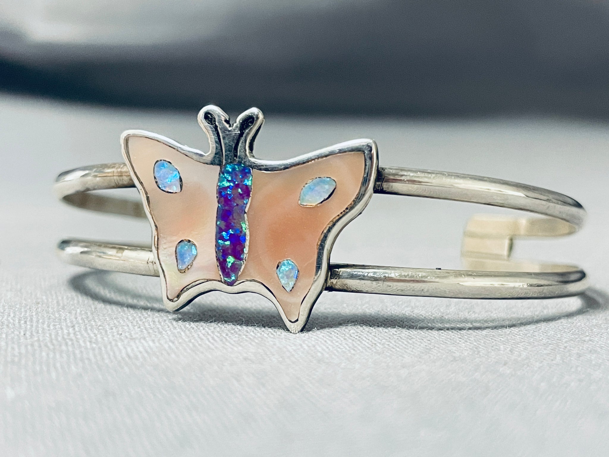 Important Native American Zuni Inlay Mother Of Pearl Butterfly Sterling Silver Bracelet