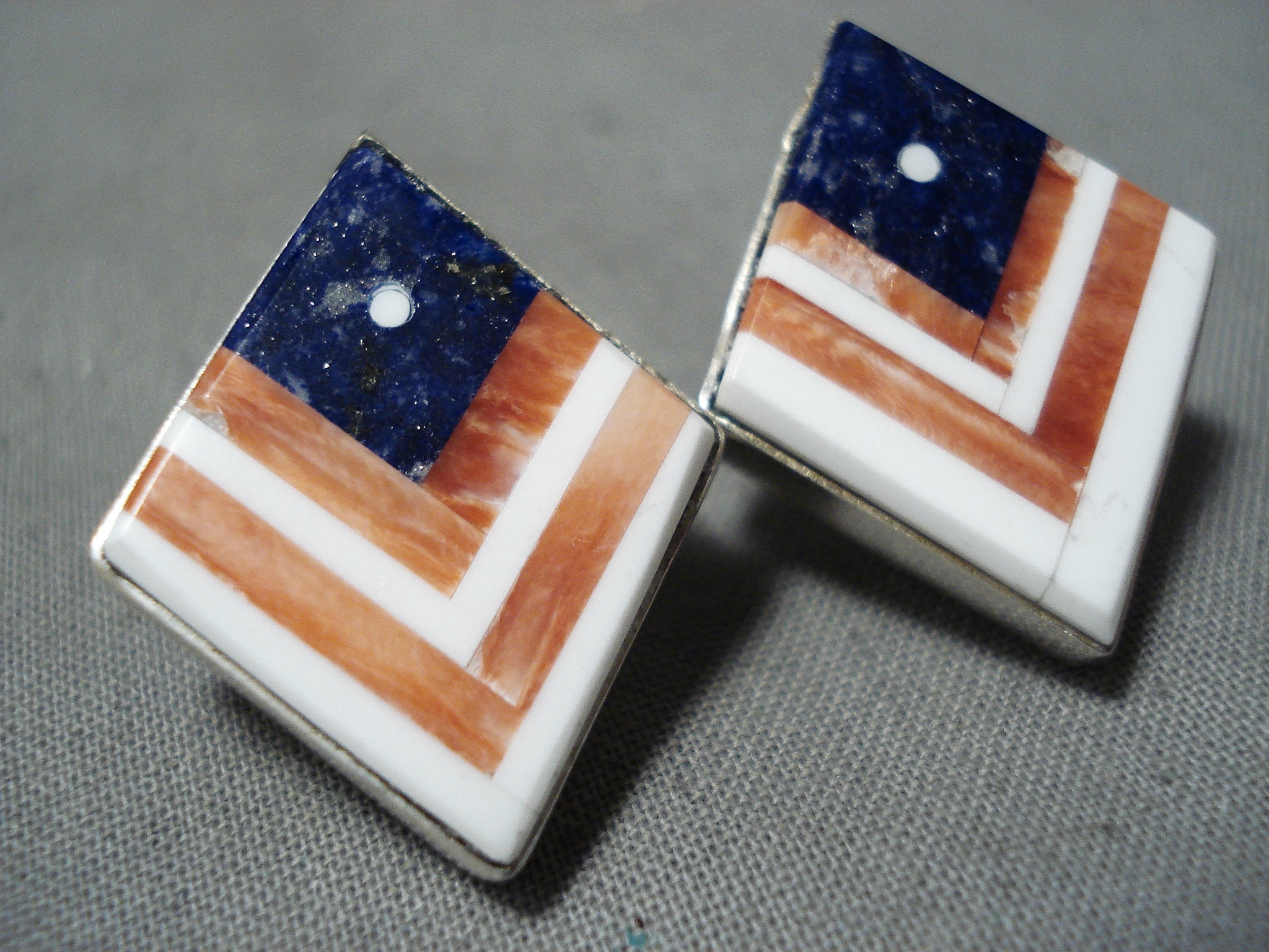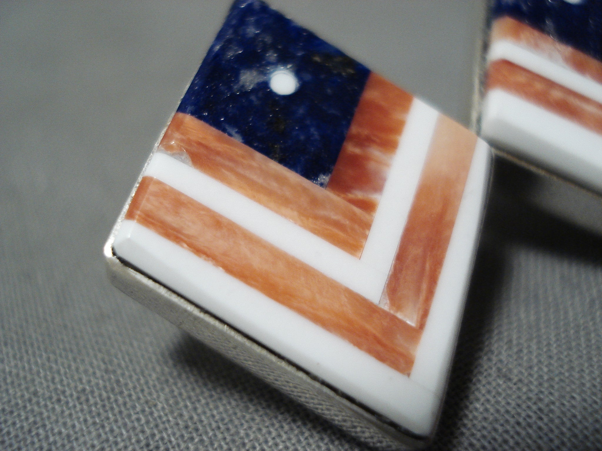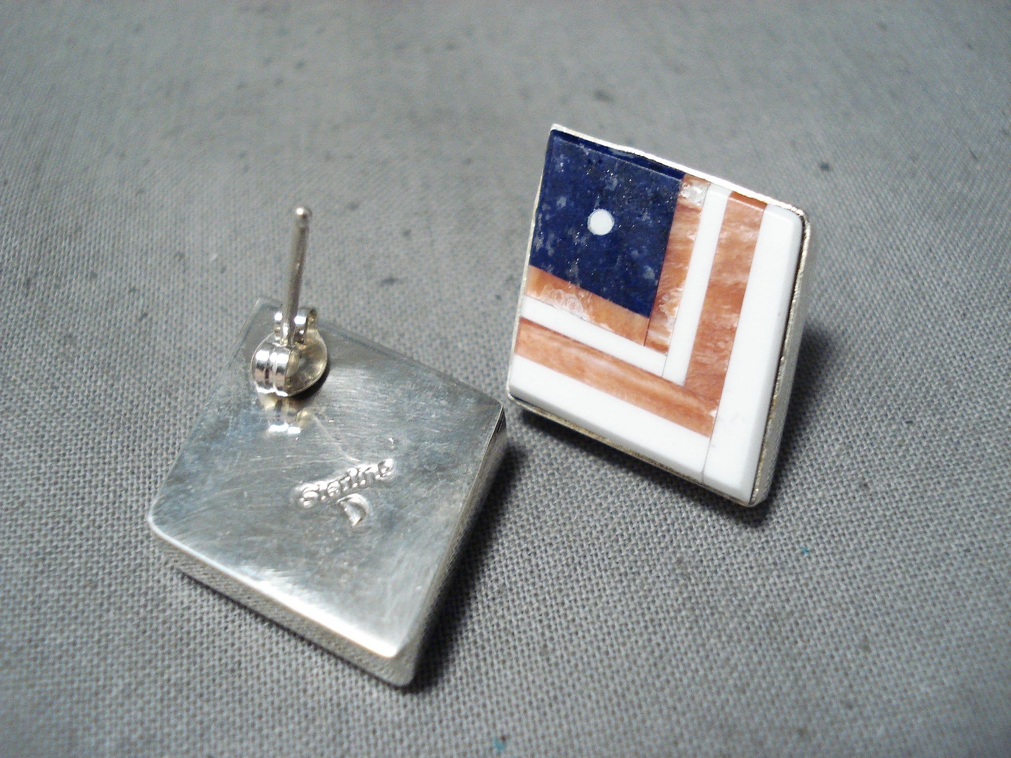 Important Navajo Lapis Flag Sterling Silver Flag Earrings Native American