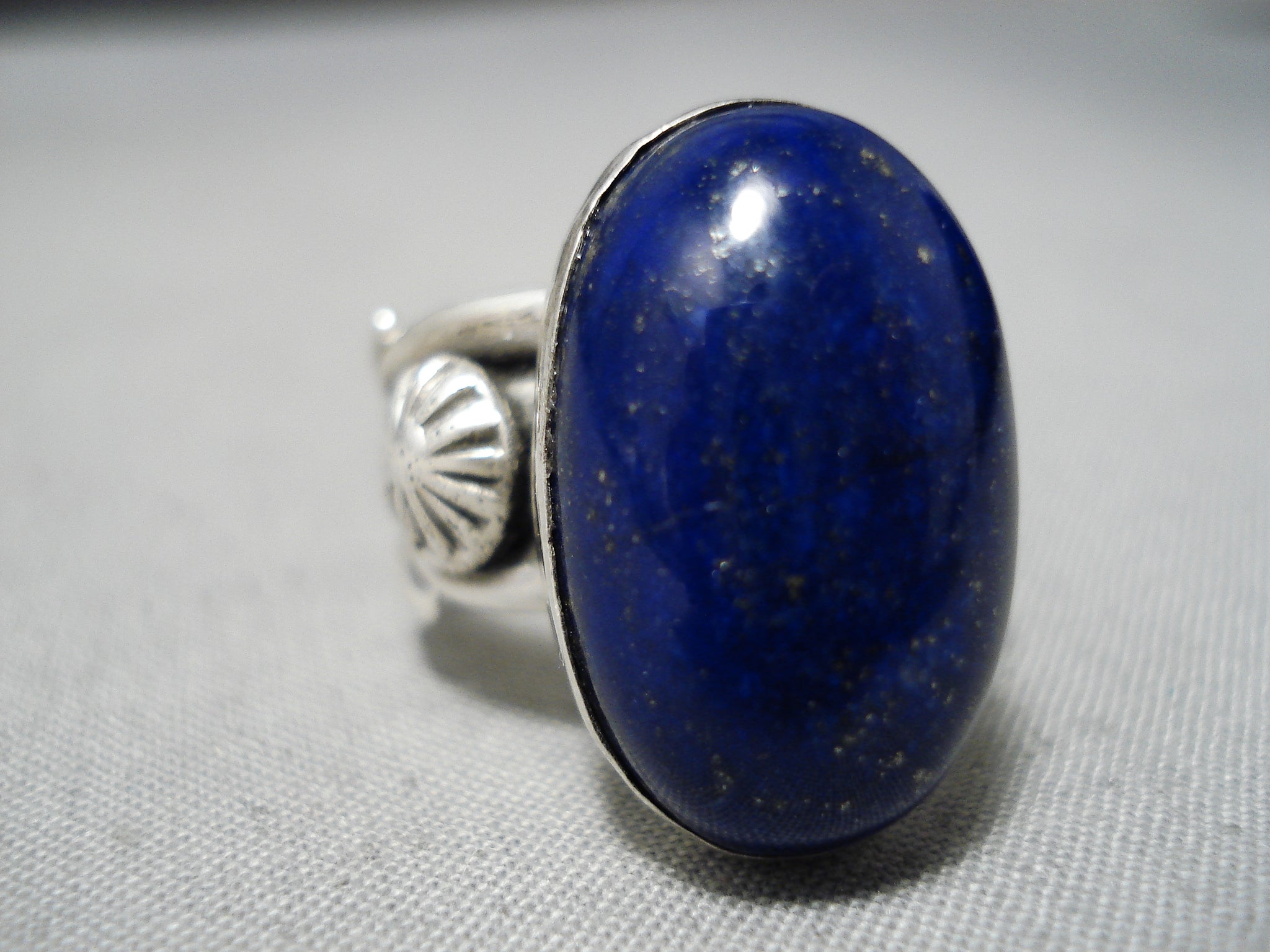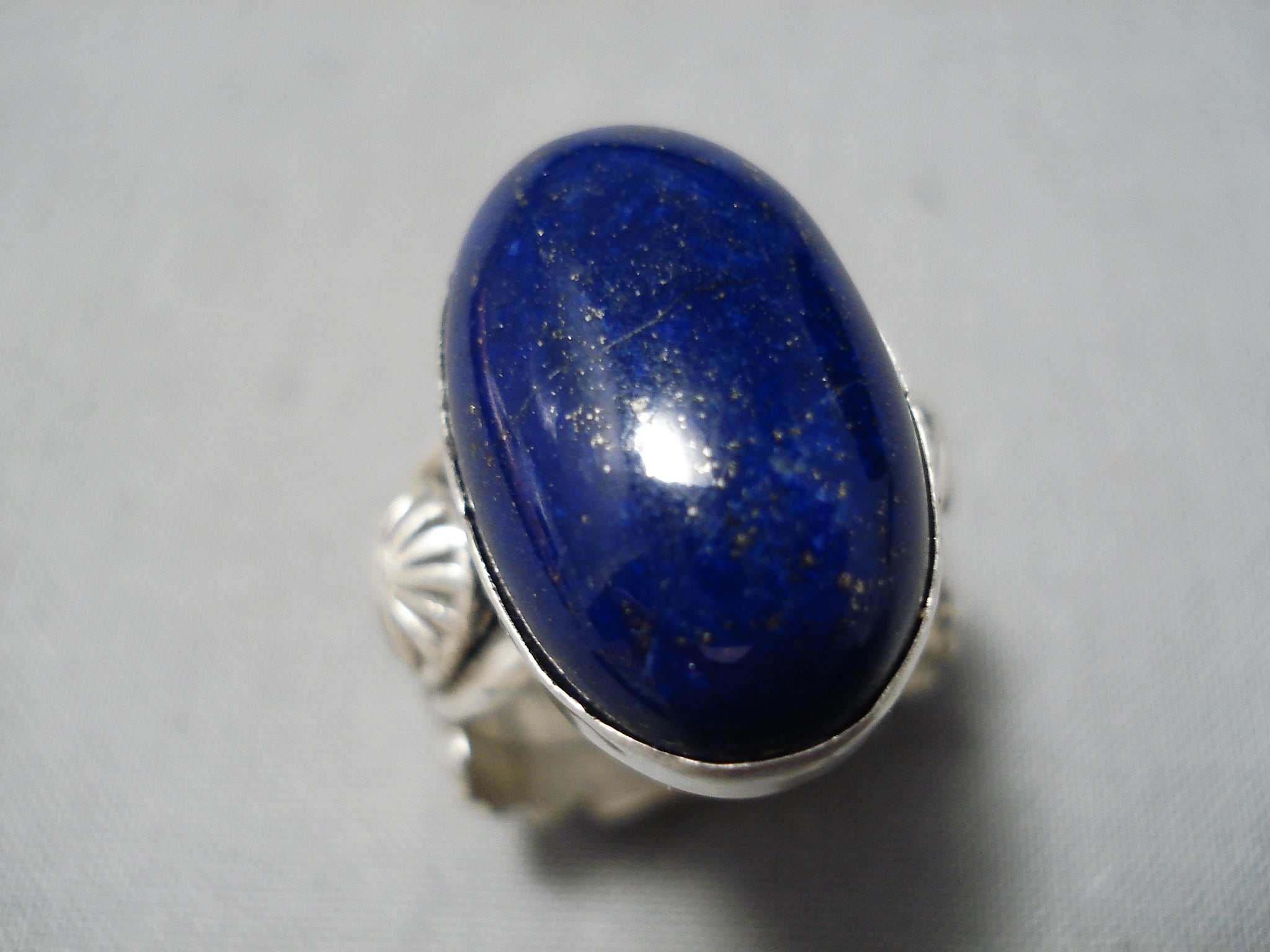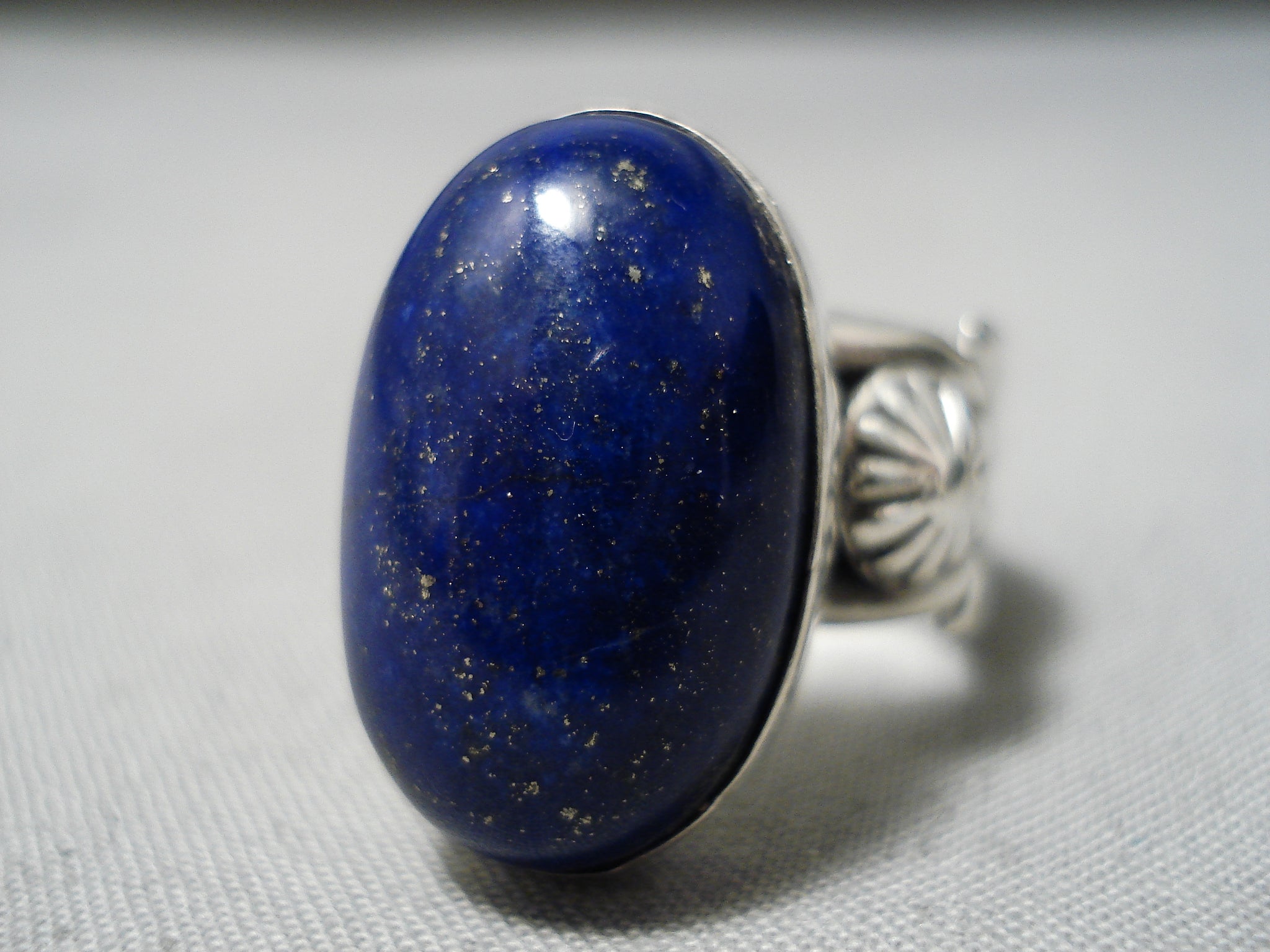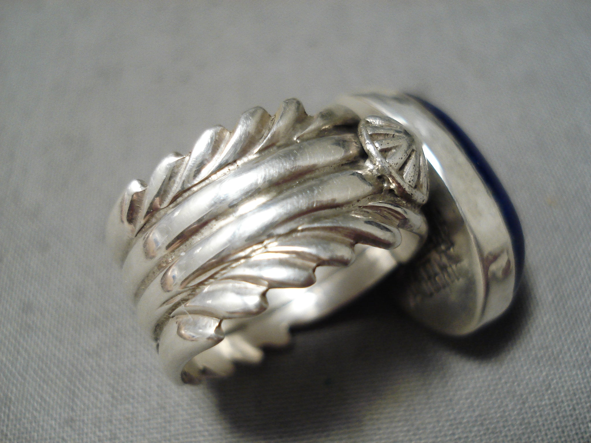 Here we have an incredible Navajo silver ring having a large lapis oval, silver star flanks on the handcarved solid silver band! Very Unique! The center stone measures around 7/8" x 1/2". Signed by Navajo artist, Ben Begaye. The ring size is around 9. Sterling silver, marked. Sturdy 14 grams.