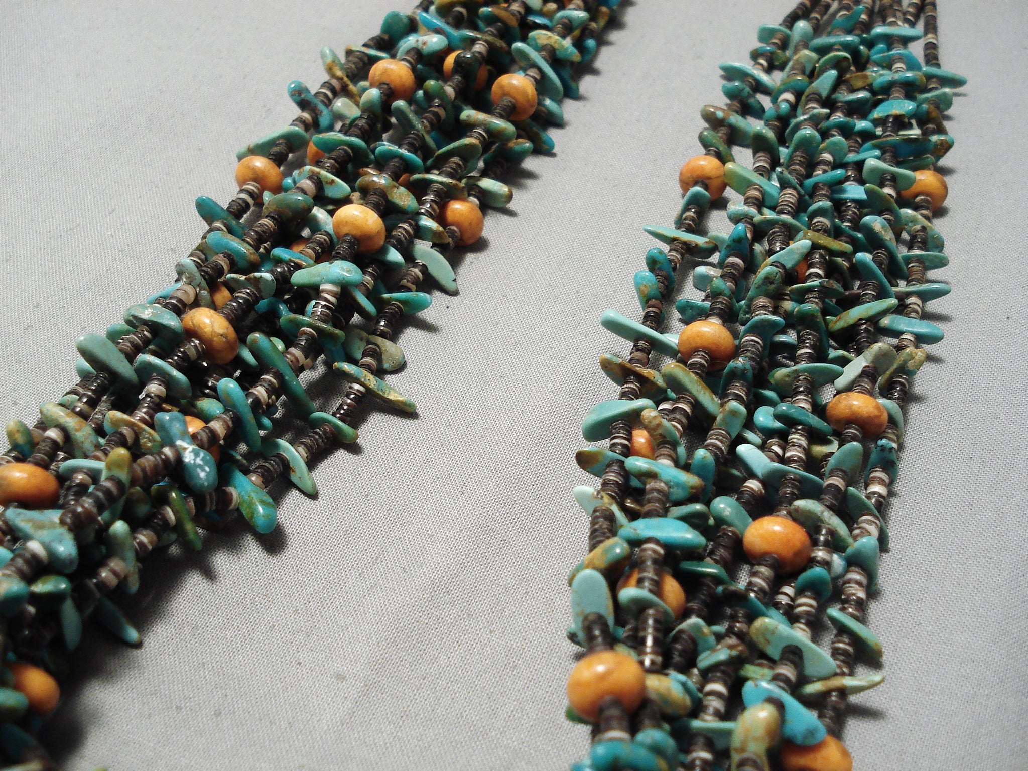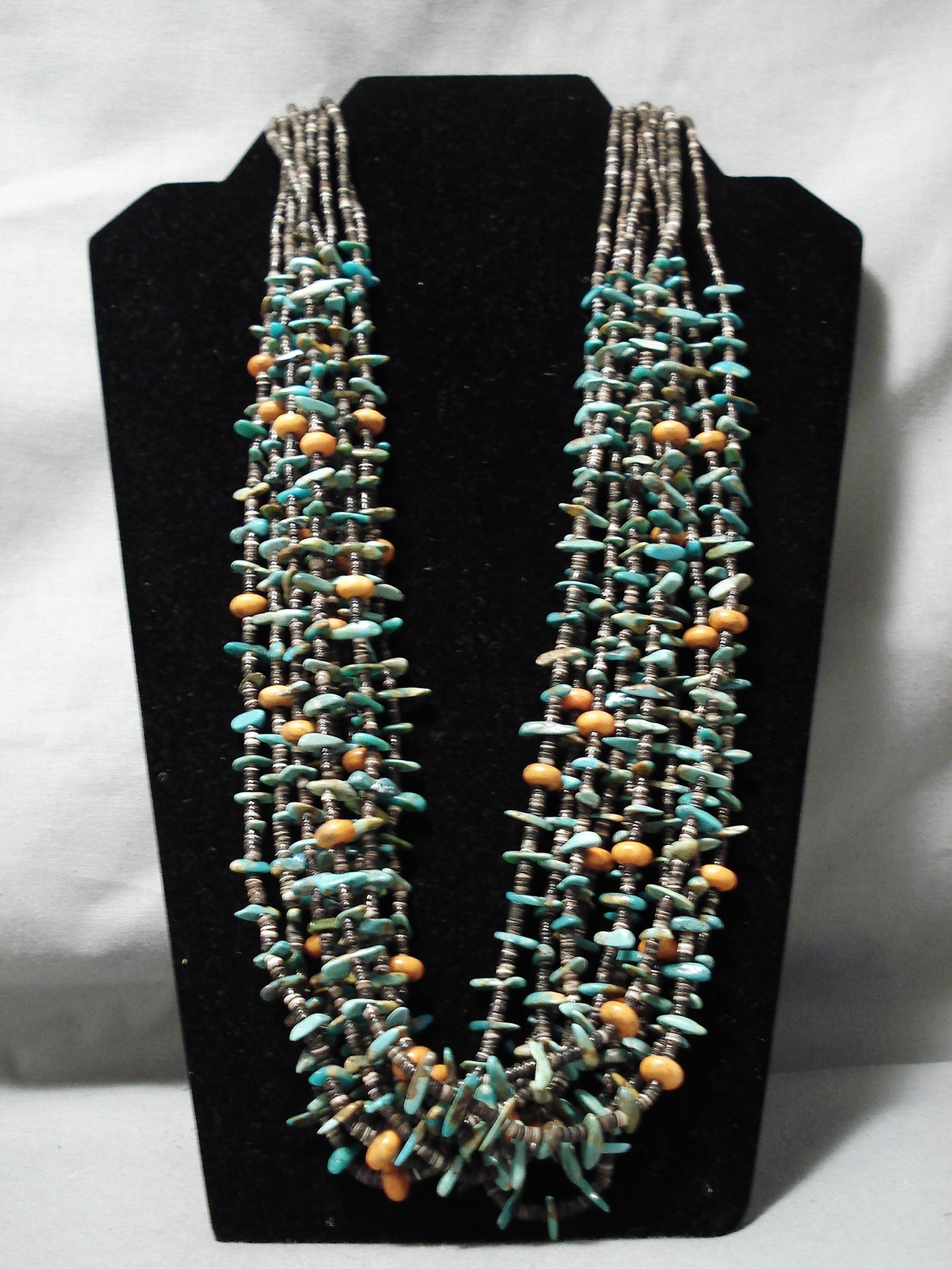 This is an impressive vintage Navajo turquoise and shell necklace handmade by the famous artist, Rye Whitegoat. Rye is one of the best necklace artists of our time. This necklace contains 10 strands of absolutely stunning green turquoise stones that appear to be from the Royston turquoise mine with amazing orange spiny oyster or shells or orange coral stones. Situated throughout the stones are remarkble white to brown shell heishi. This necklace contains a fabulous hand braided neck piece that will last for generations to come. Cir. 1970's+. Navajo artist, Rye Whitegoat . The length of the necklace measures around 34". Sturdy 161 grams.