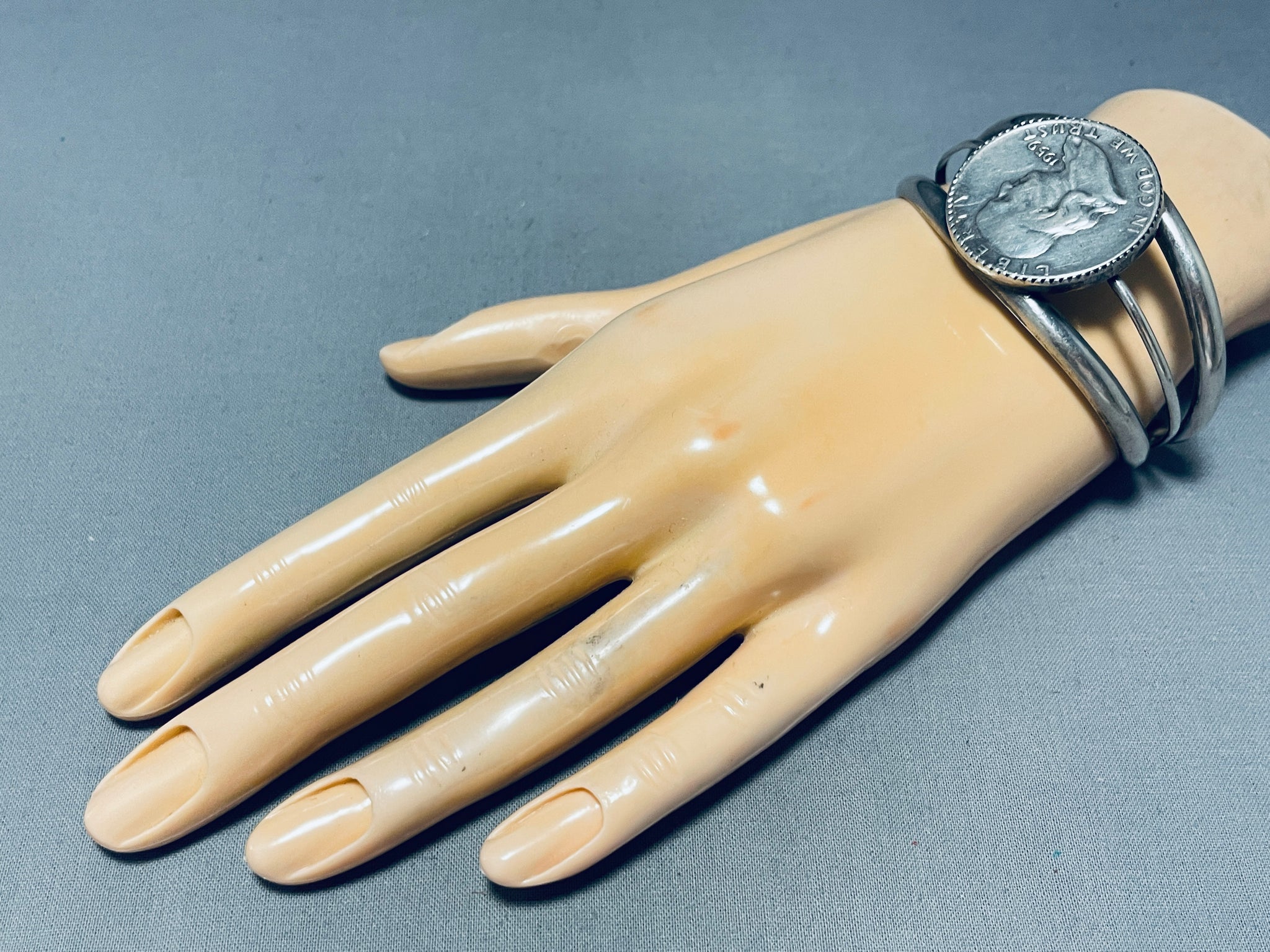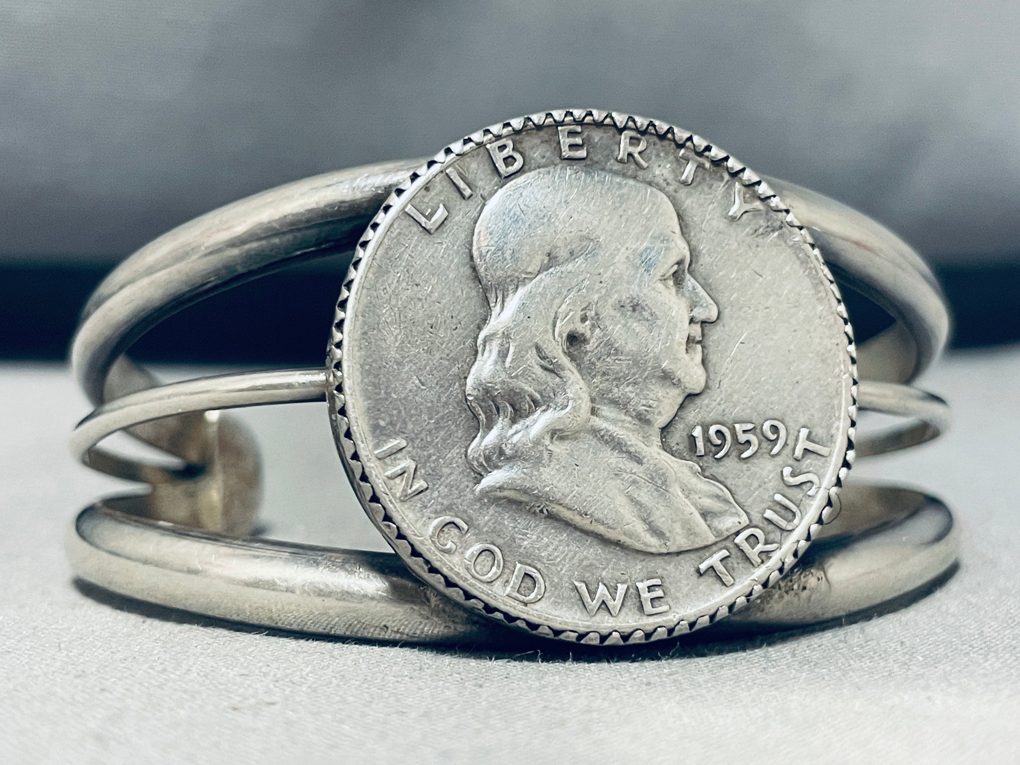 Impressive Ben Franklin Half Dollar Vintage Native American Navajo Sterling Silver Coin Bracelet