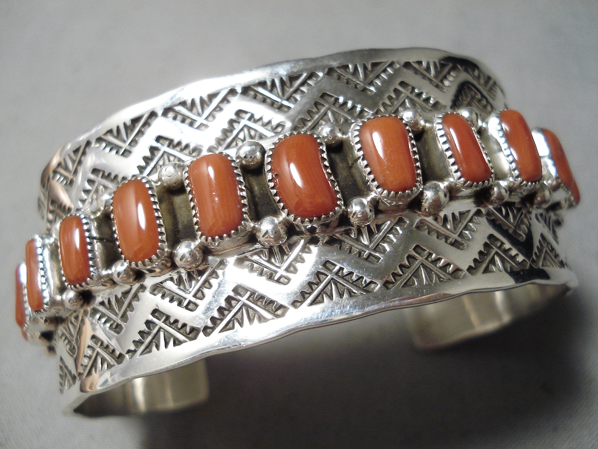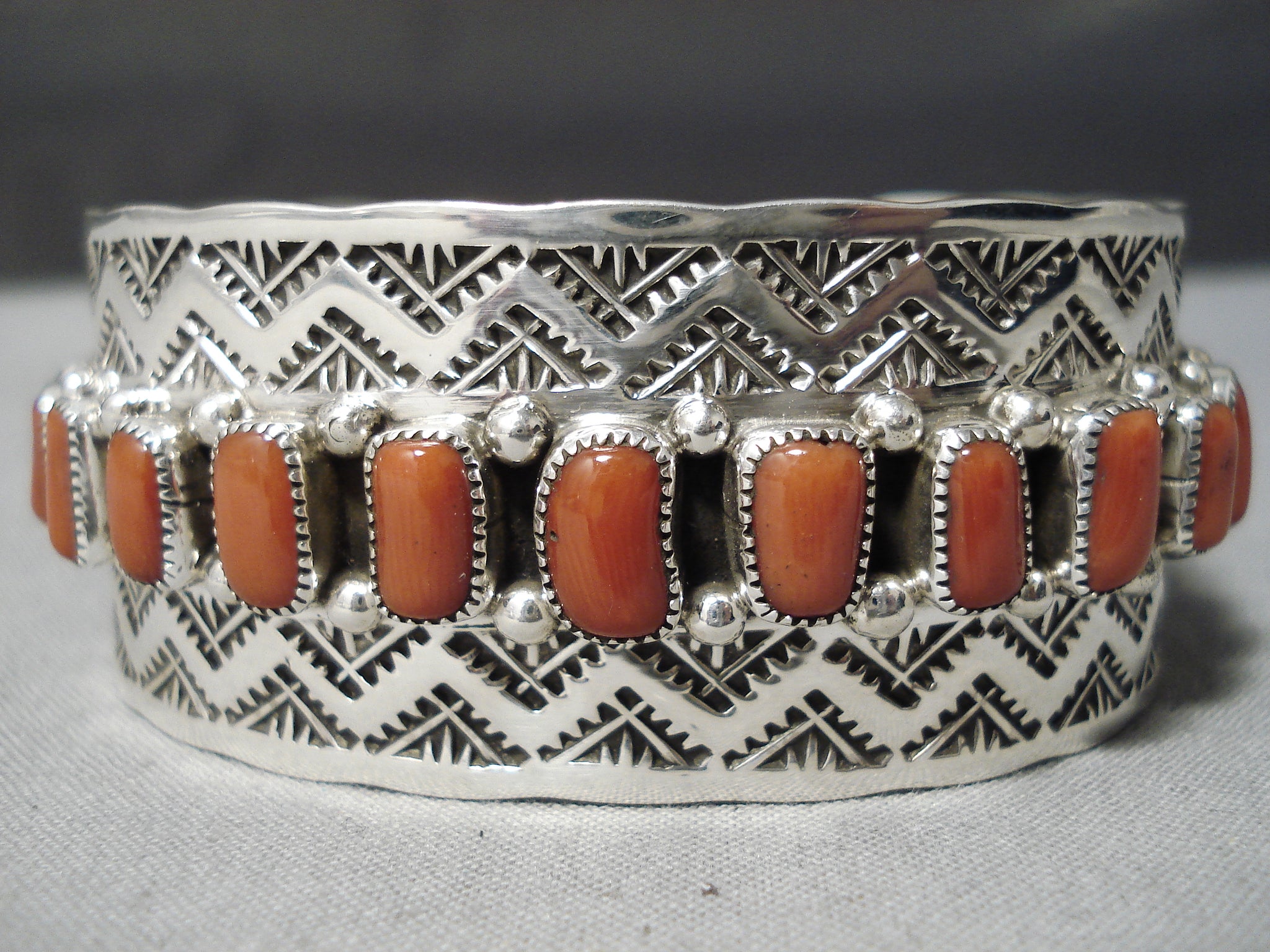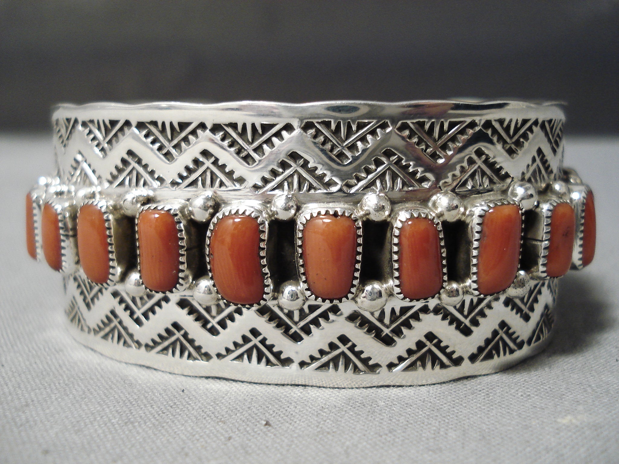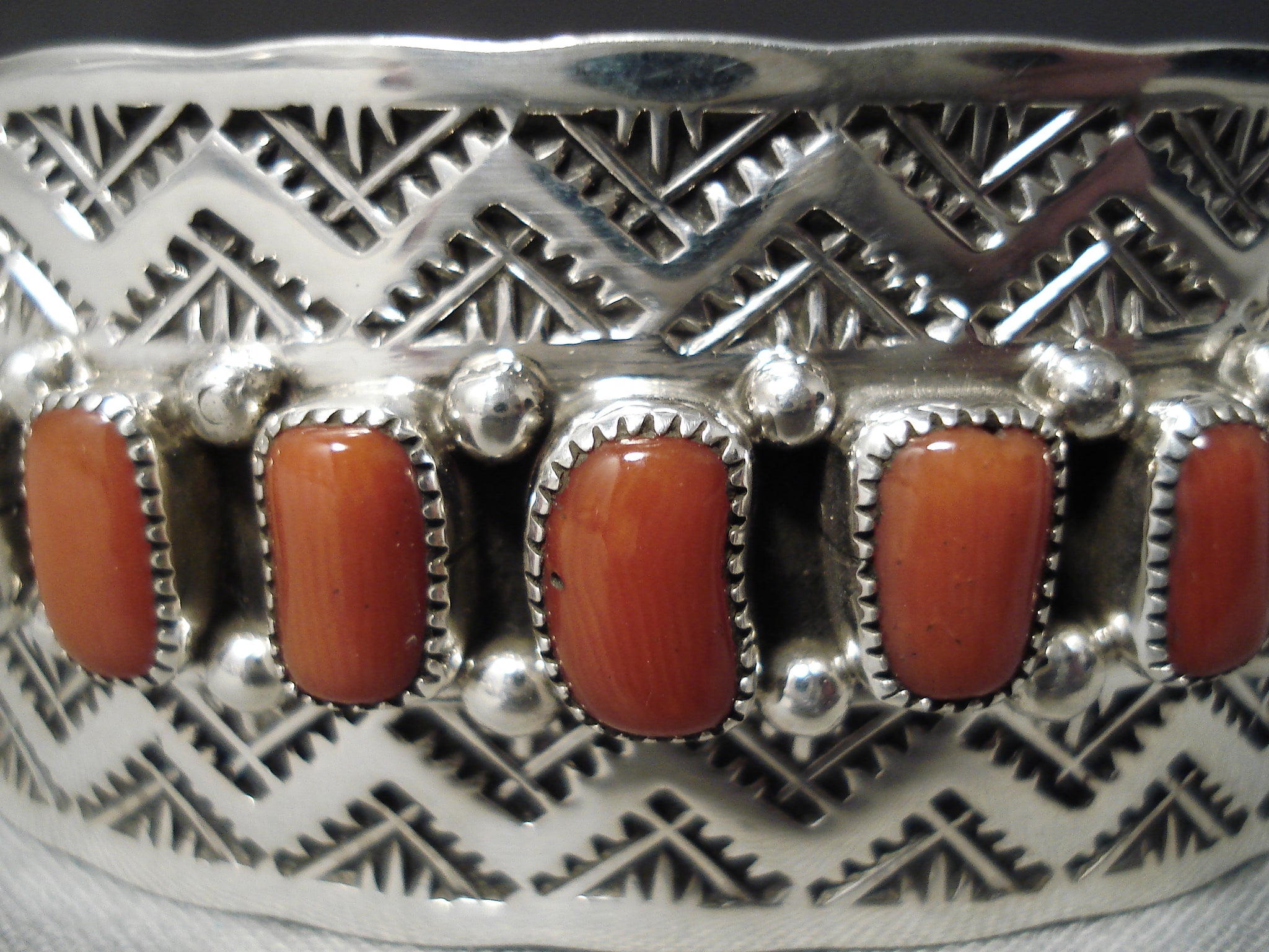 Impressive Native American Navajo Corals Sterling Silver Large Bracelet