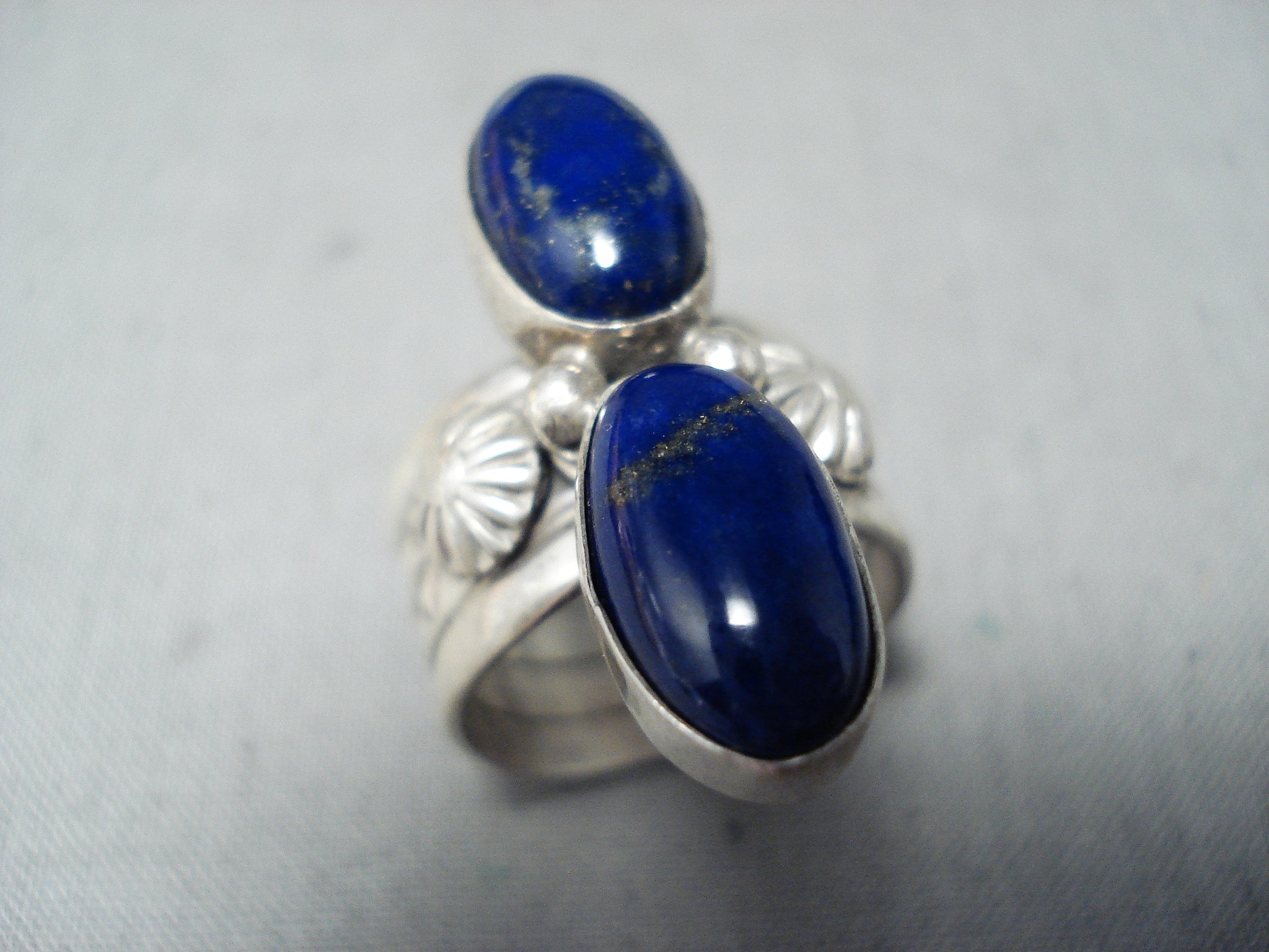 Here we have an amazing Navajo silver ring. Separated with dual silver beads, these two oval lapis stones are set one above the other, as a large silver starburst guards either side! The stones measure around 1/2" x 5/16". The ring face measures around 1-1/4" x 3/4". Signed by Navajo artist, Ben Begaye. The ring size is around 8. Sterling silver, marked. Sturdy 12 grams.