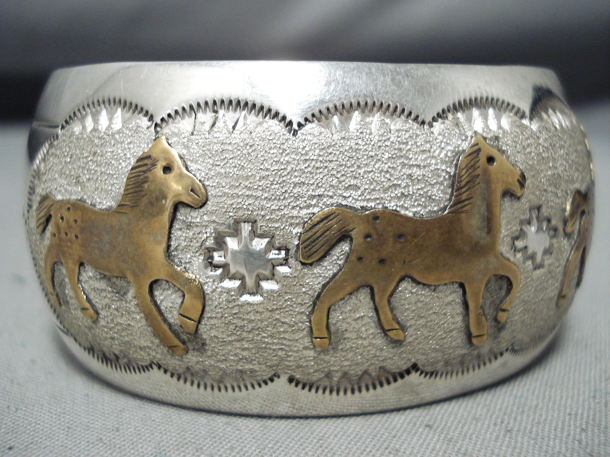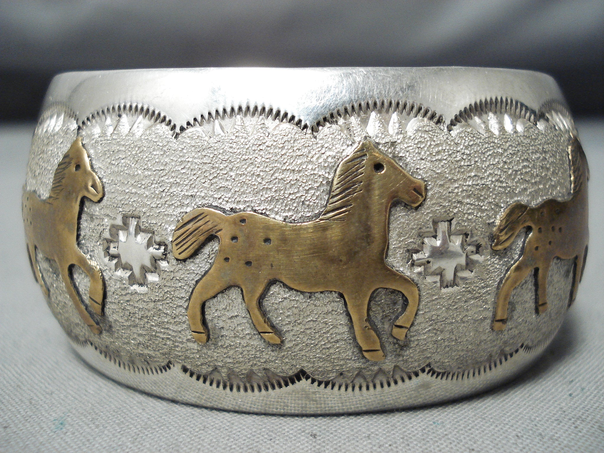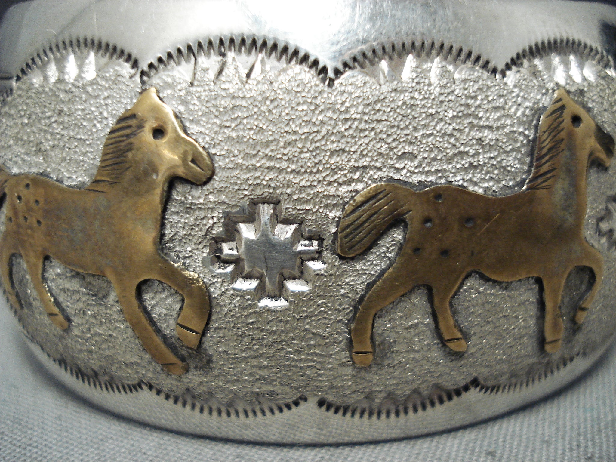 Impressive Navajo Native American Three Horses Sterling Silver Bracelet