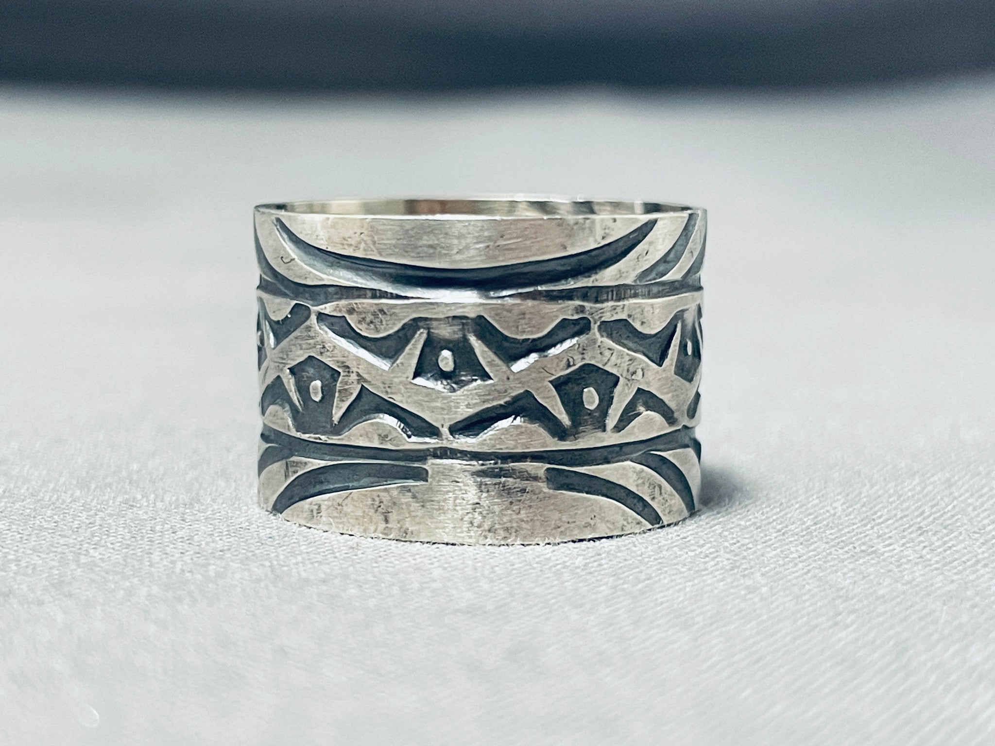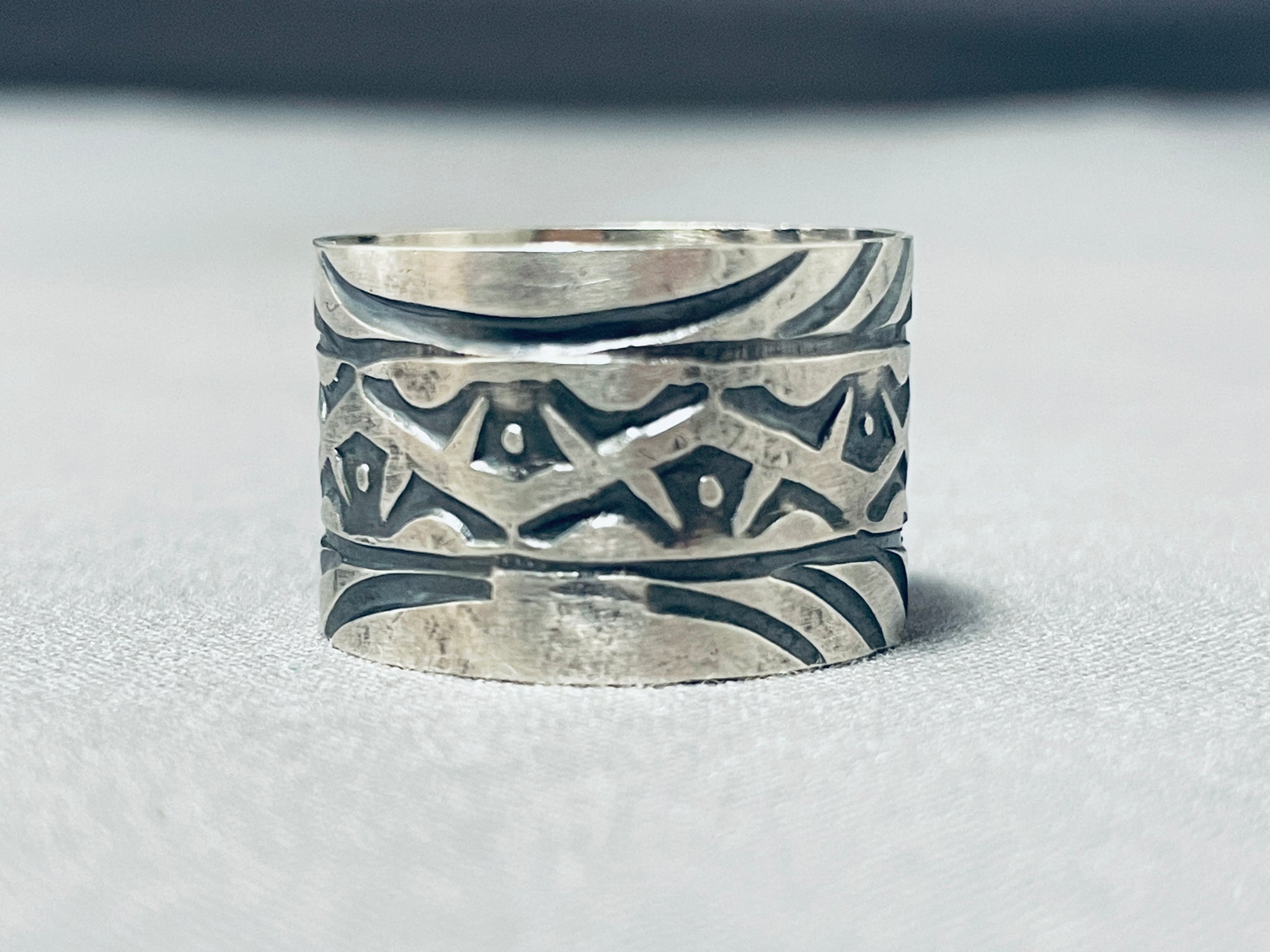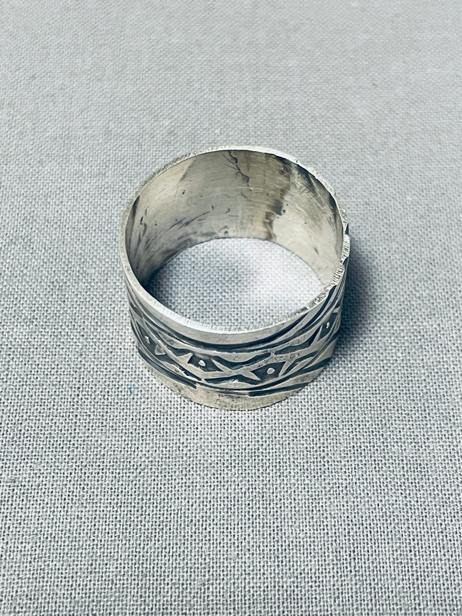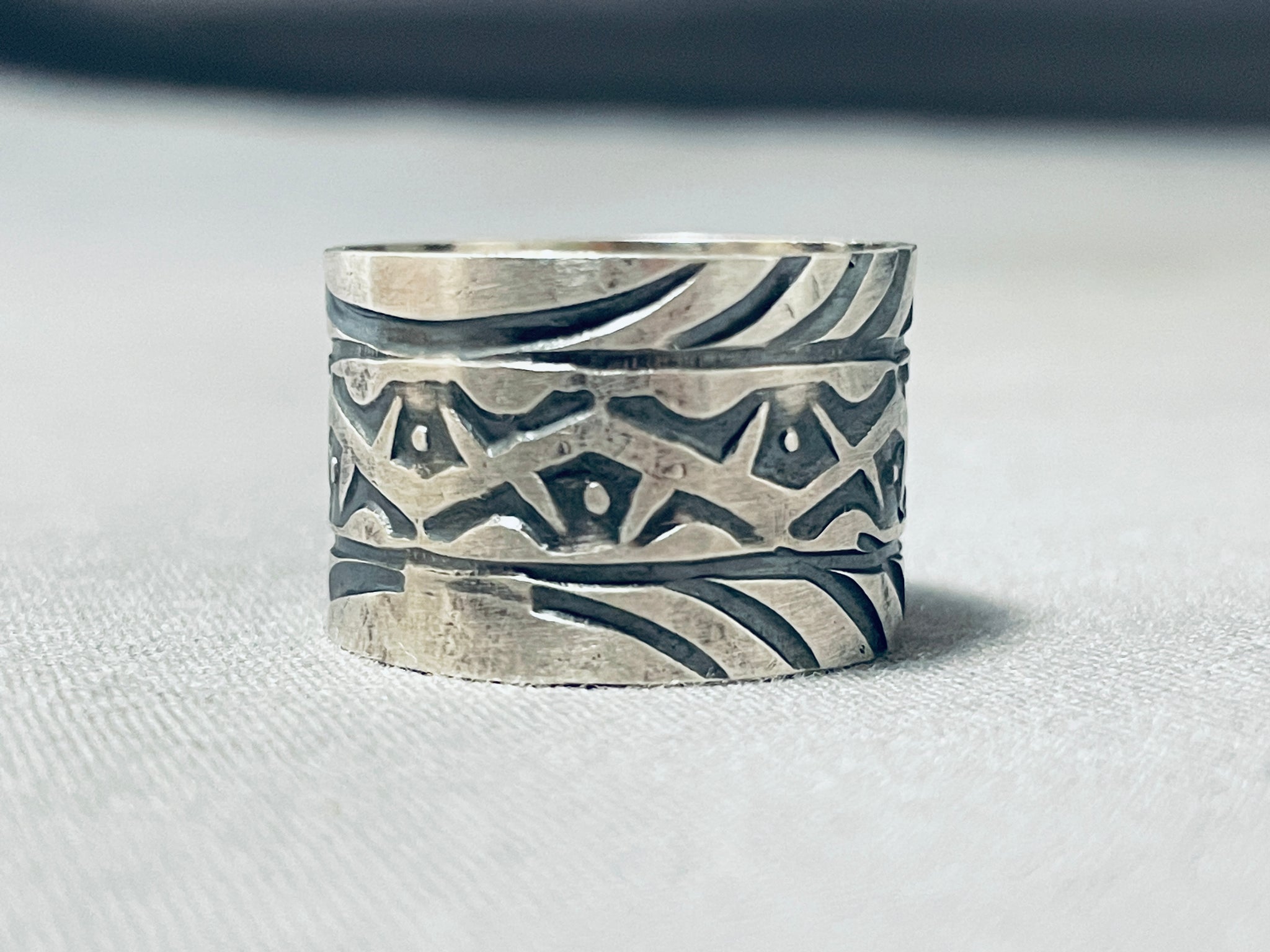 Up for sale is this superlative San Felipe silver ring. Here we have a marvelous wide cigar band ring - with fabulous handstamped designs decorating all around! The ring face measures around 9/16" x 7/8". San Felipe artist Jake Froncosa. The ring size is around 11. Sterling silver, marked. Sturdy 6 grams.