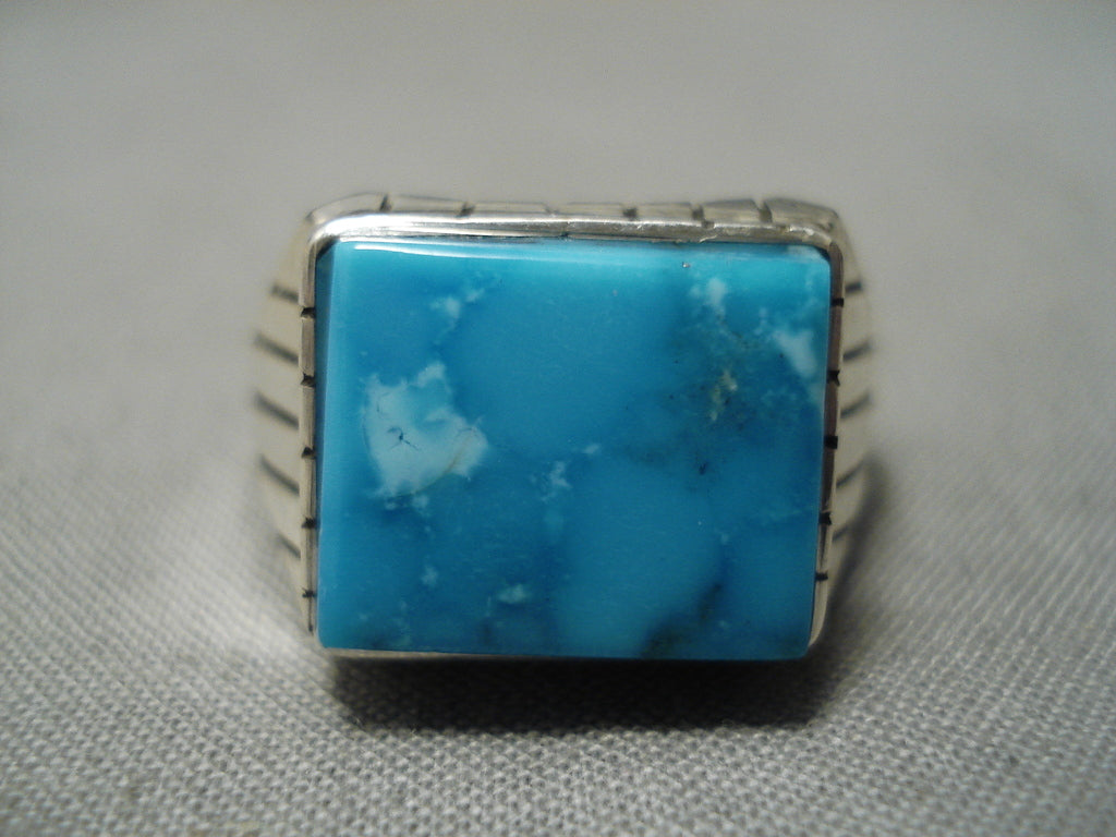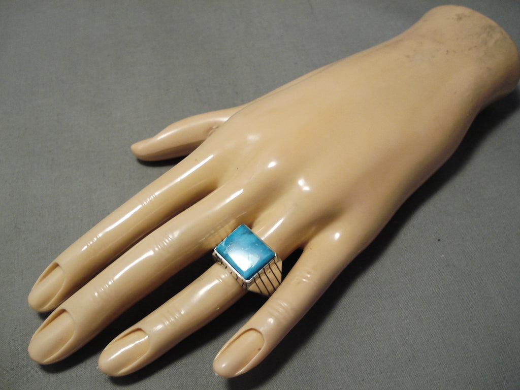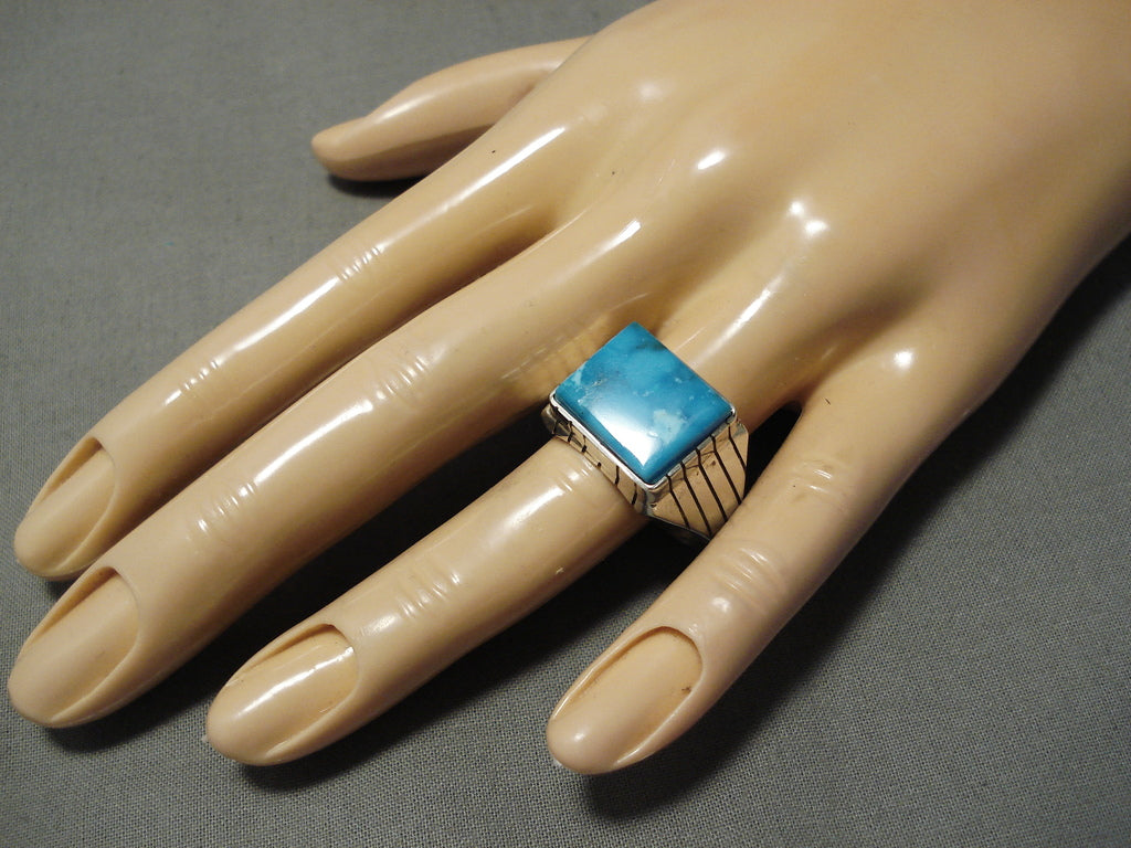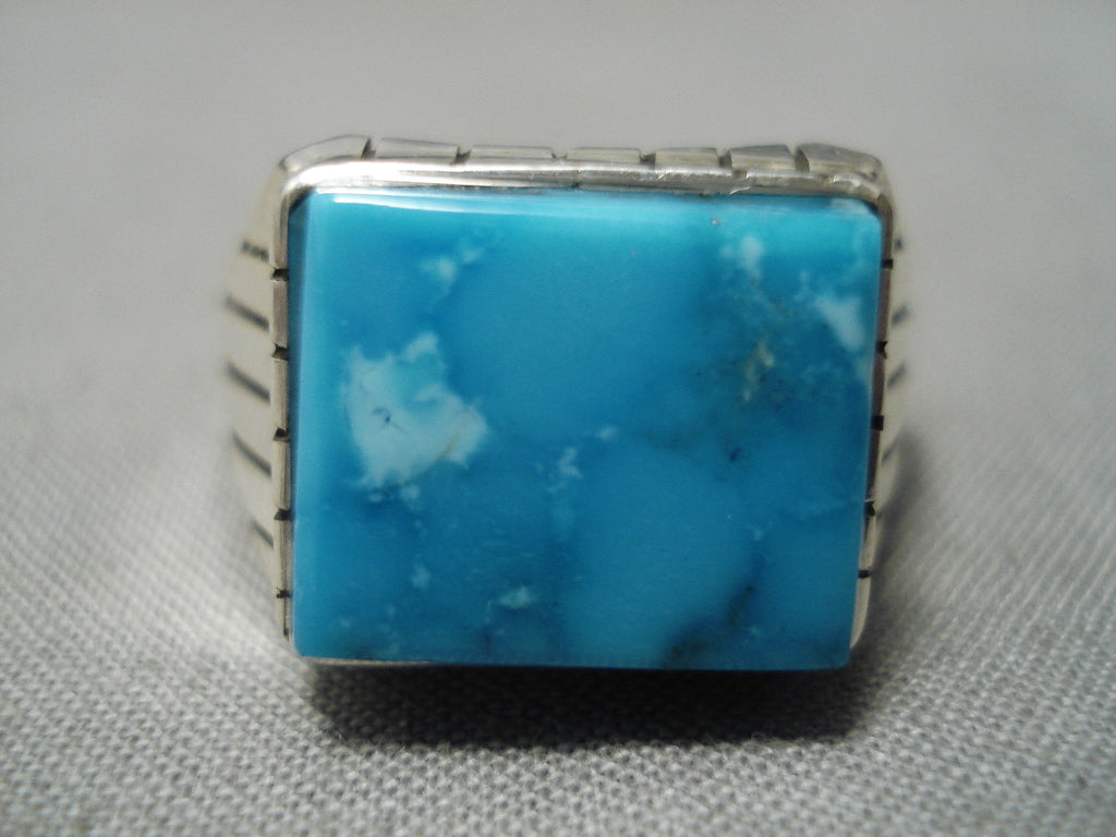 Here we have an impressive Navajo silver ring having a large Blue Diamond turquoise square on a handcarved graduated solid silver band with handcarved horizontal silver line designs! Simply Stunning! The center stone measures around 1/2" x 3/8". The ring face measures around 5/8" x 1/2". The ring size is around 13. Sterling silver, marked. Sturdy 11 grams.