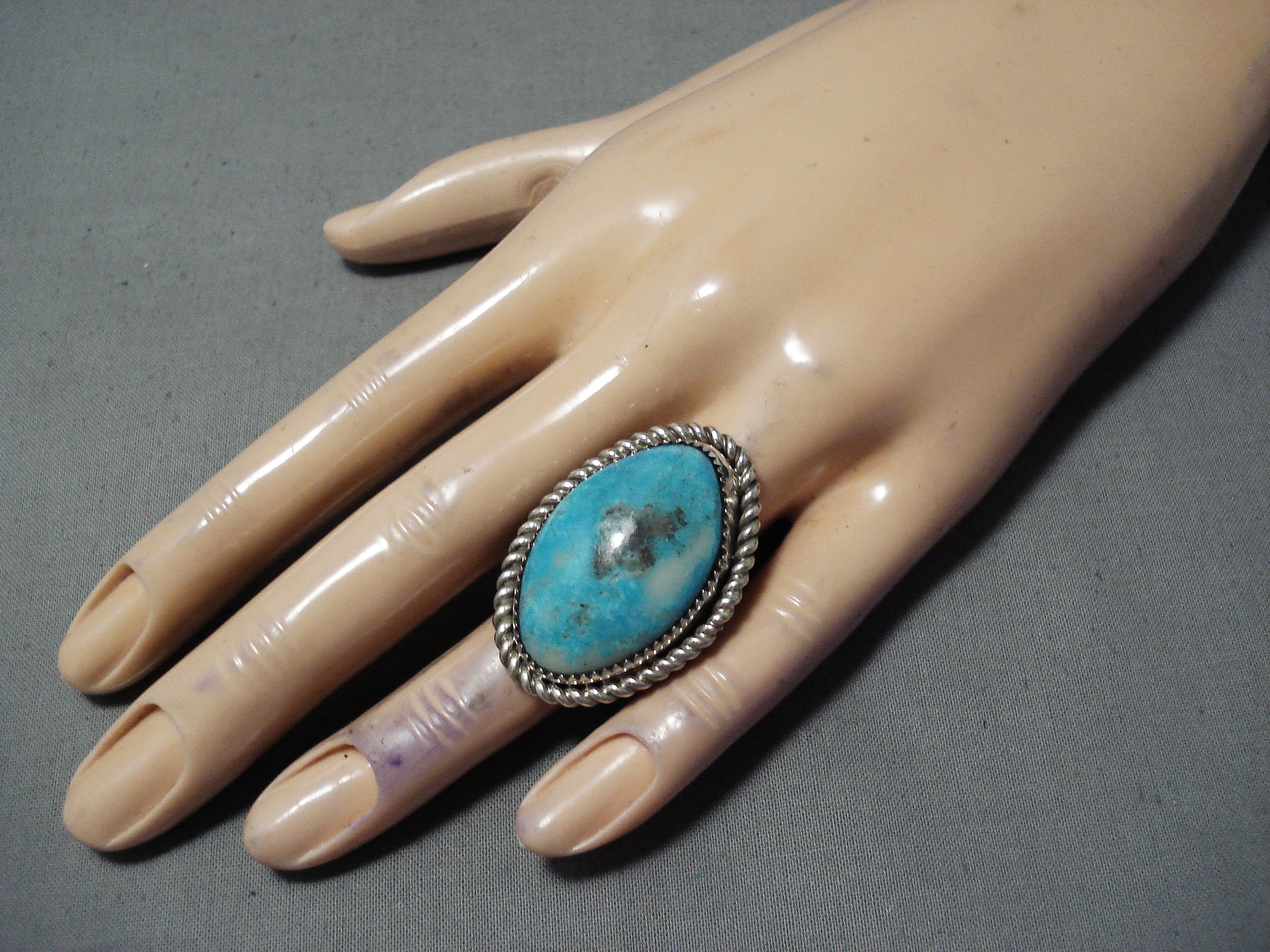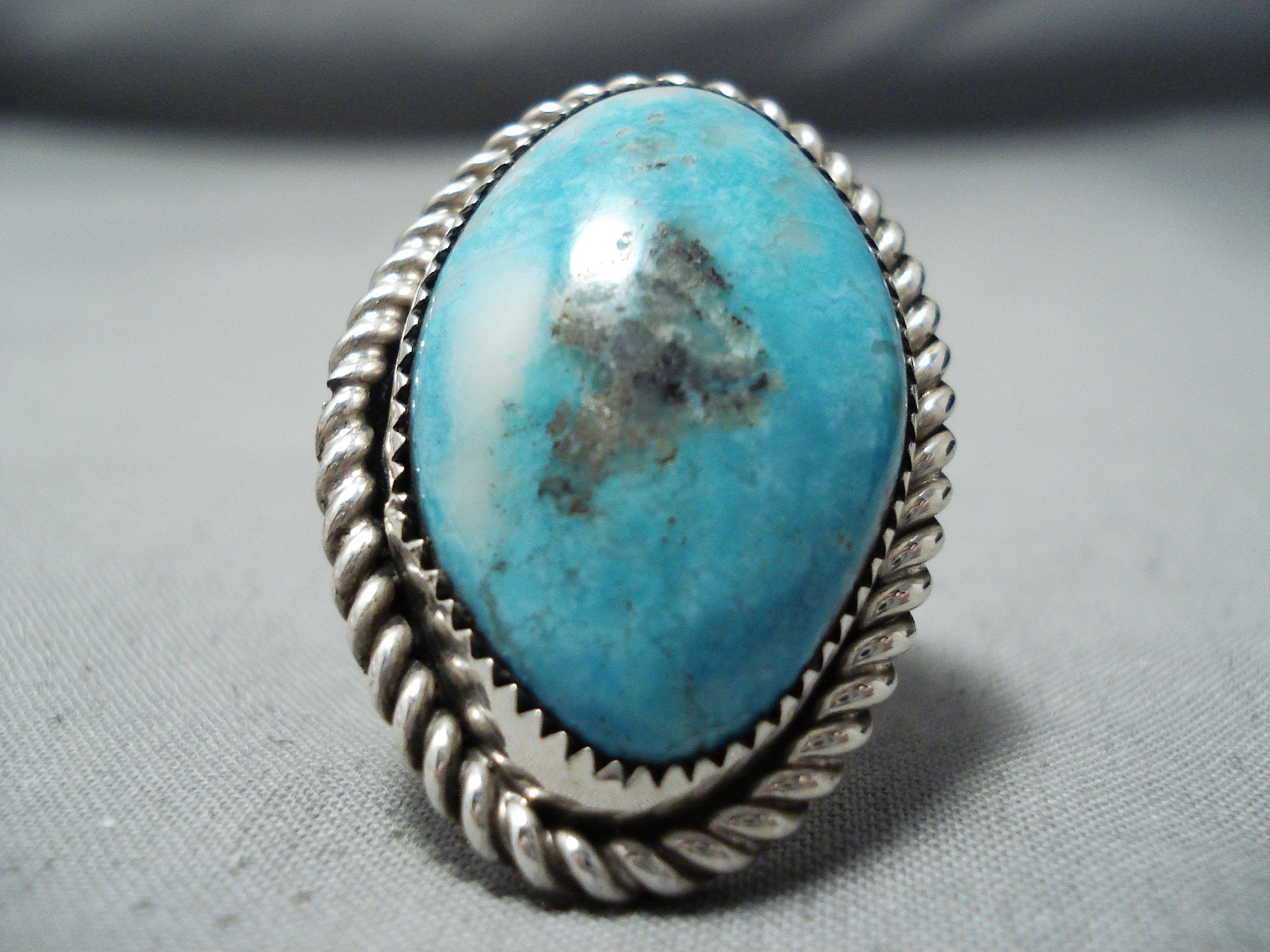 Up for sale is this magnificent vintage Navajo silver ring having a huge Blue Diamond turquoise oval surrounded by a handcarved silver rope border! The ring has a handcarved double silver rail band! Simply Stunning! The center stone measures around 1-1/8" x 3/4". The ring face measures around 1-1/2" x 1". The ring size is around 8. Sterling silver. Sturdy 16 grams.