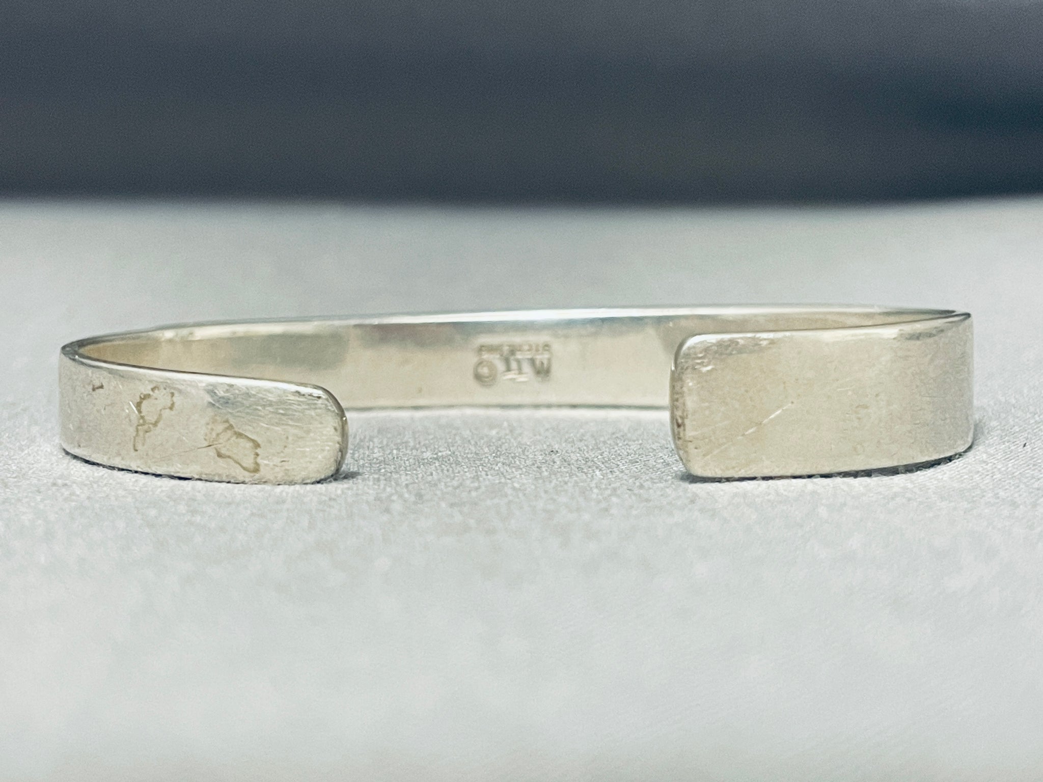 We are proud to offer this remarkable vintage Navajo silver bracelet having inlay denim lapis rectangles across a handcarved solid silver cuff! Truly Stunning Piece! The width of the bracelet measures around 3/8". Signed by Navajo artist, M.T.T. Sterling silver, marked. The inside end to end measures around 5-3/4" with an additional 3/4" gap. Sturdy 25 grams.
