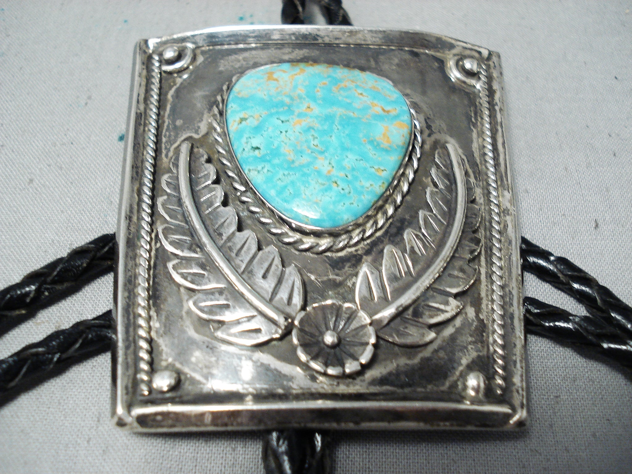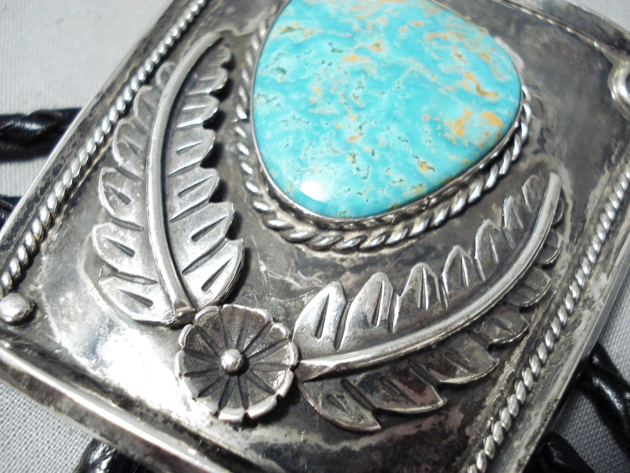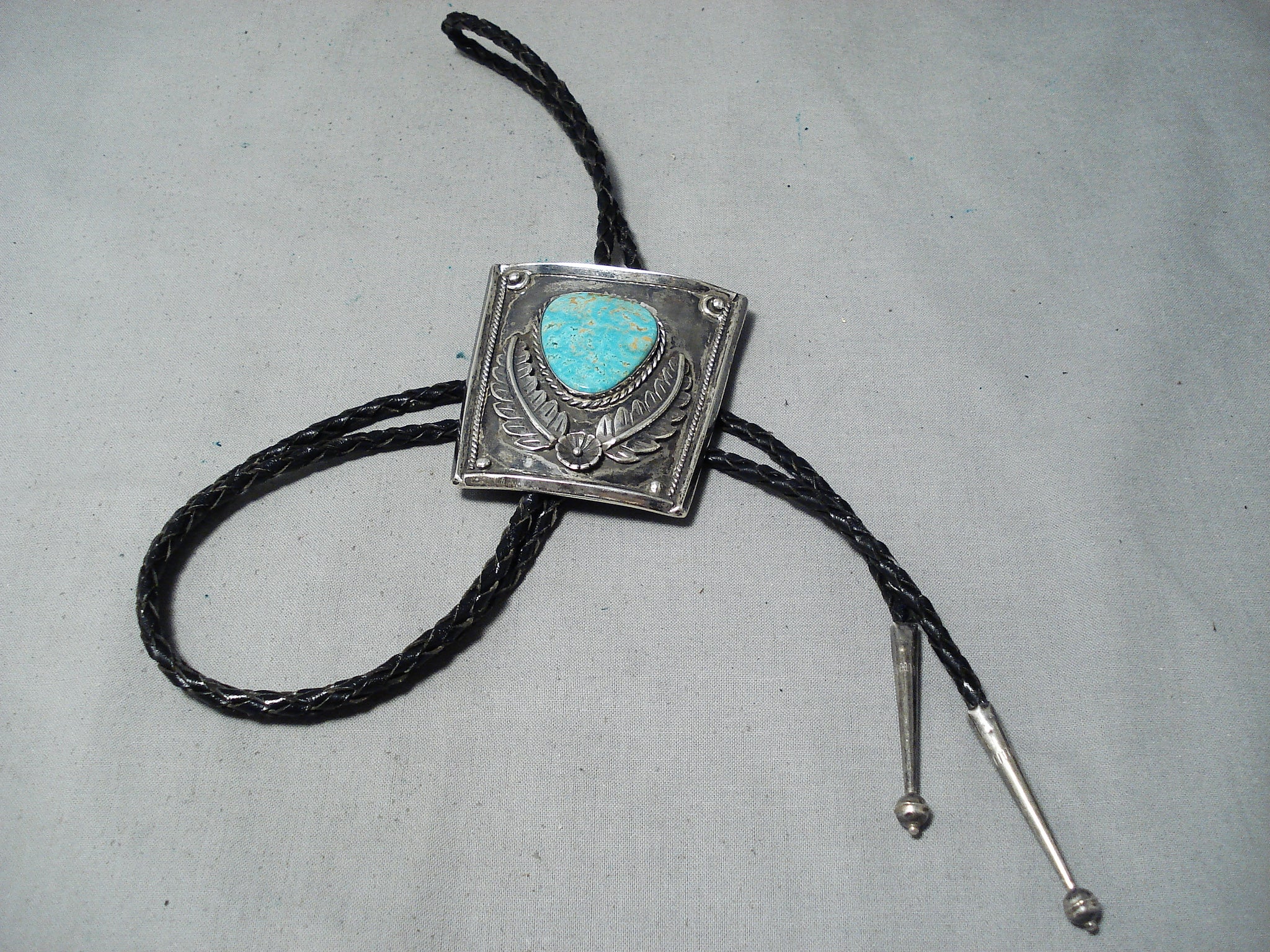 Impressive Vintage Native American Navajo Pilot Mountain Turquoise Sterling Silver Bolo Tie Old
