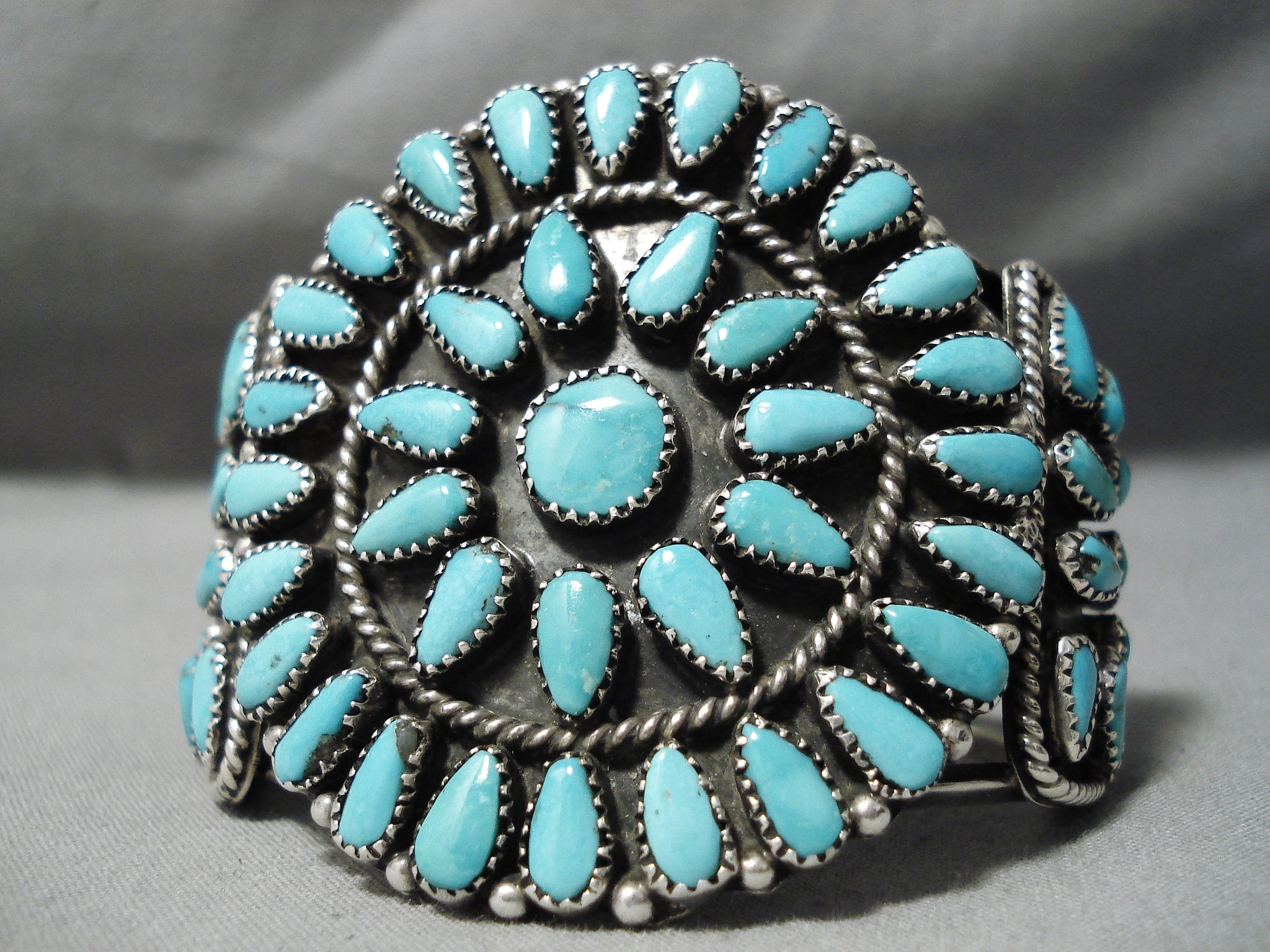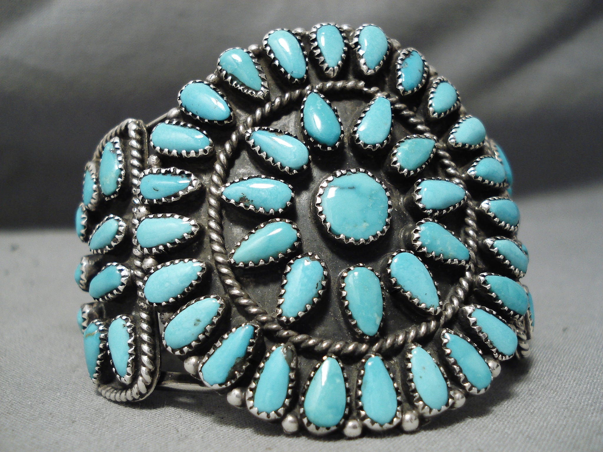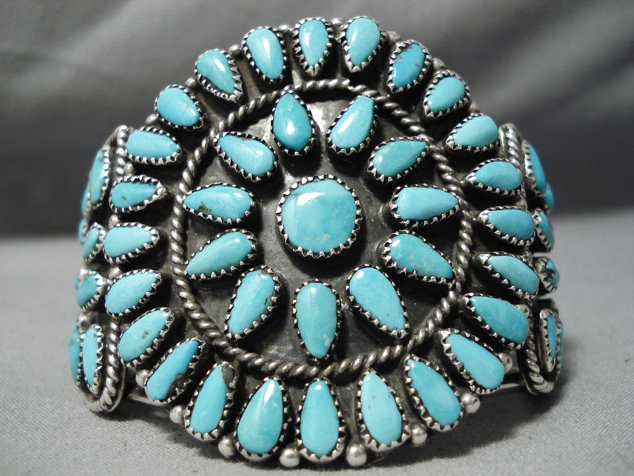 Impressive Vintage Native American Navajo Turquoise Cluster Sterling Silver Bracelet Old