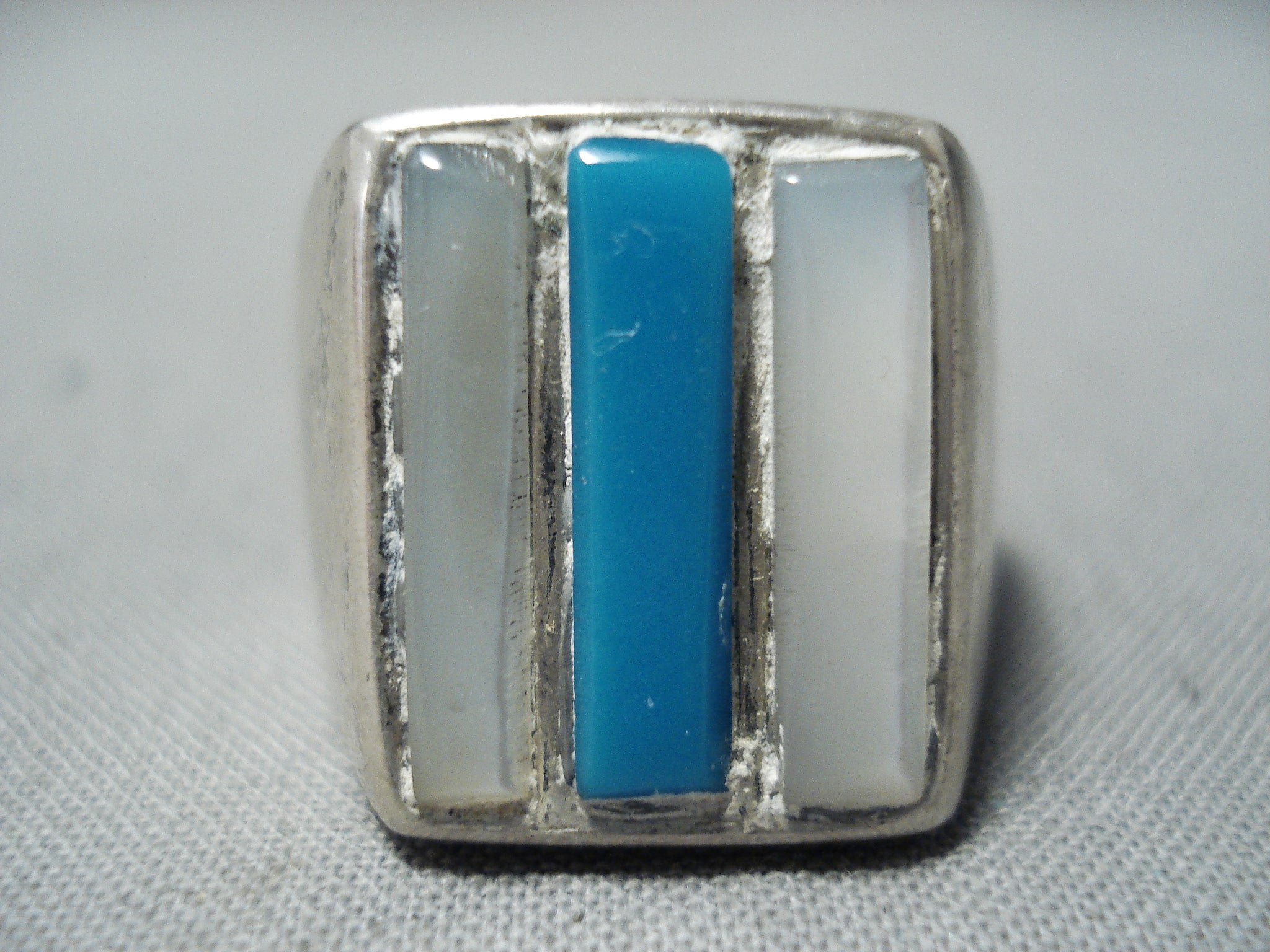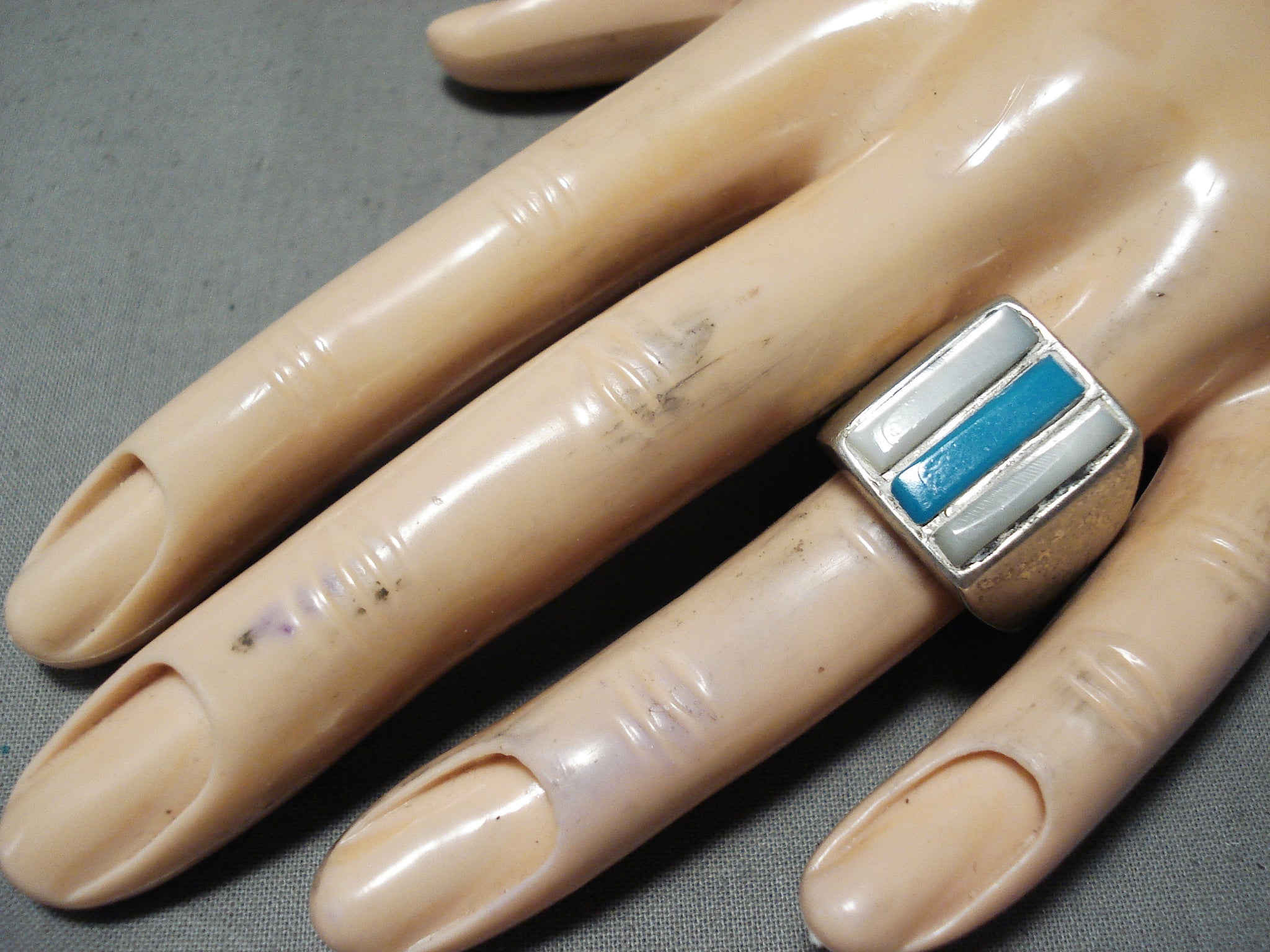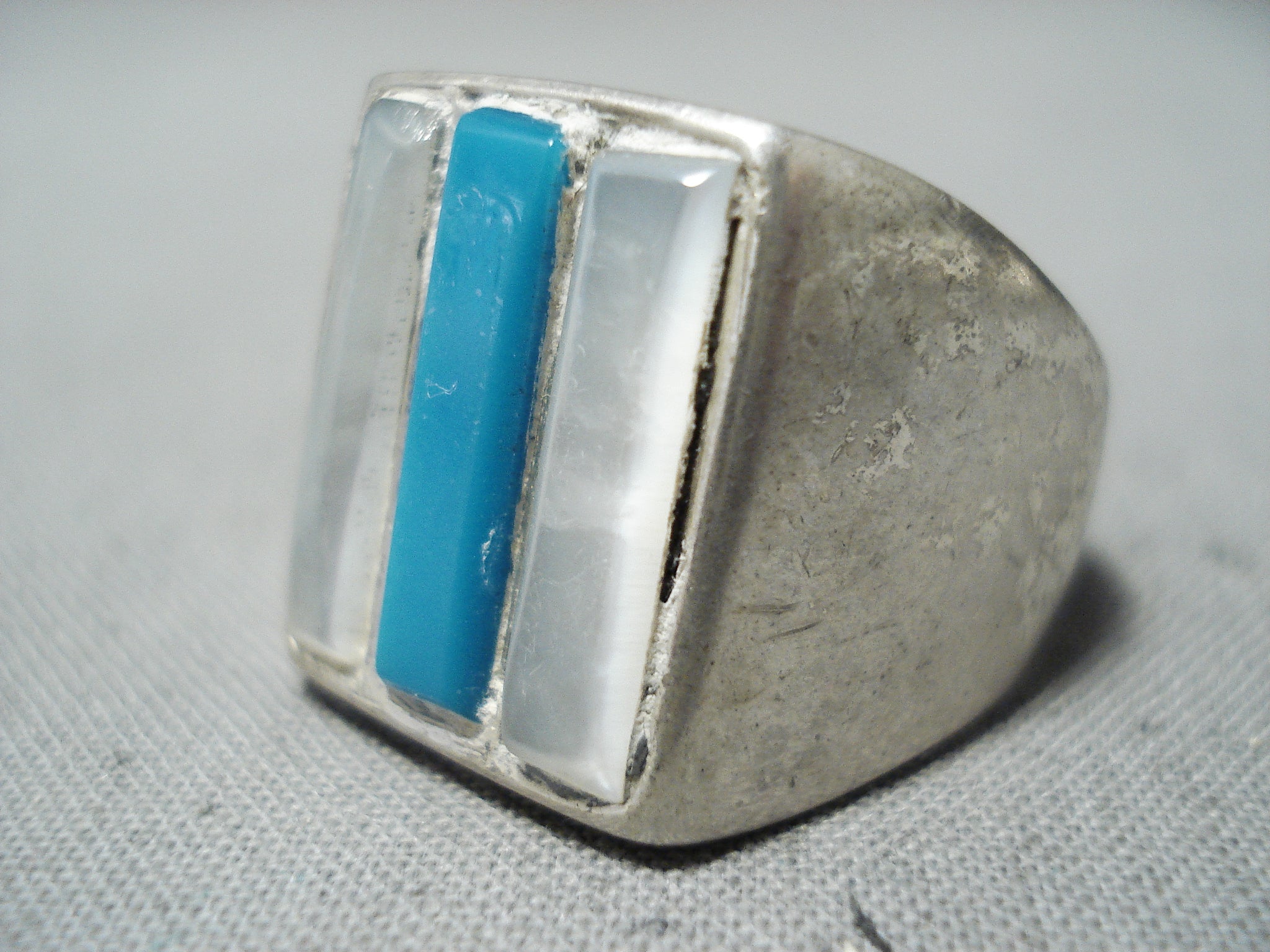Impressive Vintage Native American Navajo Turquoise Mother Of Pearl Sterling Silver Ring Old