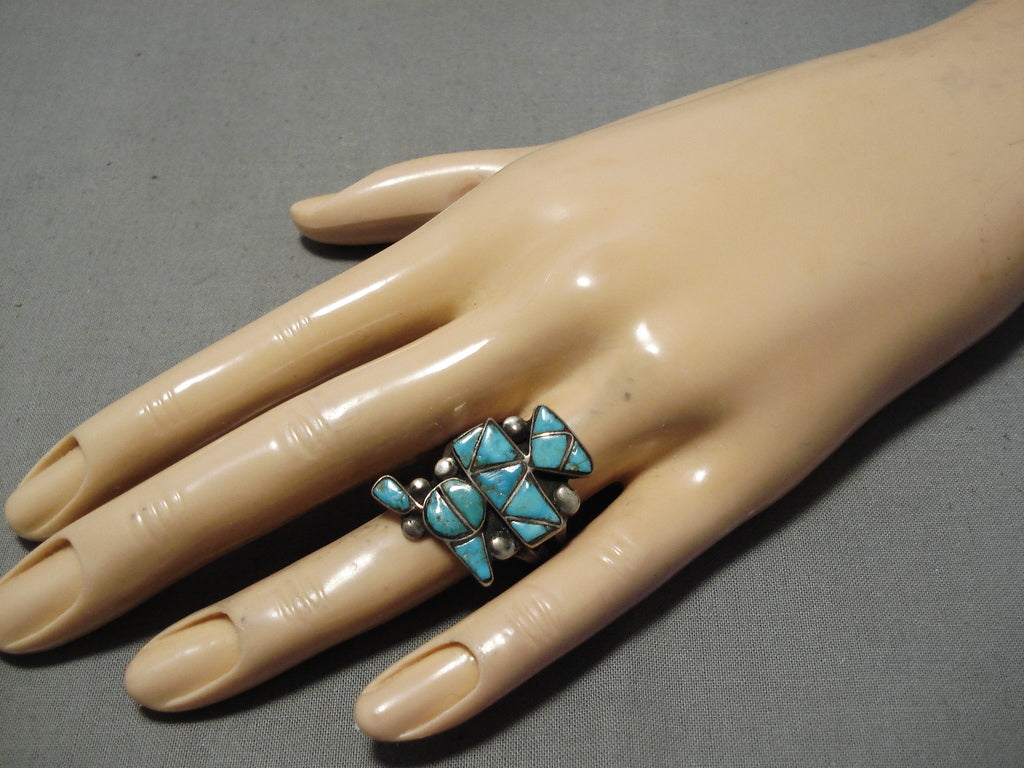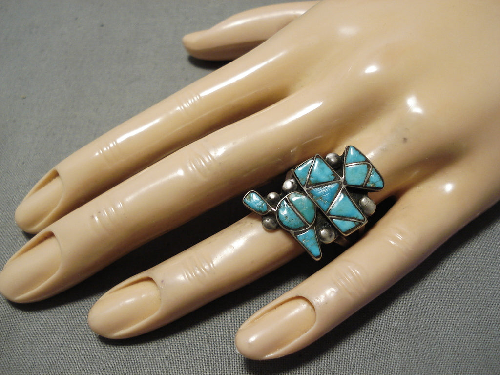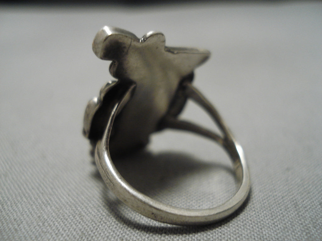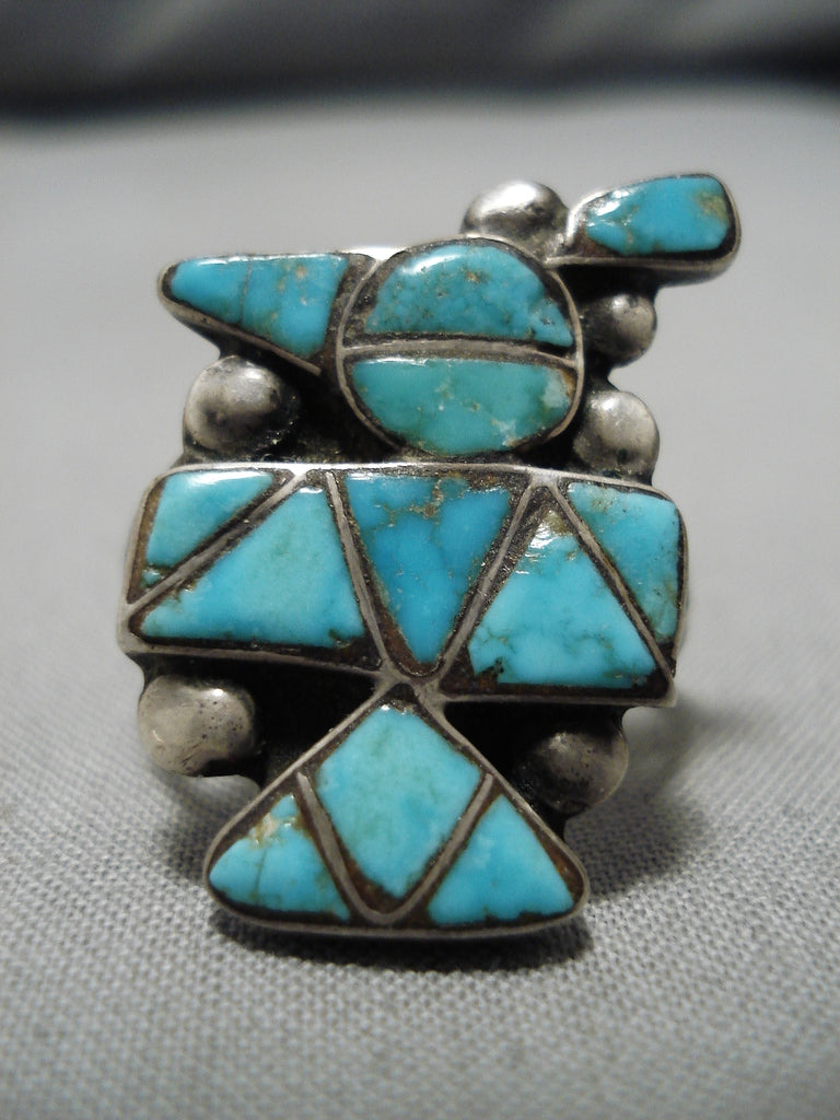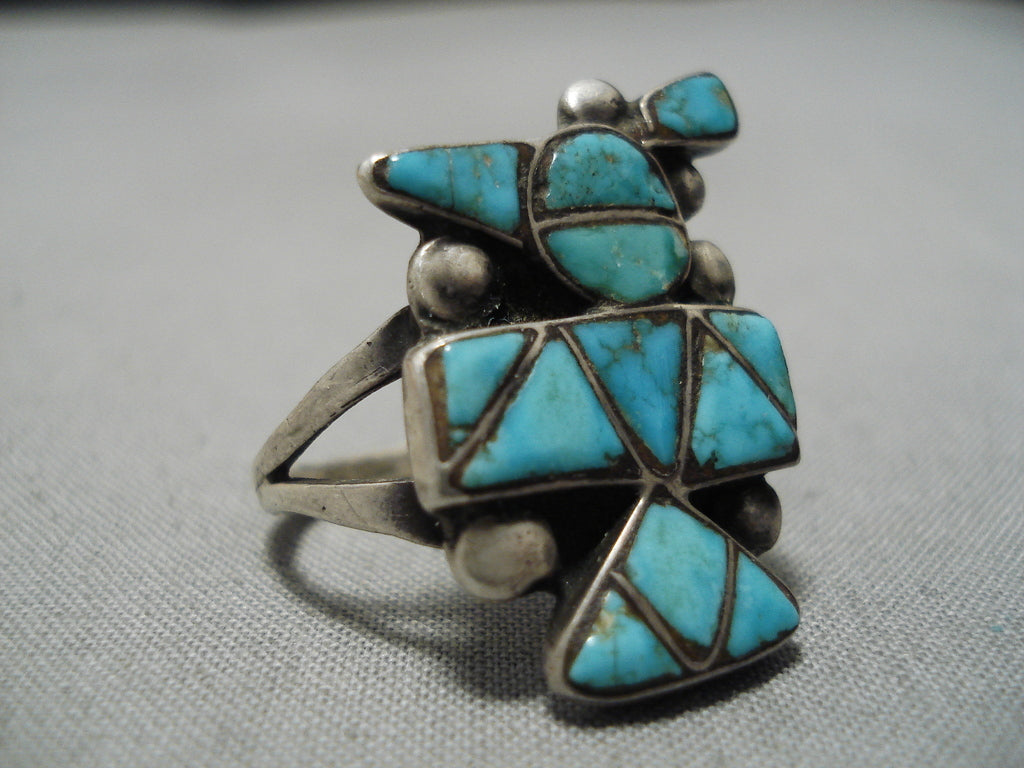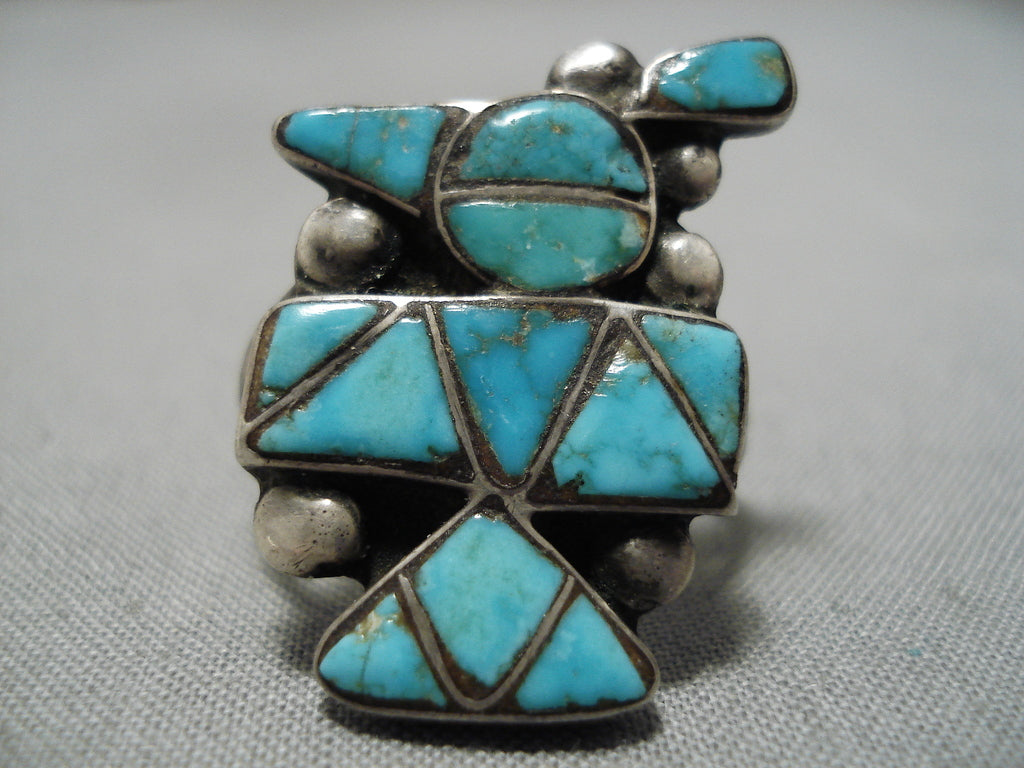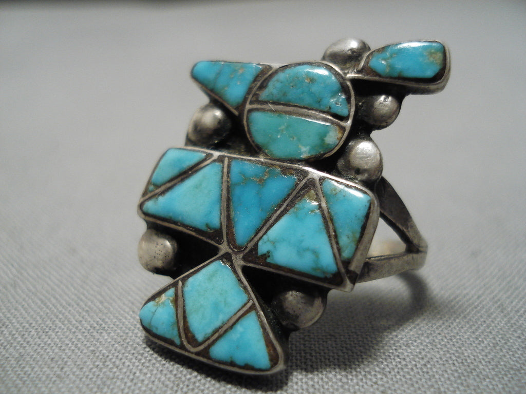Impressive Vintage Native American Zuni Hand Carved Bird Sterling Silver Inlay Turquoise Ring