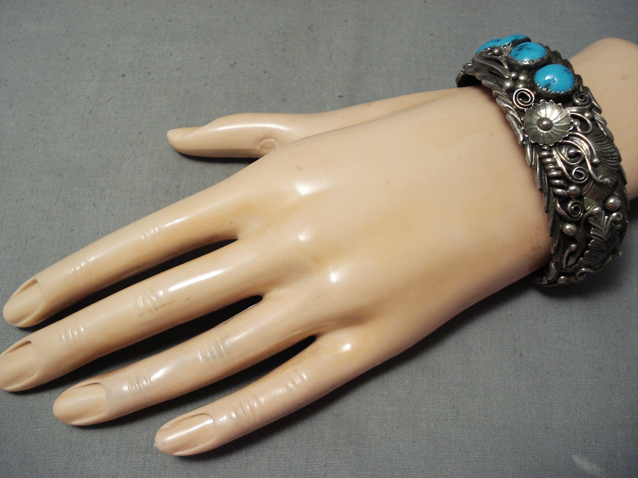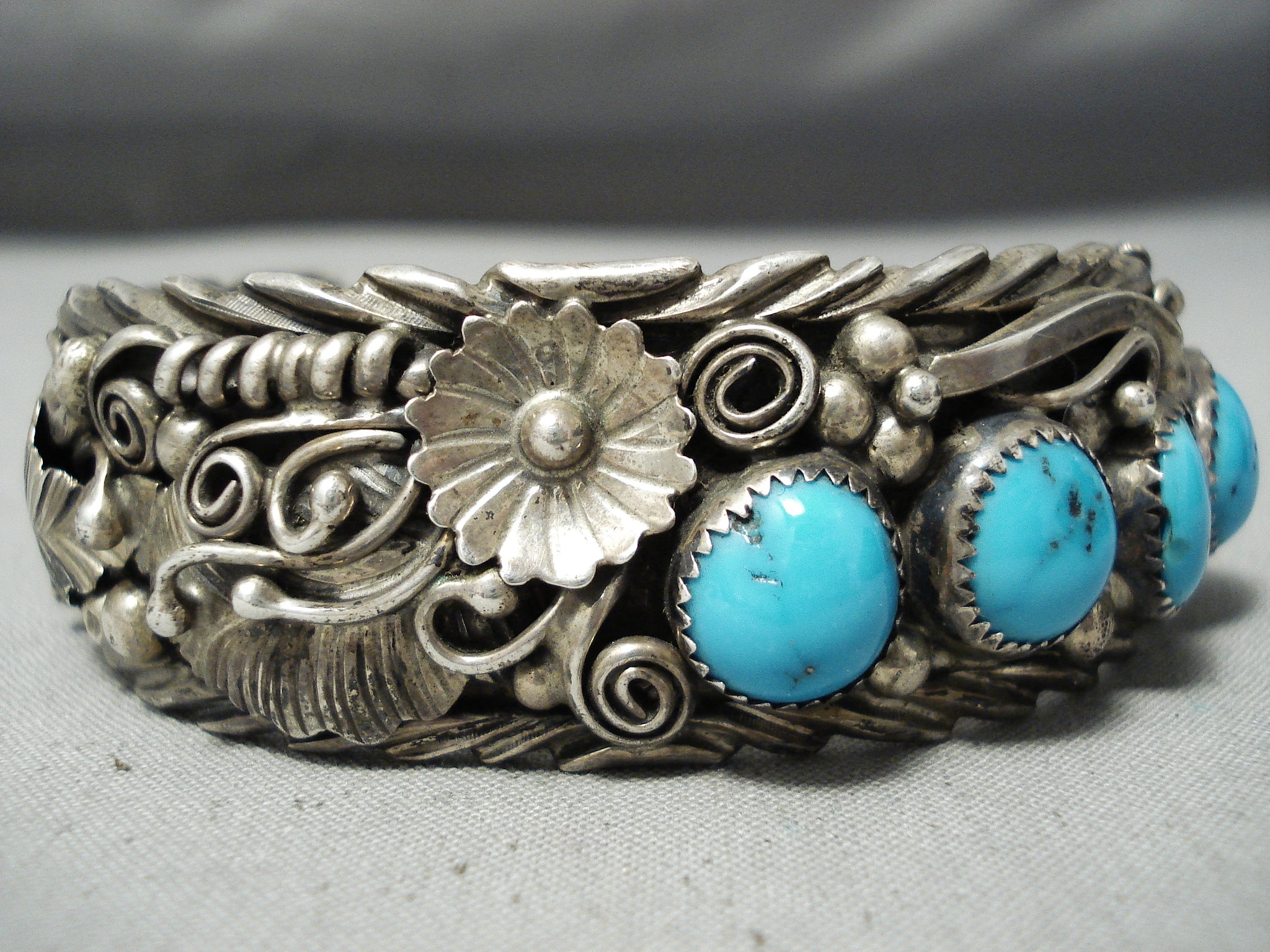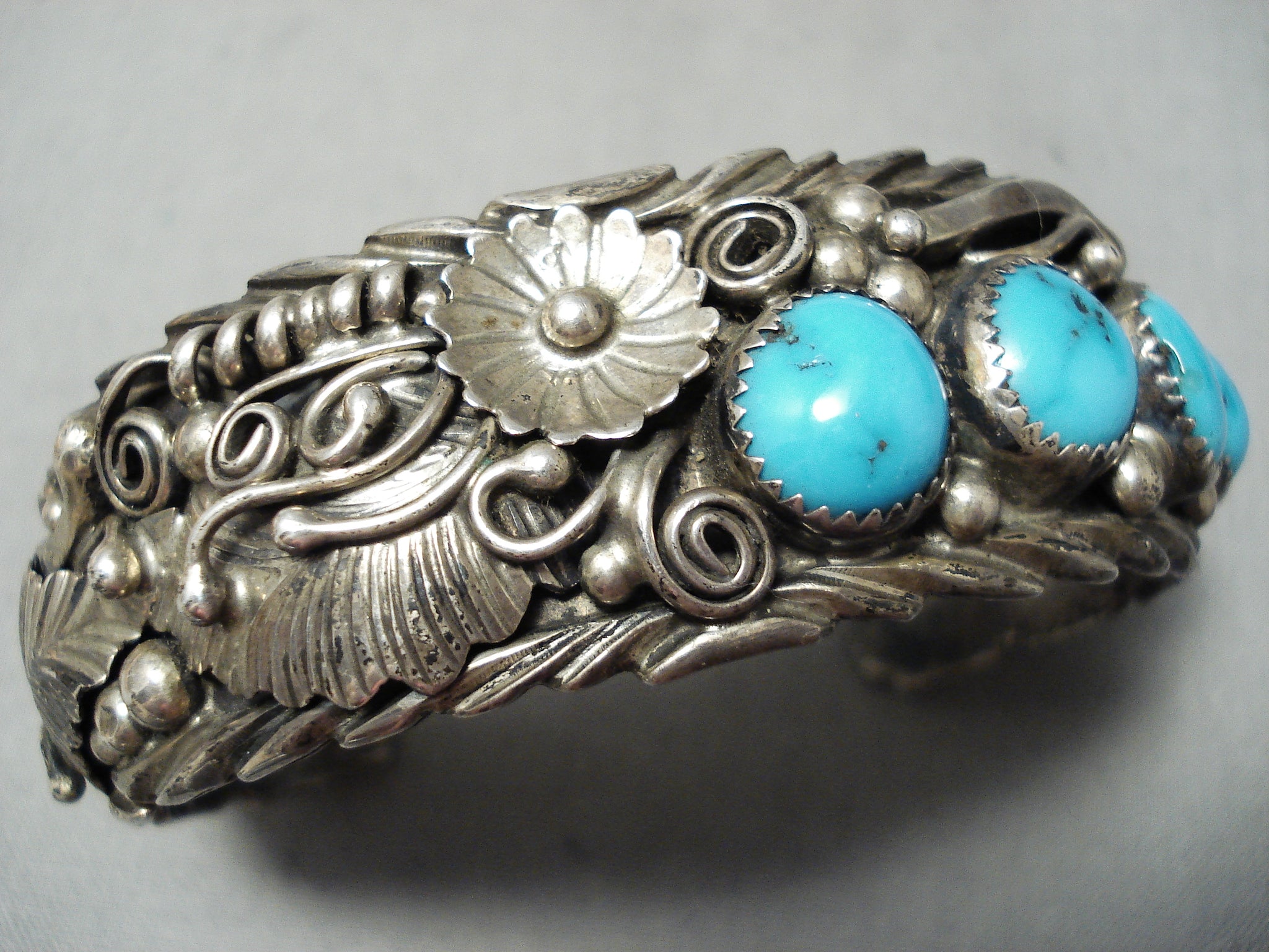 Incredible Detail Vintage Native American Navajo Blue Gem Turquoise Sterling Silver Bracelet