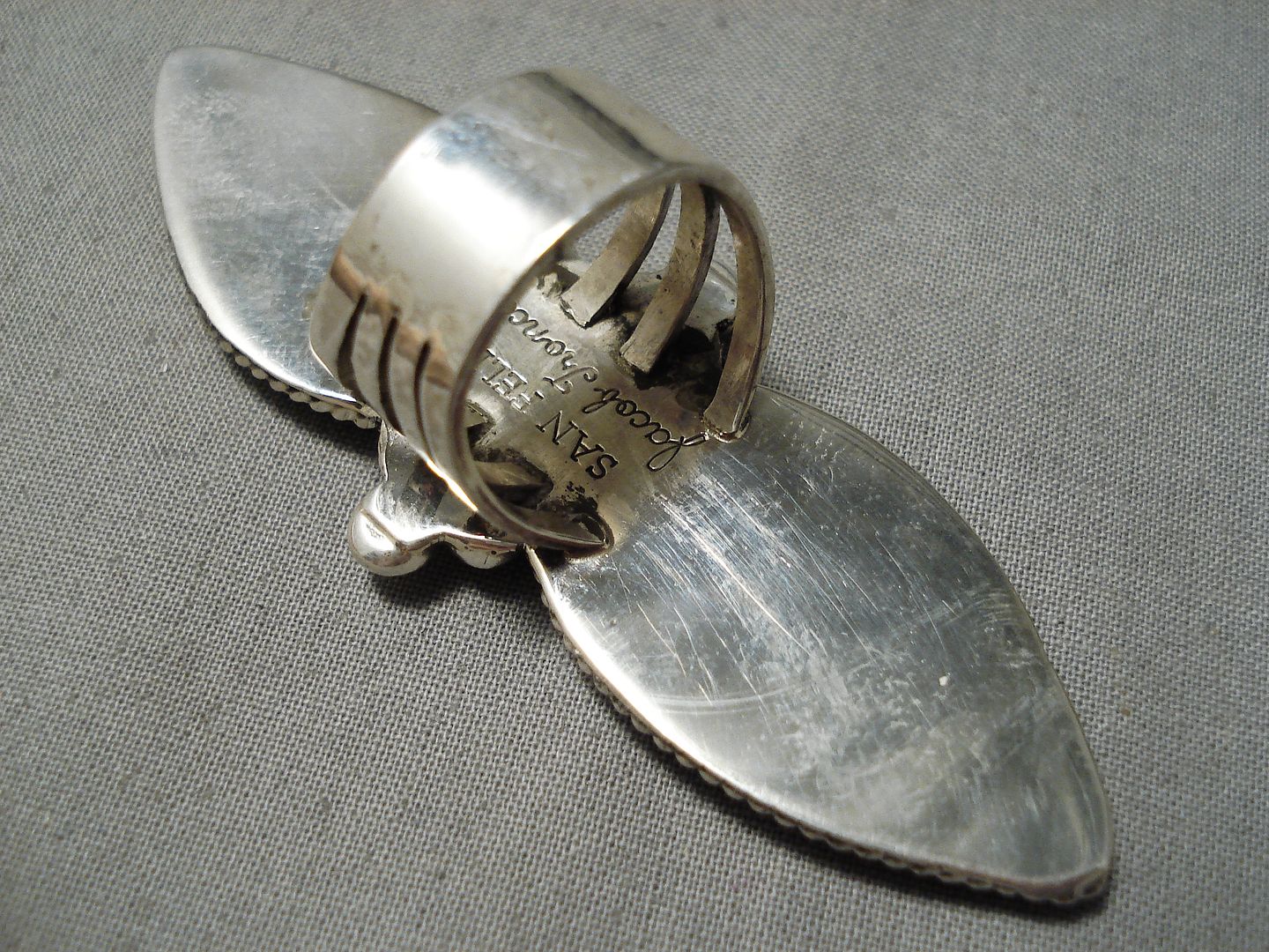 We are proud to offer this breathtaking San Felipe silver ring. Separated with an arrangement of silver beads, we have two huge teardrop shapes of incredible, geometric designs of colorful opals as they face off, creating such a gorgeous elongated 4-rail ring! The ring face measures around 3" x 1-1/8". San Felipe artist Jacob Froncosa. The ring size is around 9. Sterling silver, marked. Sturdy 24 grams.