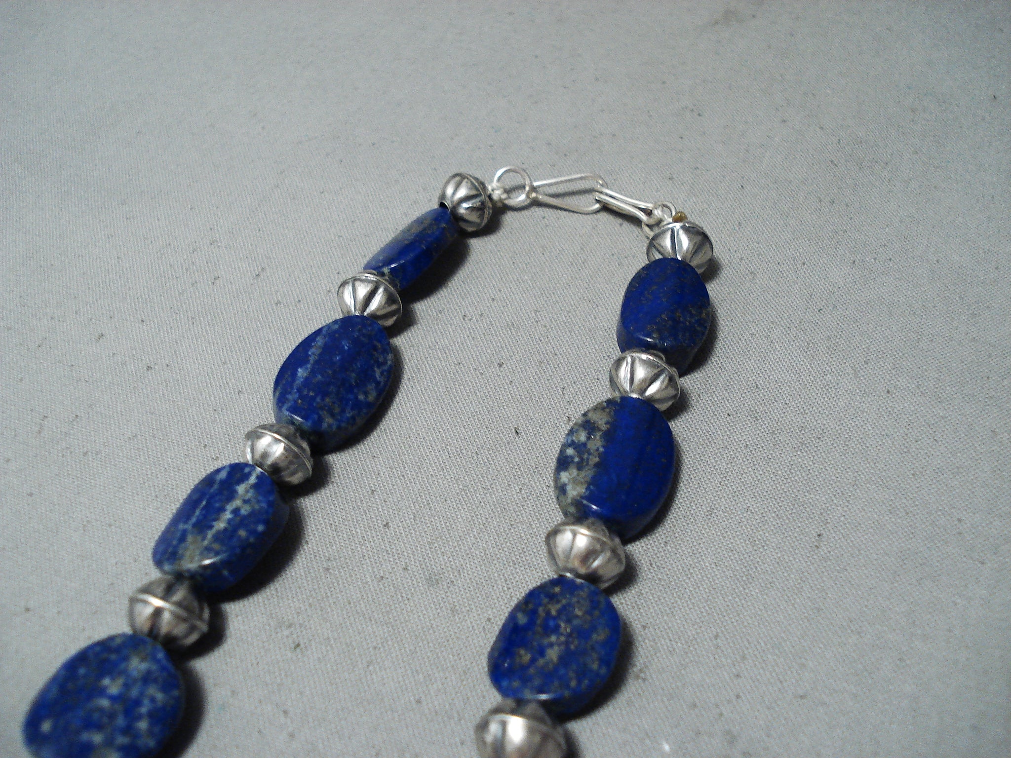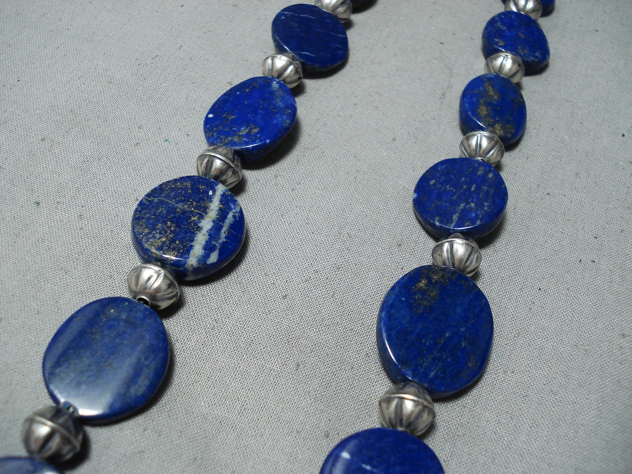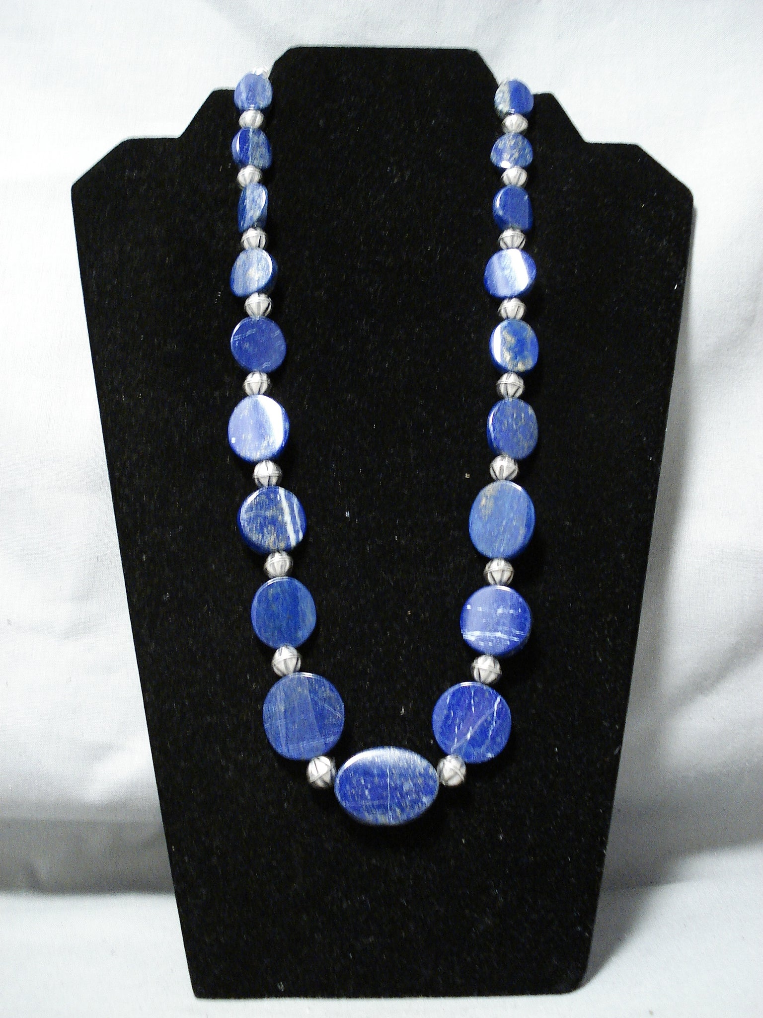Up for sale is this marvelous Navajo necklace having graduated flat lapis ovals with handcarved round silver hogan beads in between and a handmade silver hook and eye clasp! Absolutely Stunning! The largest lapis measures about 1-1/8" x 3/4". Silver beads measure around 3/8" x 3/8". Sterling silver. The length of the necklace measures around 22". Sturdy 84 grams.
