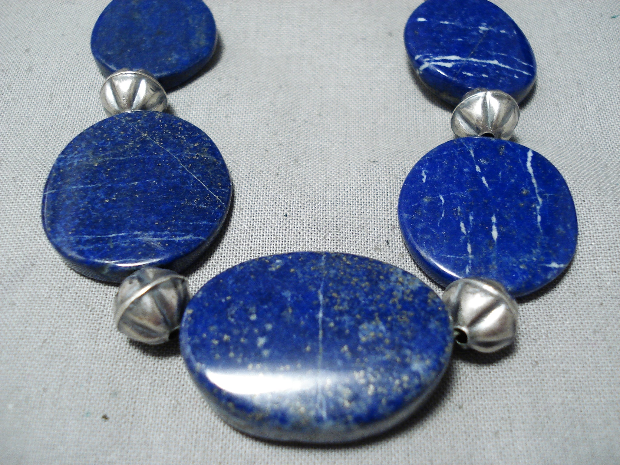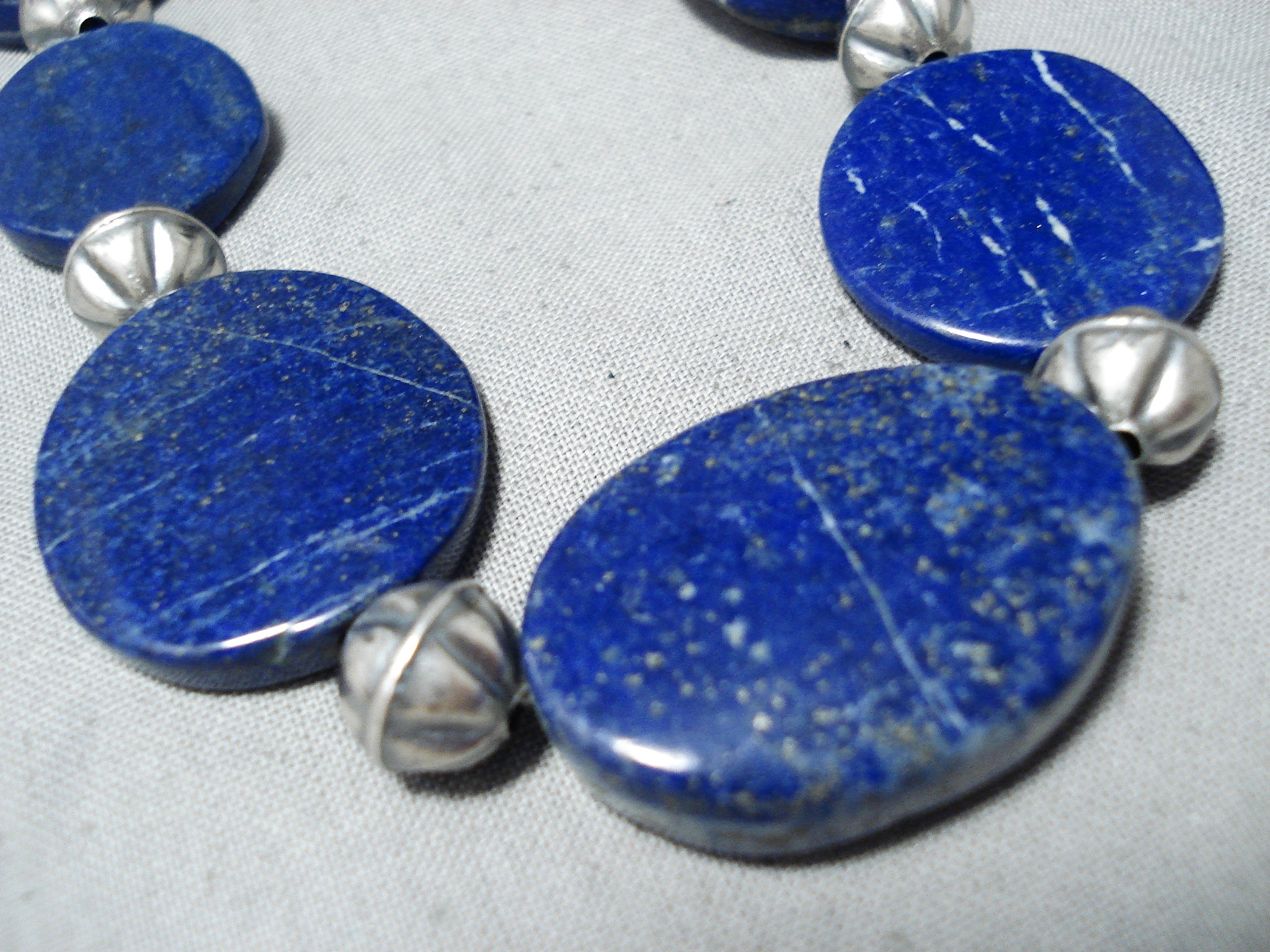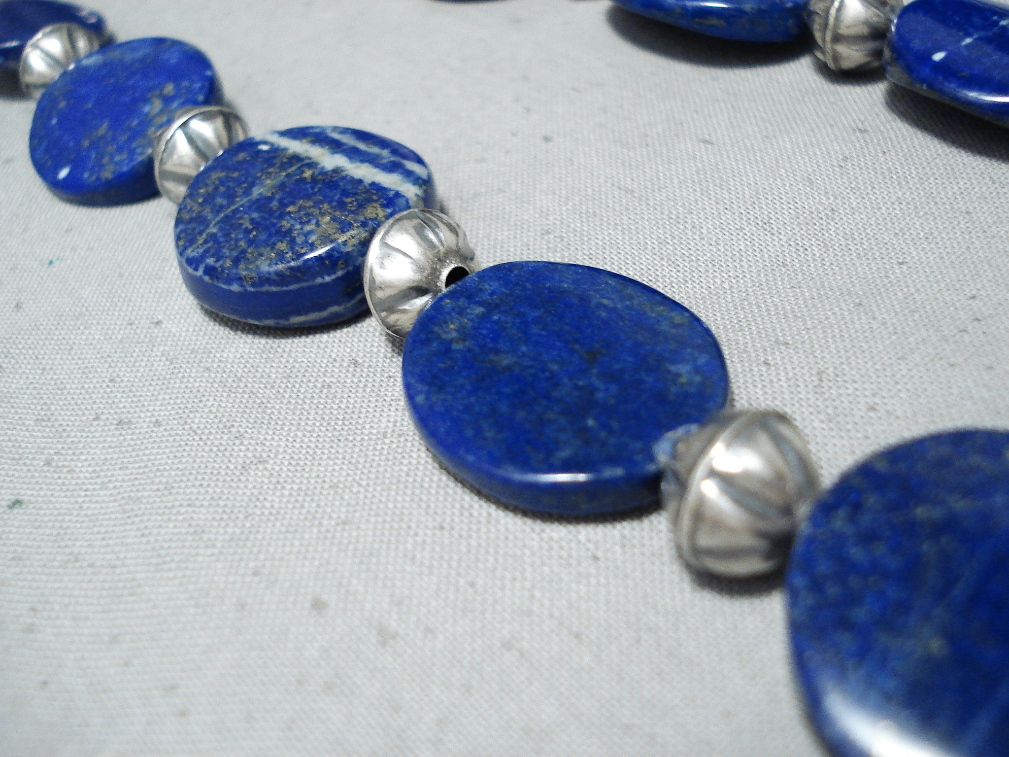 Up for sale is this marvelous Navajo necklace having graduated flat lapis ovals with handcarved round silver hogan beads in between and a handmade silver hook and eye clasp! Absolutely Stunning! The largest lapis measures about 1-1/8" x 3/4". Silver beads measure around 3/8" x 3/8". Sterling silver. The length of the necklace measures around 22". Sturdy 84 grams.