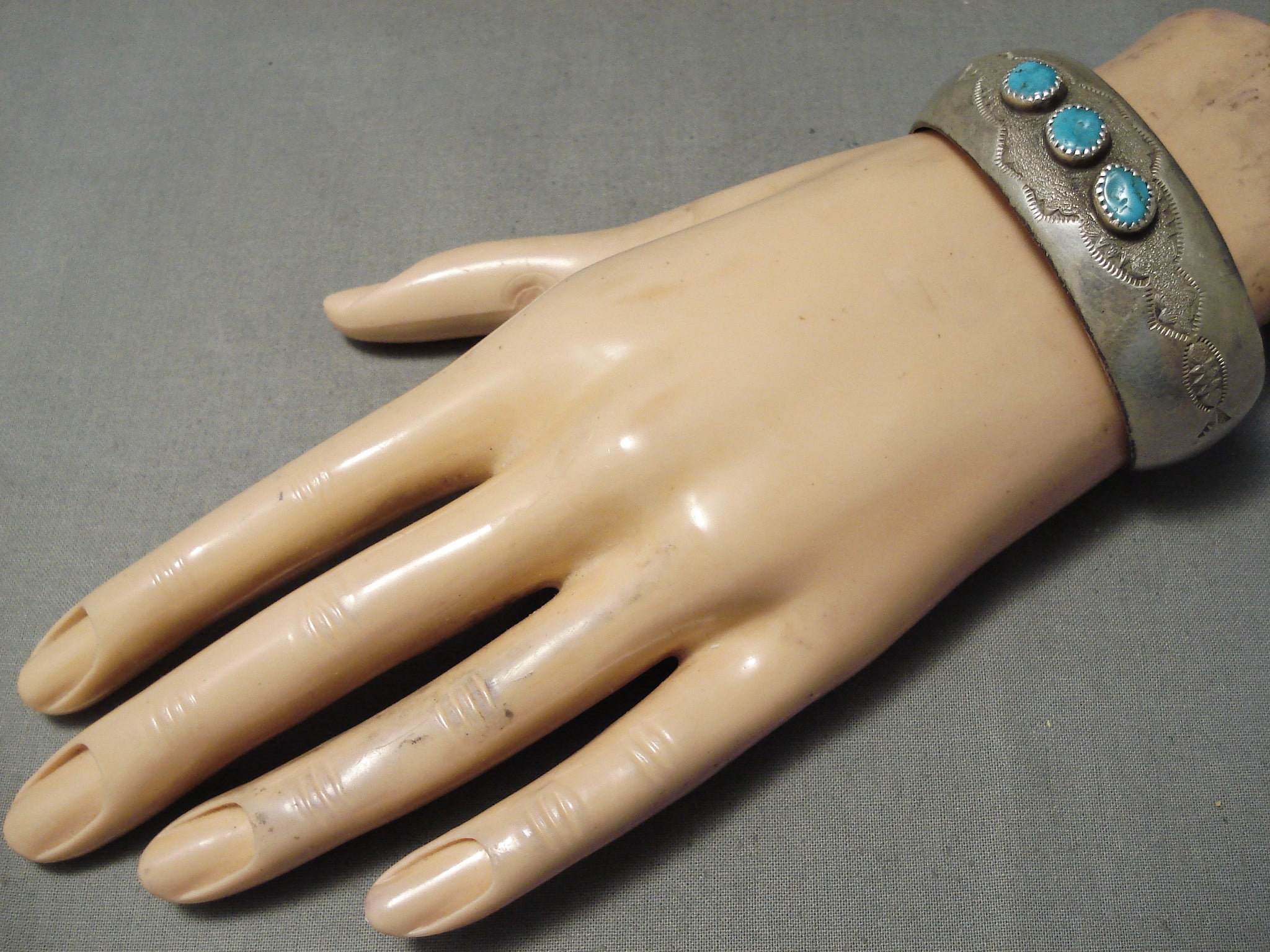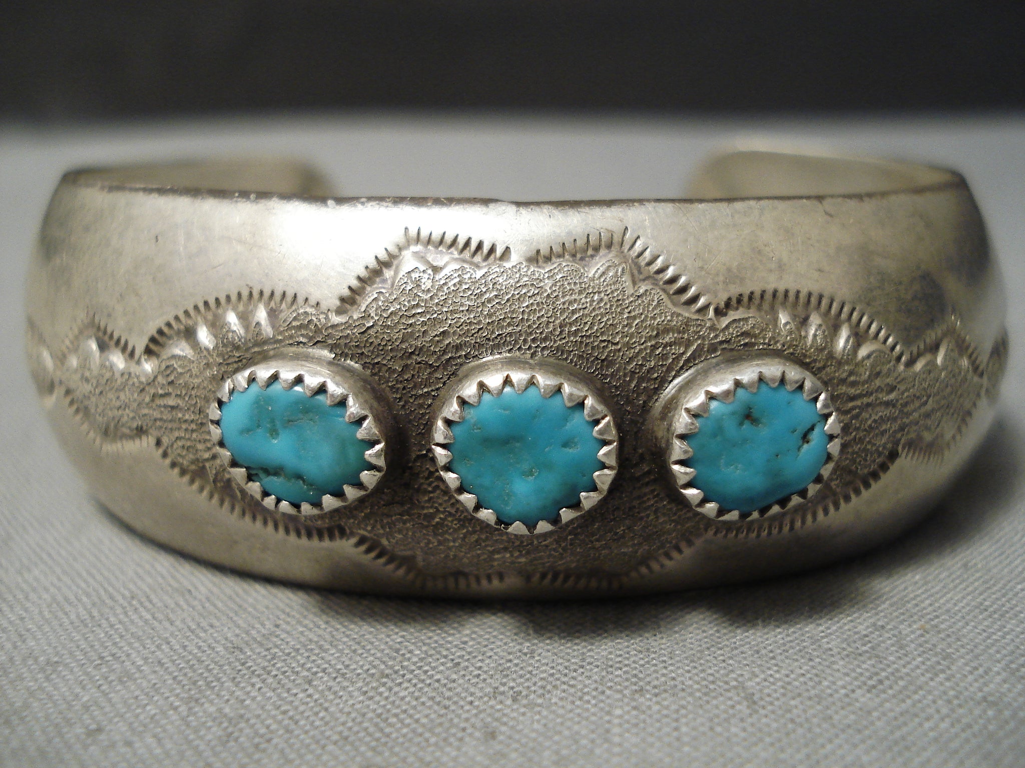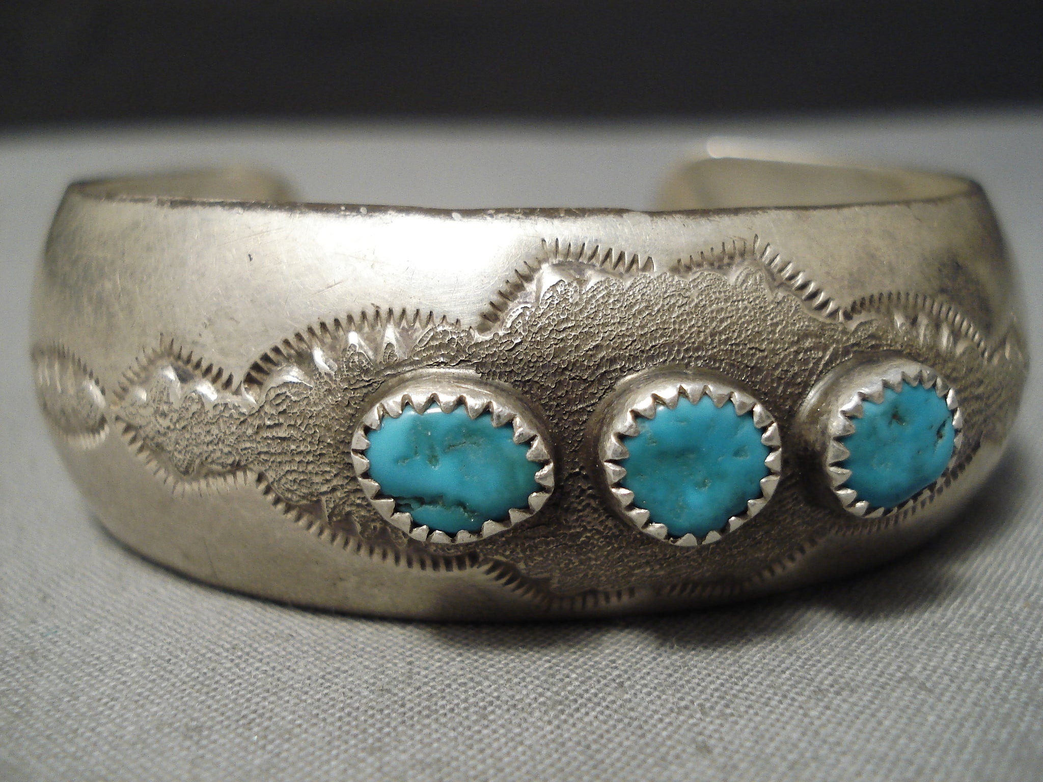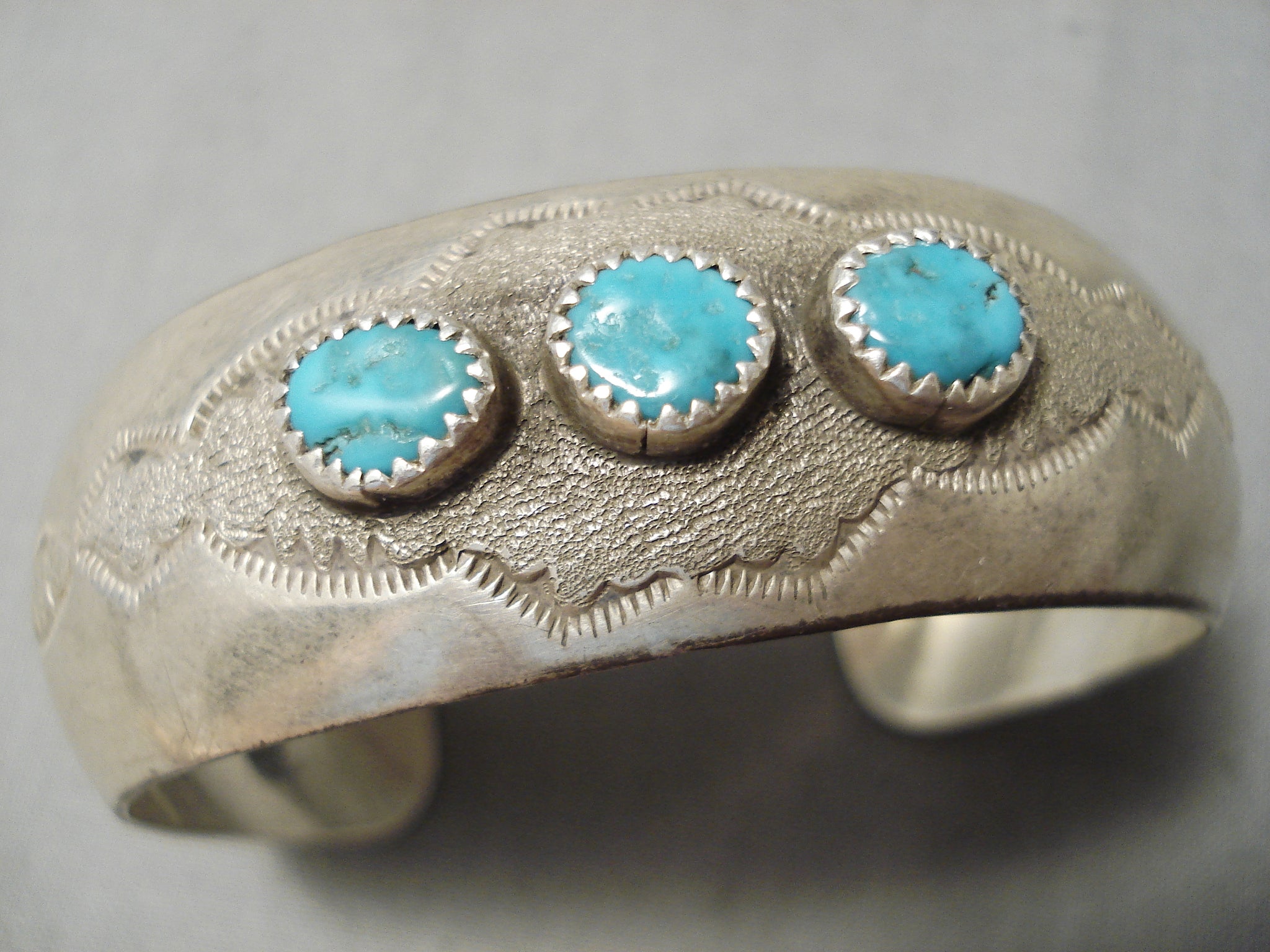 Incredible Vintage Native American Navajo 3 Turquoise Sterling Silver Bracelet Old Cuff
