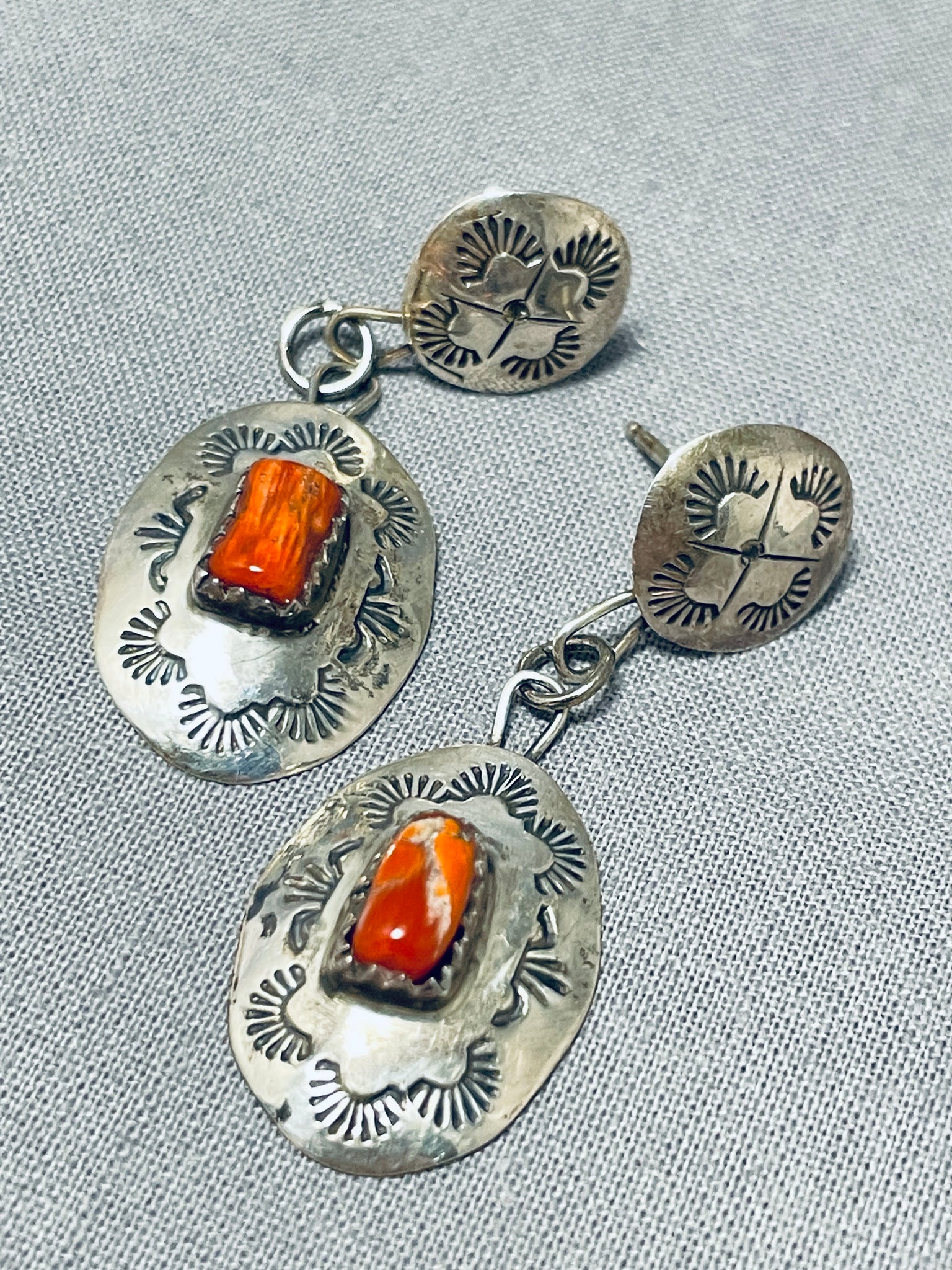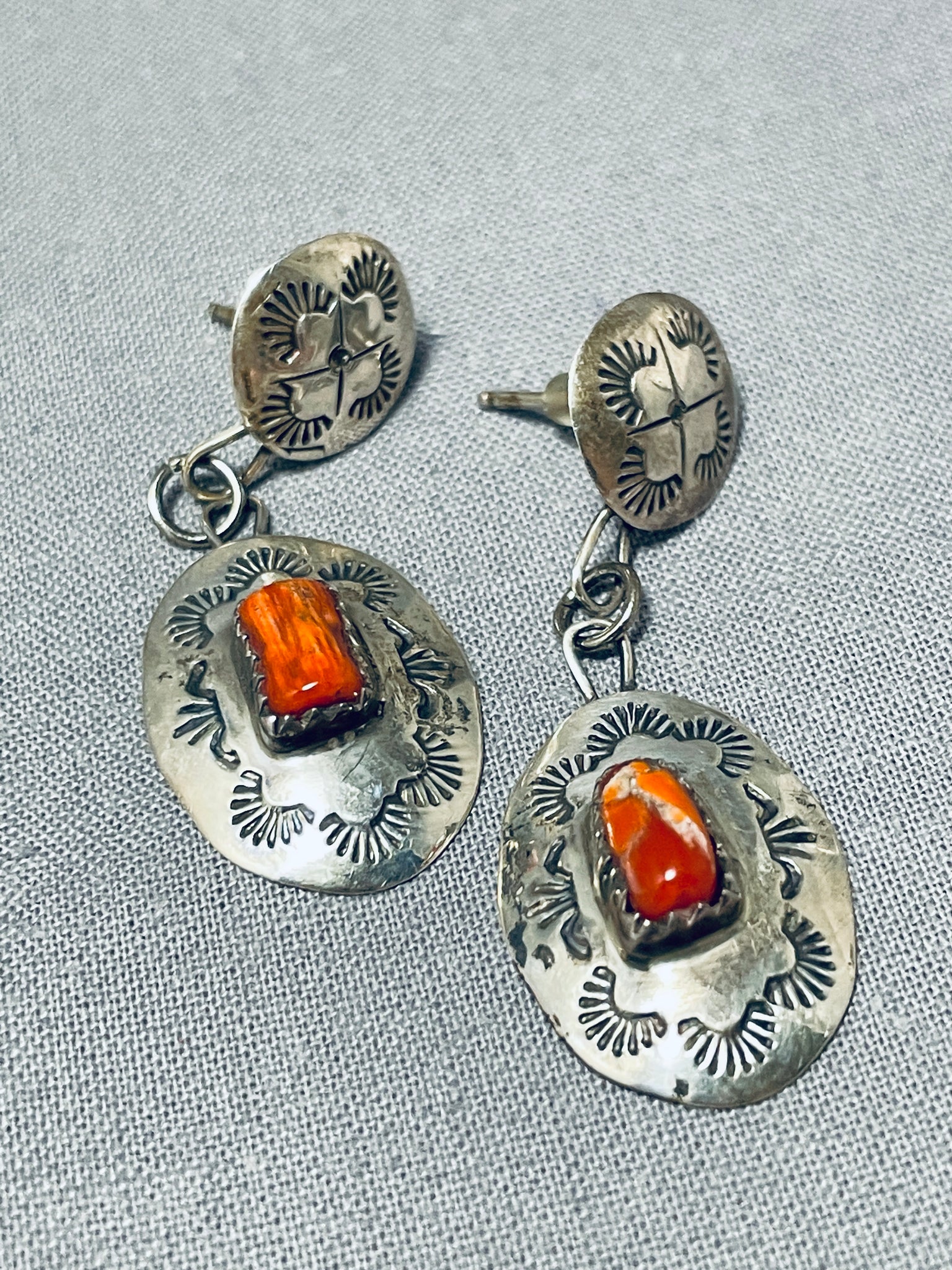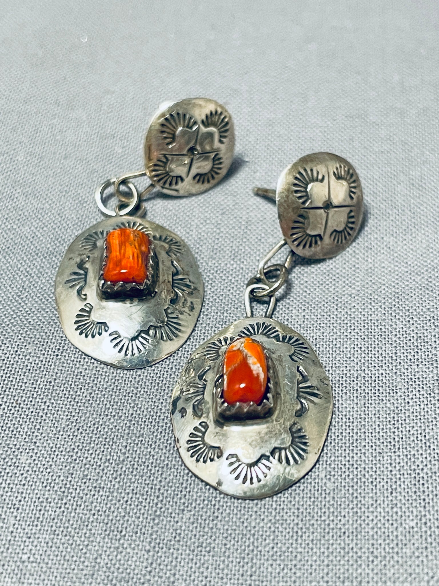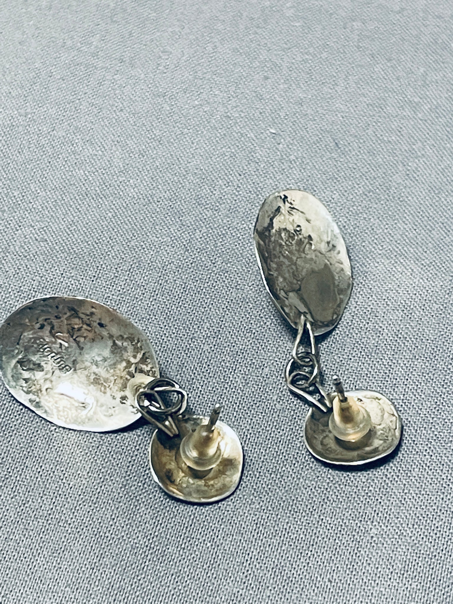 Incredible Vintage Native American Navajo Coarl Sterling Silver Earrings
