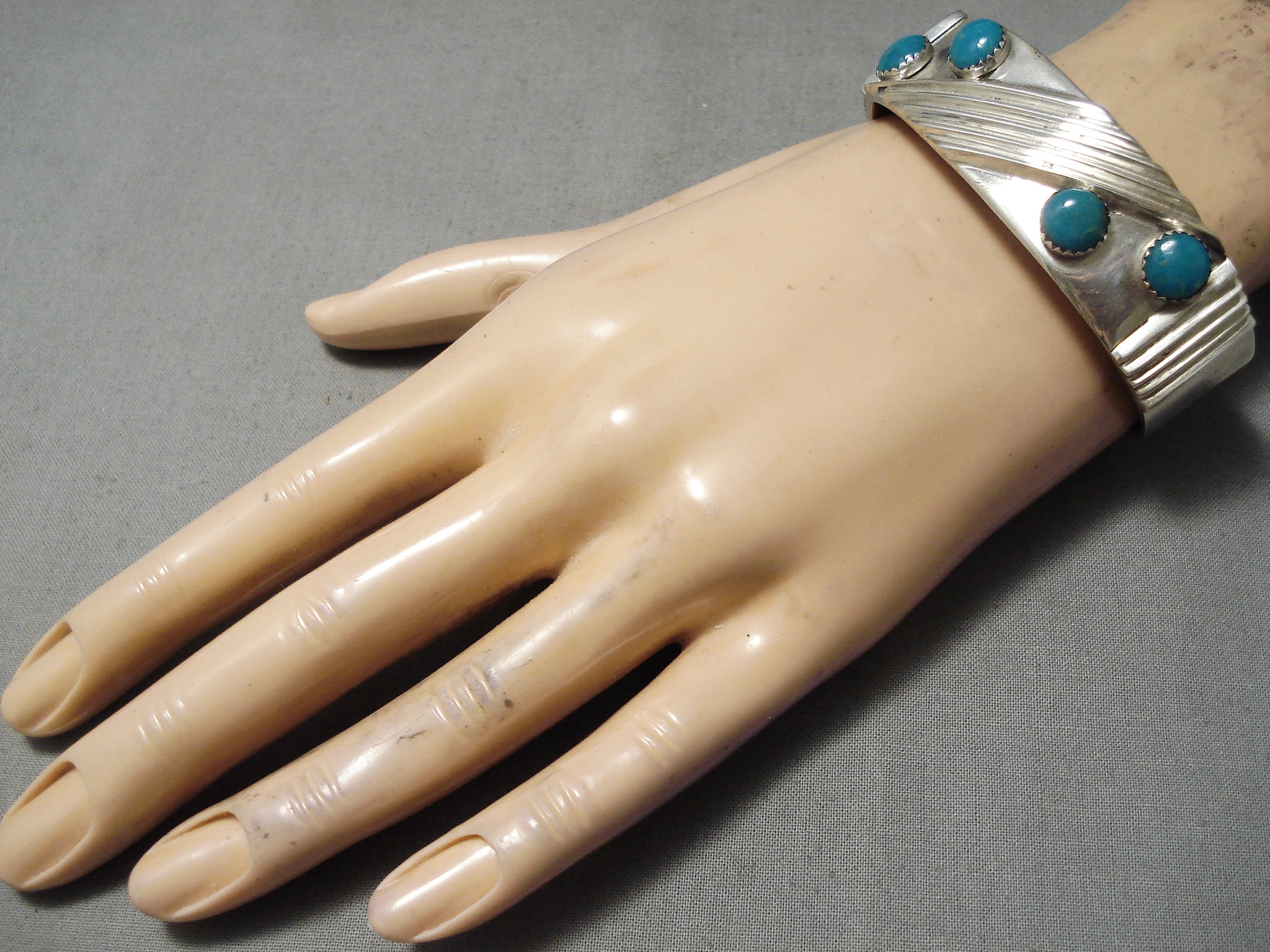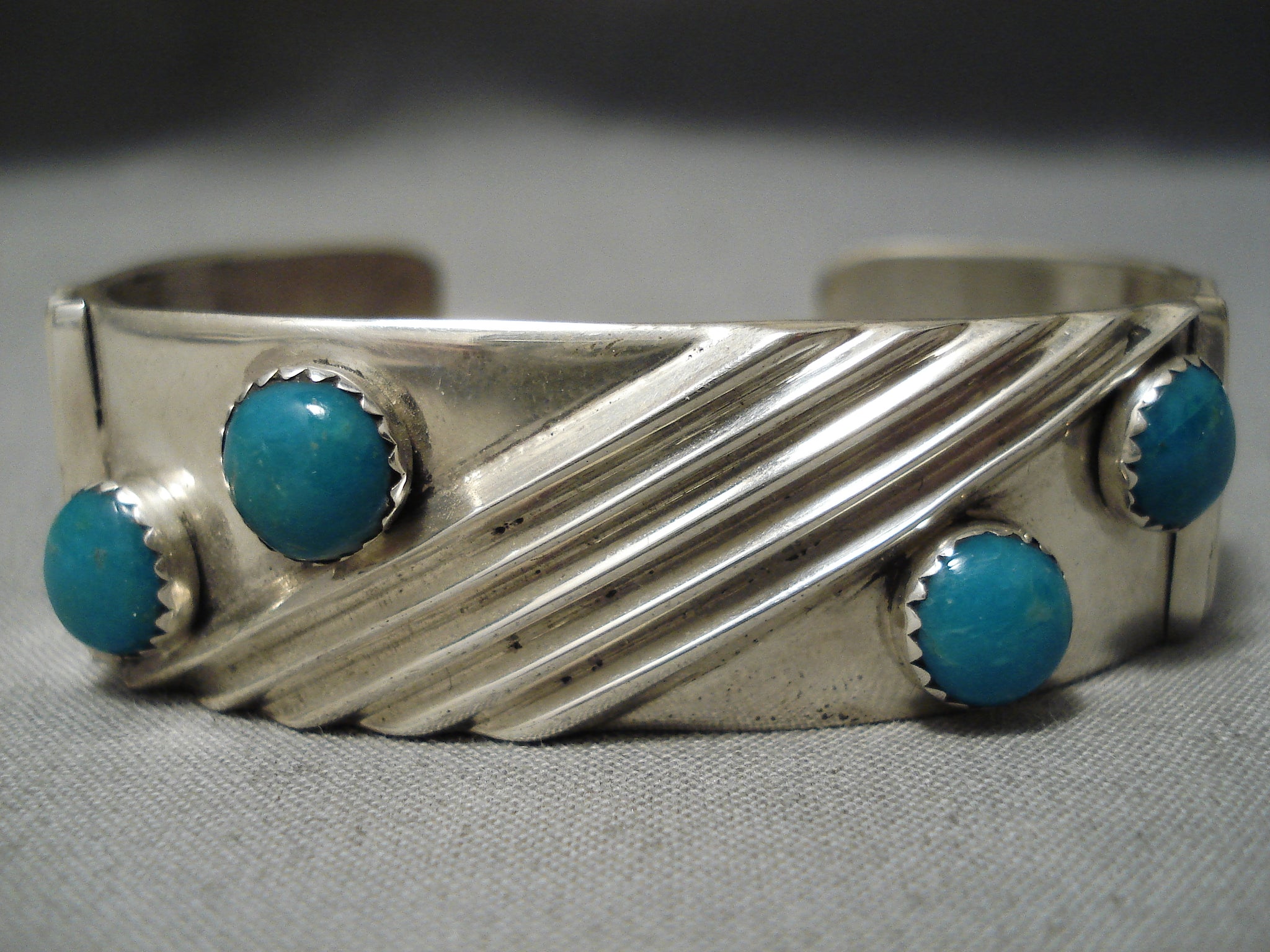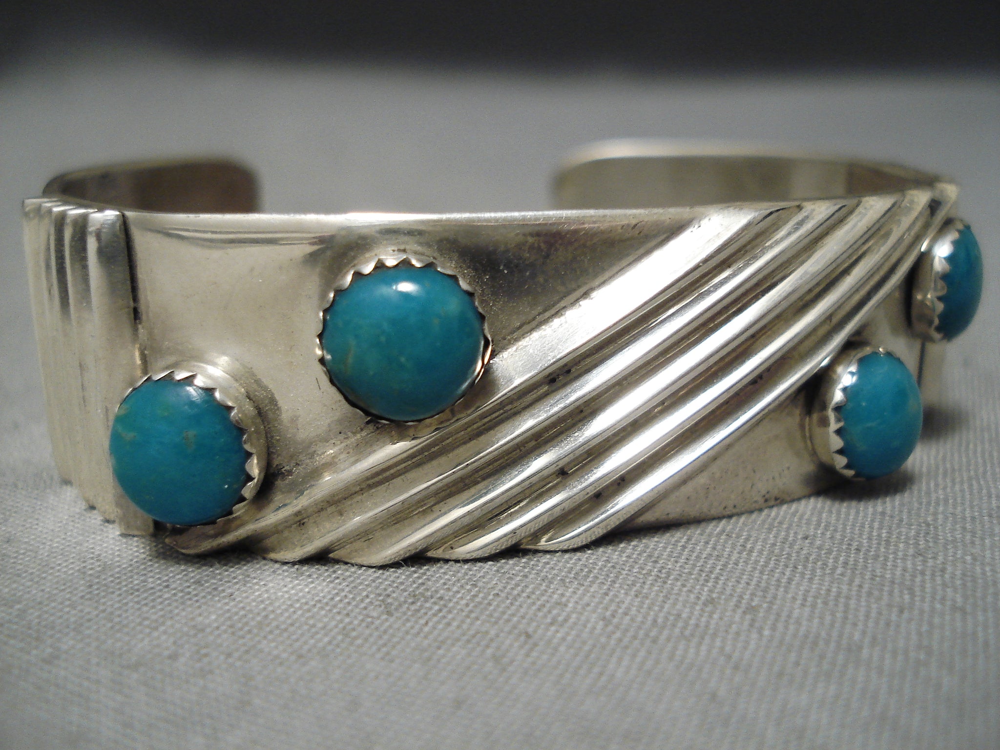 Incredible Vintage Native American Navajo Domed Turquoise Sterling Silver Oblique Bracelet