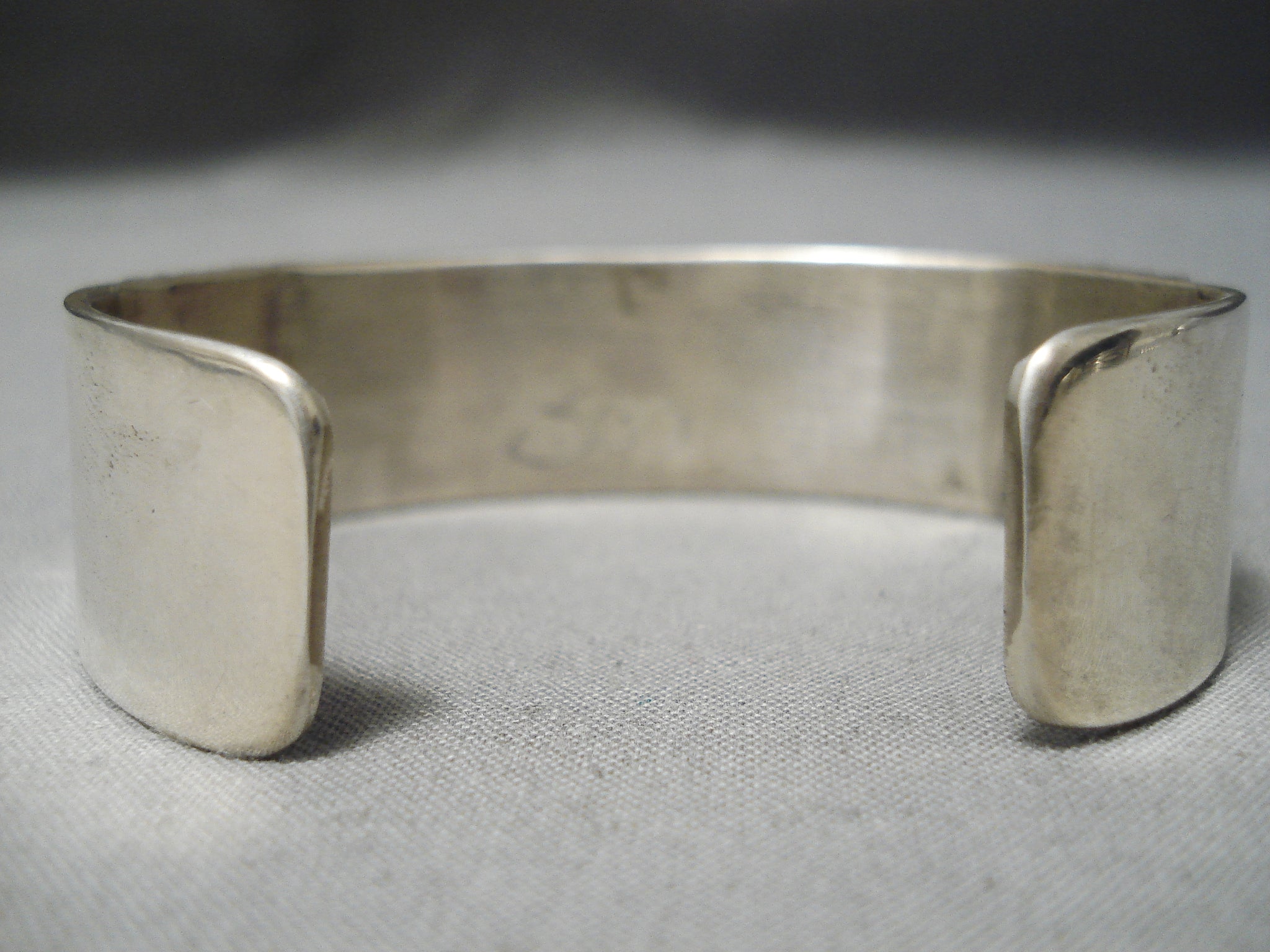 An impressive vintage Navajo silver bracelet. Deep dimensional diagonals separate the four bright green oval turquoise stones – 2 diagonally set at either side. And then the artist framed this beautiful arrangement with stations of deep verticals at either side. The stones measure around 5/16" x 5/16". The width of the bracelet measures around 3/4". Signed by Navajo artist, T. Sterling silver, marked. The inside end to end measures around 5-3/4" with an additional 1-1/8" gap. Sturdy 58 grams.