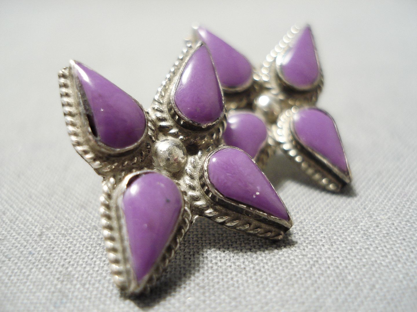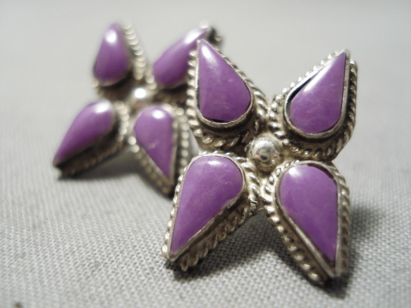 This is an incredible vintage Navajo silver pair of earrings. Petals of pretty purple sugulite reach out to the four corners of these post pierced earrings that measure about ¾” x ½”. Sterling silver. The earrings weigh around 6 grams.